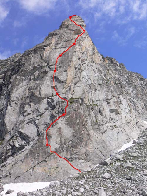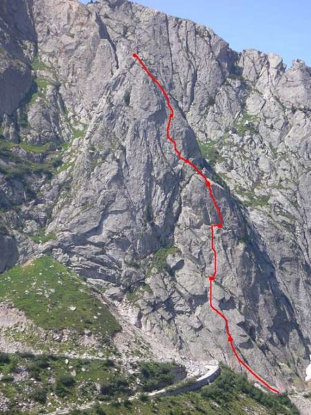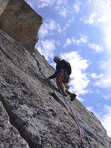 Bergell/Albigna: Bio Pfeiler, 2810 m, "Via Classica", 5c+ und Spazzacaleira "Via Felice", 6a. Fantstische Routen im bestem Granit. Überwiegend Rißkletterei, in der 2.SL der Felice gibt's auch delikate Plattenstellen.