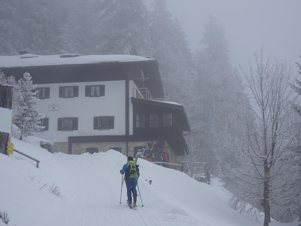 Vom Waldparkplatz oberhalb des Gasthauses oder Hotels "Feuriger Tatzelwurm" geht's zunächst durch den Wald, Verhältnisse auch dort im Moment prächtig. Anschließend könnte man schon bei der ersten Lichtung rechts hinauf gehen, um so oben wieder auf den Forstweg zu treffen. Wir gingen geradeaus weiter, an der unbewirtschafteten Schoißeralm vorbei, dann aber zwingend am gelben Wegweiser nach rechts den längeren Weg zum Brünnsteinhaus wählen (Der direkte und kürzere Weg geradeaus ist der Sommerweg und eignet sich nicht für Skitourengeher!). An einer späteren Gabelung der Forststraße links halten, so kommt man zur Seelachenalm. An dieser links vorbei, 10 Minuten später macht der Hauptspurenstrang eine Kurve nach links hinauf zur Brünnsteinschanze. Wir gehen hier geradeaus bzw leicht rechts und besteigen einen kleineren Buckel am Waldrand. Bei äußerst nebligen Verhältnissen war dies von der Orientierung her etwas heikel. Aber hinter dem Buckel zeigt einem ein Skitourenschild des DAV und kurz darauf ein weiterer Wegweiser, dass man richtig ist. Bei dem Wegweiser geht's etwas hakelig und eng nach unten. Kurze Zeit später fahren wir mit den Fellen nach links ab in eine Senke hinein. Von dort immer die östliche Richtung beibehalten bis man eine knappe halbe Stunde später am Ende ein paar Höhenmeter abfährt und so die Rodelbahn erreicht, die von der anderen Seite, von Mühlau, heraufkommt. Nach links 200 Meter rauf und man steht vor dem Brünnsteinhaus mit gemütlicher Stuben und netten Wirtsleuten.