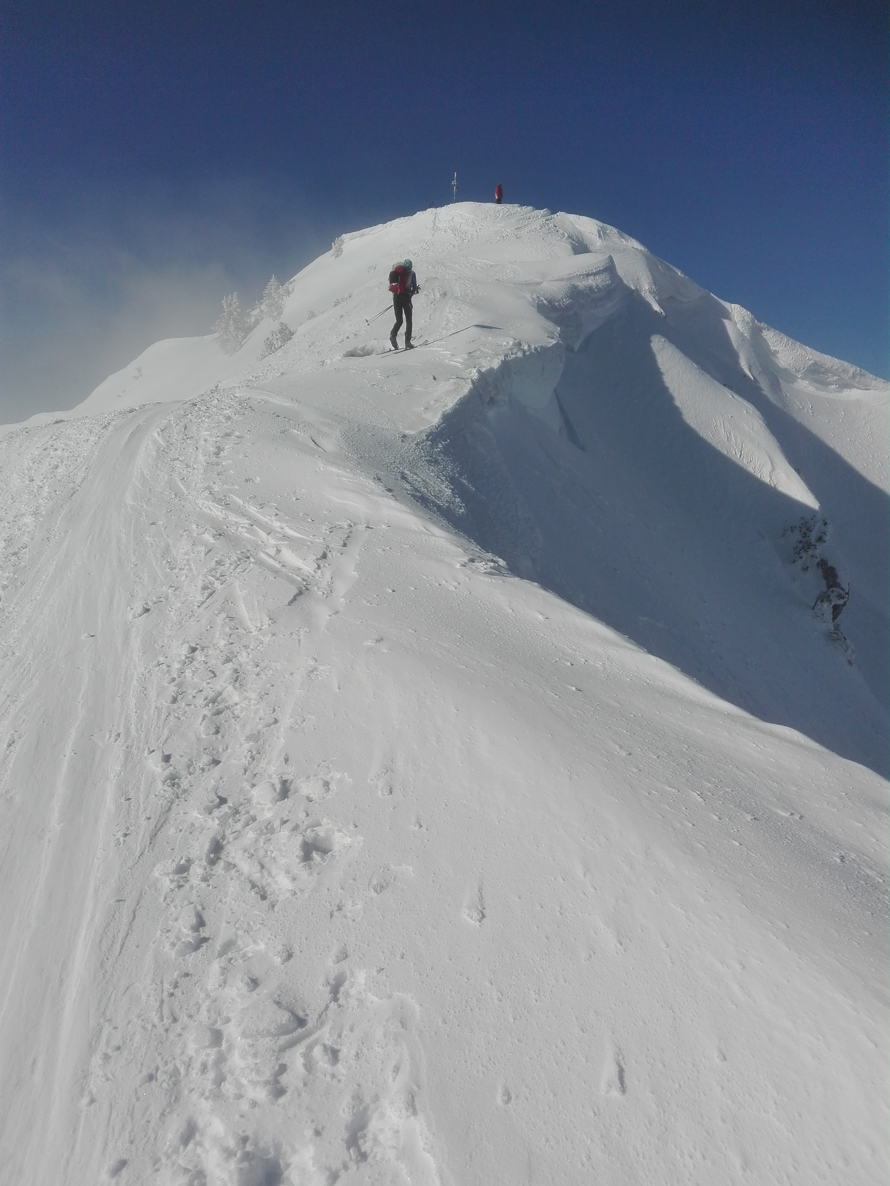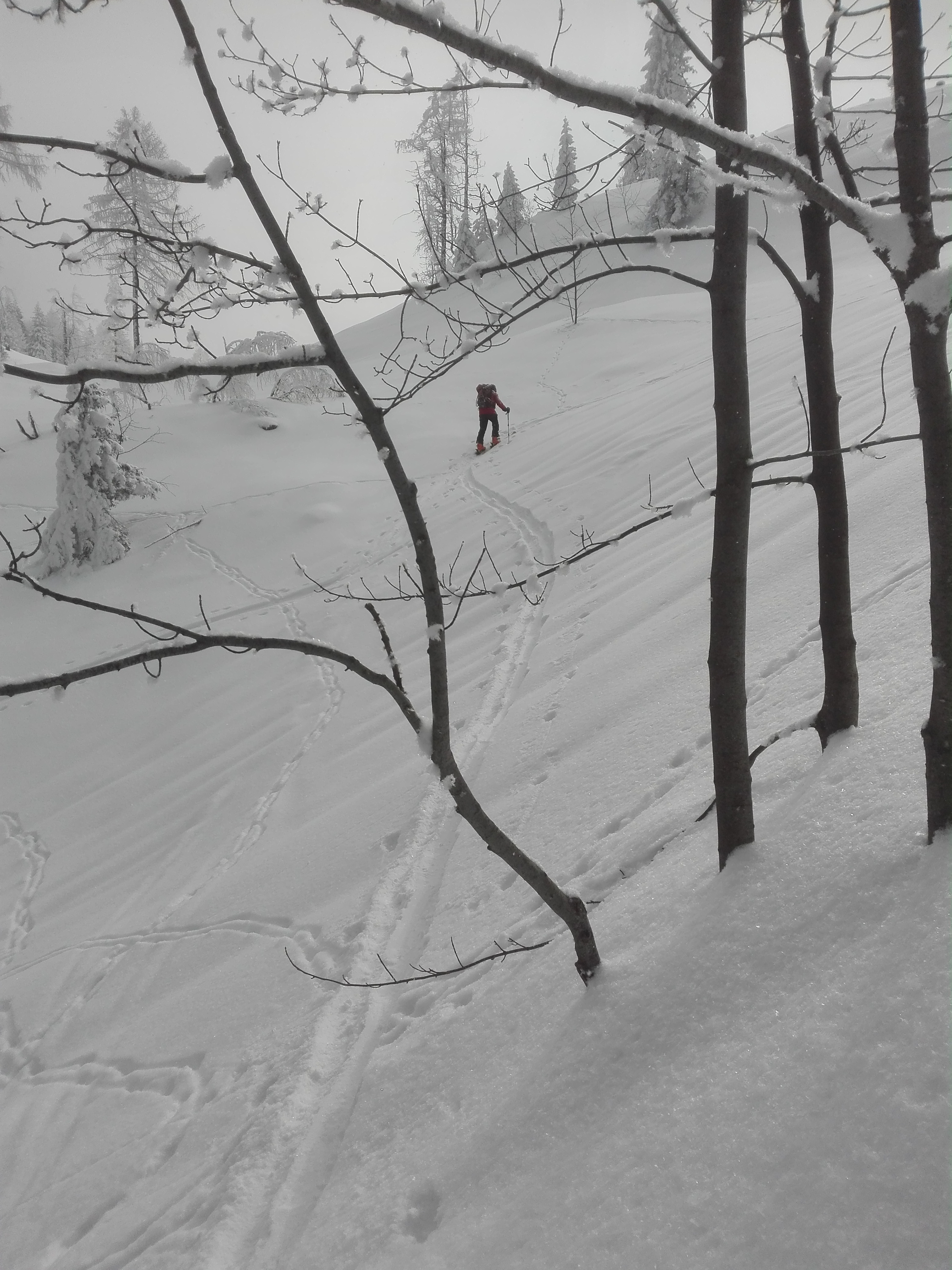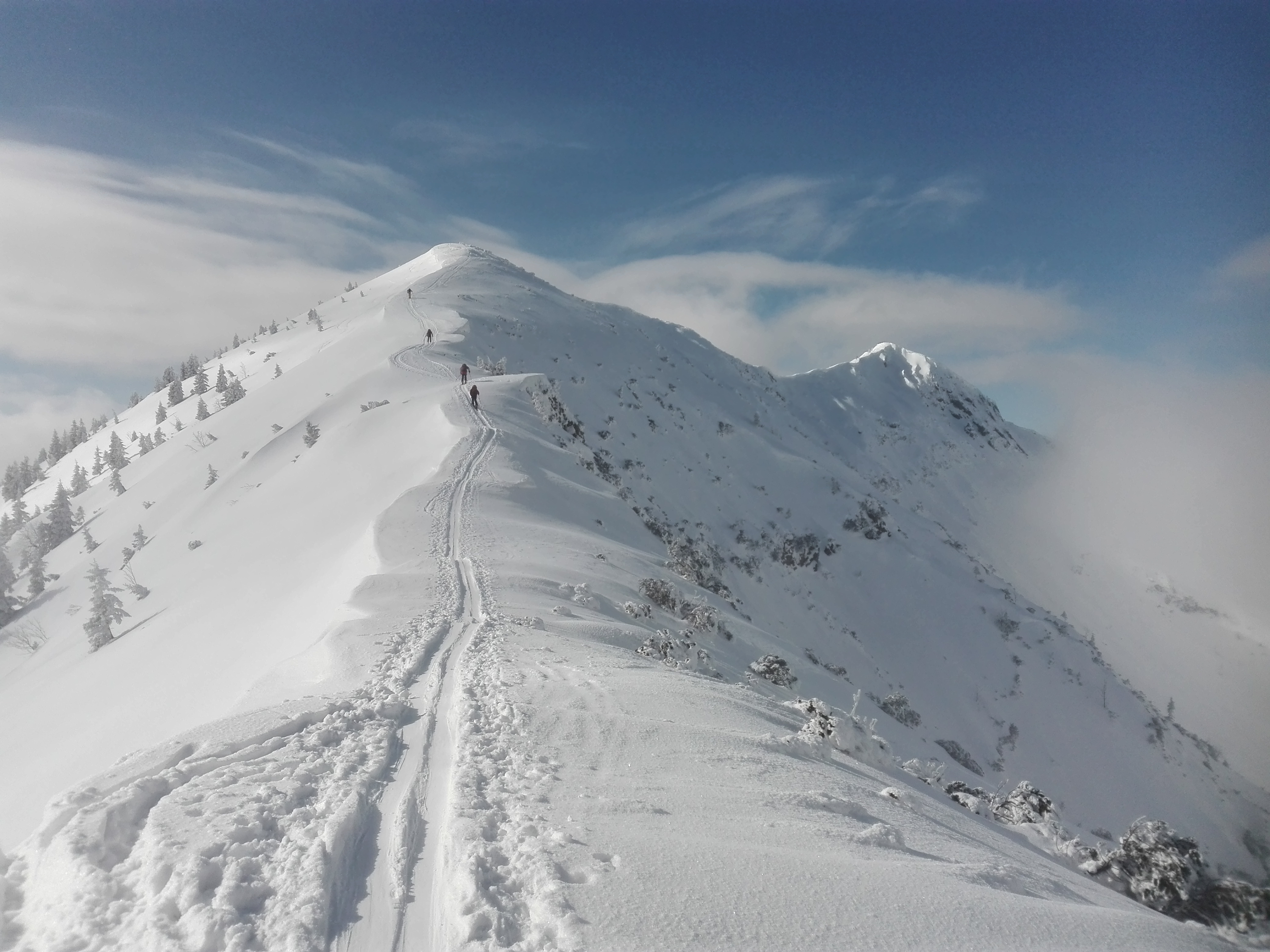 Tourenverhältnisse: Vom Parkplatz über Baumoosalm und Seeonalm zum Sattel unterhalb des Unterberger Joch und den Steilhang hoch zum Grat. Über diesen zum Gipfel. Abfahrt vom Gipfel nach Norden und durch den "Stopselzieher" zur Rosengasse. Von dort entlang der Straße zum Ausgangspunkt. Im Aufstieg ein Wintermärchen mit teilweise Sonne, teilweise Nebel. Am Gipfelgrat und Gipfel sonnig und kaum Wind, bei der Abfahrt im Gipfelhang wieder neblig, darunter Sicht. Durch den Nebel und die vielen spuren war der Gipfelhang nicht besonders gut zu fahren, im Stopselzieher relativ hart, unterhalb Pulverschnee. Die Strecke von der Rosengasse zum Waldparkplatz an der Straße entlang ist nicht empfehlenswert(lieber wieder über die Seeon- und Baumoosalm zurück, auch wenn da ca. 100Hm Gegenanstieg dabei sind).