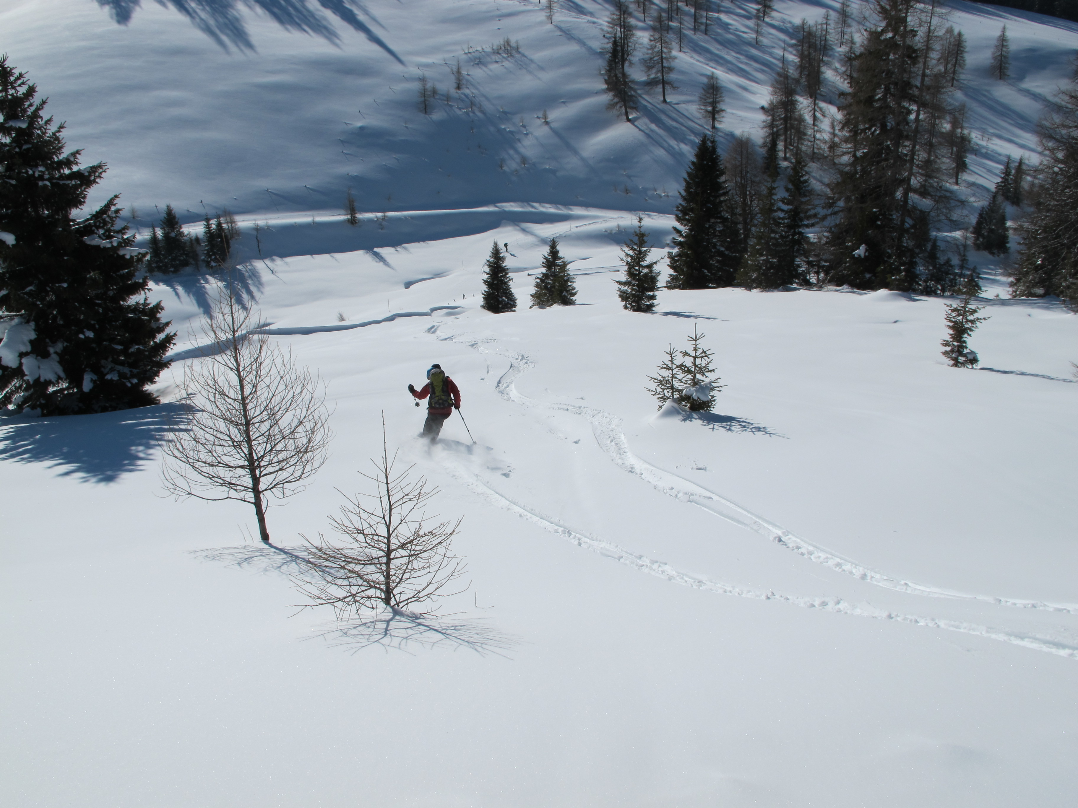 Überwiegend sehr schöner Pulverschnee, zwischendrin auch ein paar Triebschneelinsen, also windgepresster Schnee, aber überwiegend sehr fein zum Fahren. Am Kamm allerdings starker Windeinfluss, wobei man hier eh meist nur entlangwandert.