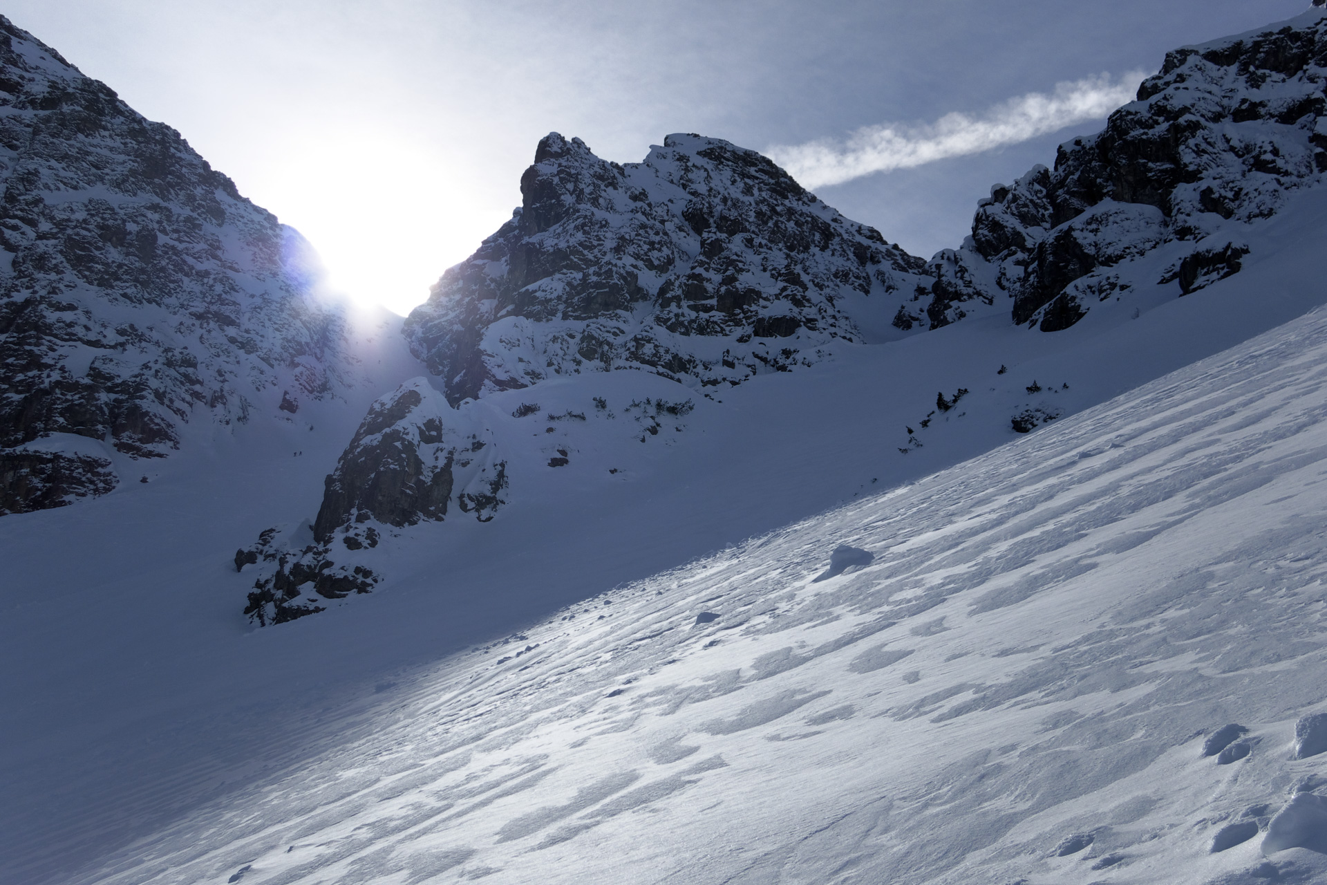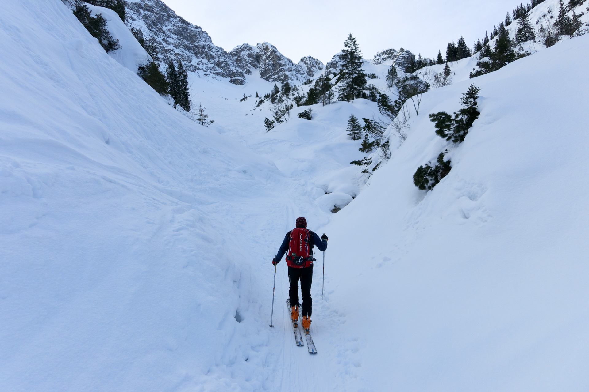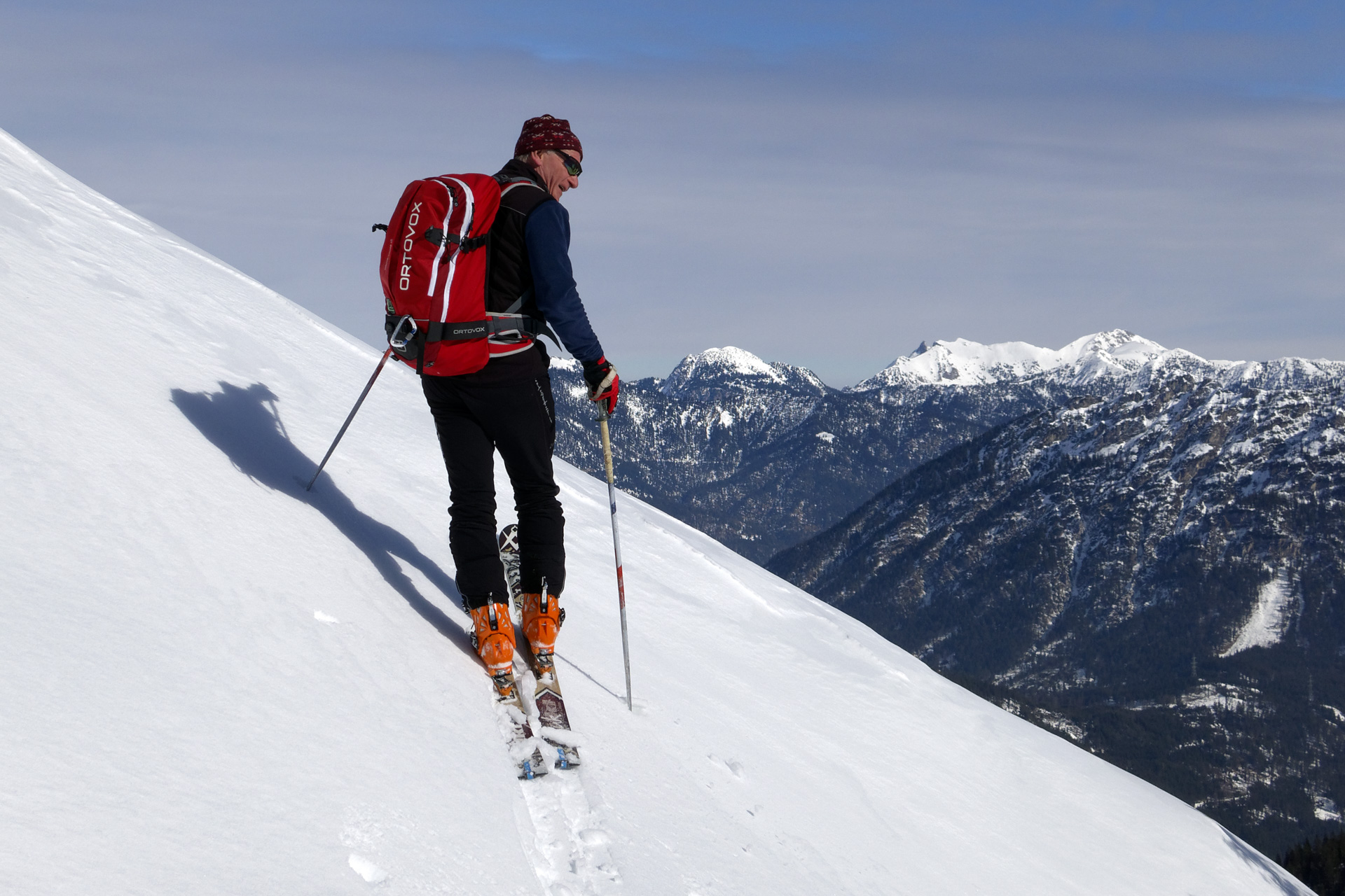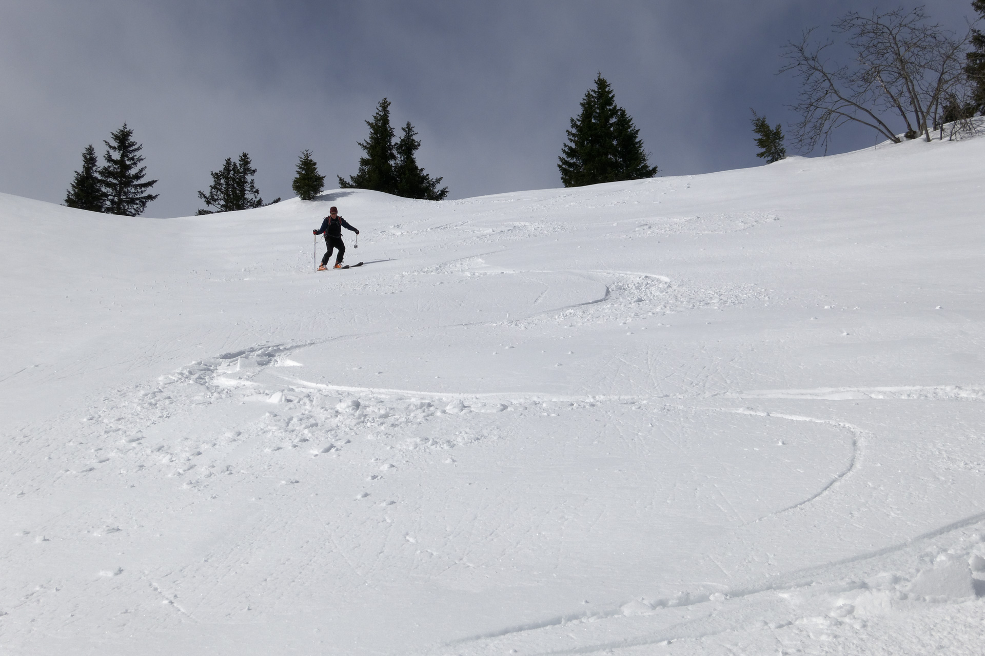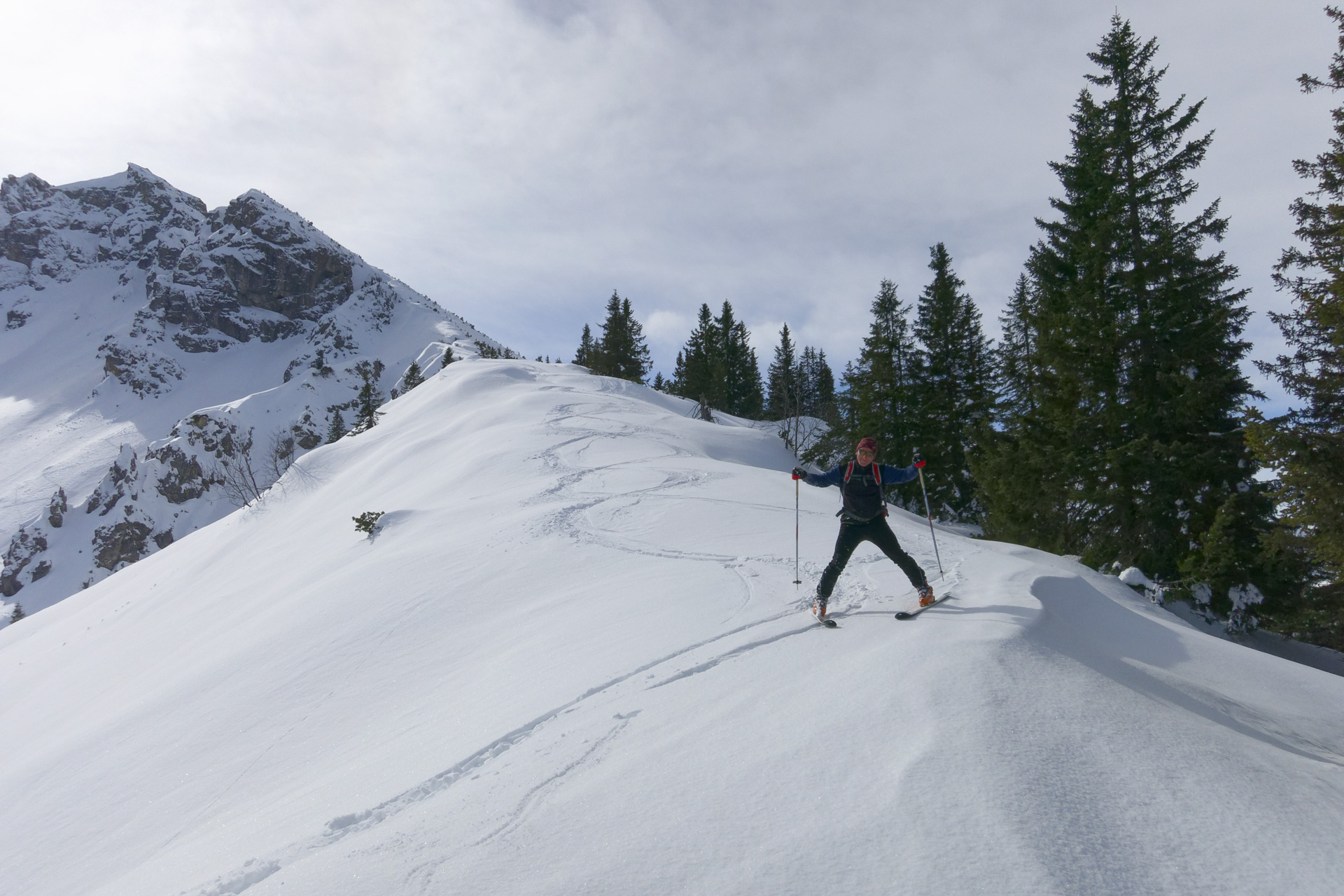 Thanellerkar, aber nicht in die Scharte Richtung Gipfel, sondern rechts hoch. Über eine Wechte auf einen schön zu fahrenden Grat, weil wir uns besseren Schnee in der Sonne erhofft haben (was teilweise auch gestimmt hat). Im Kar harter Windharsch, etwas Pulver. 3er über 1800m sicher gerechtfertigt...