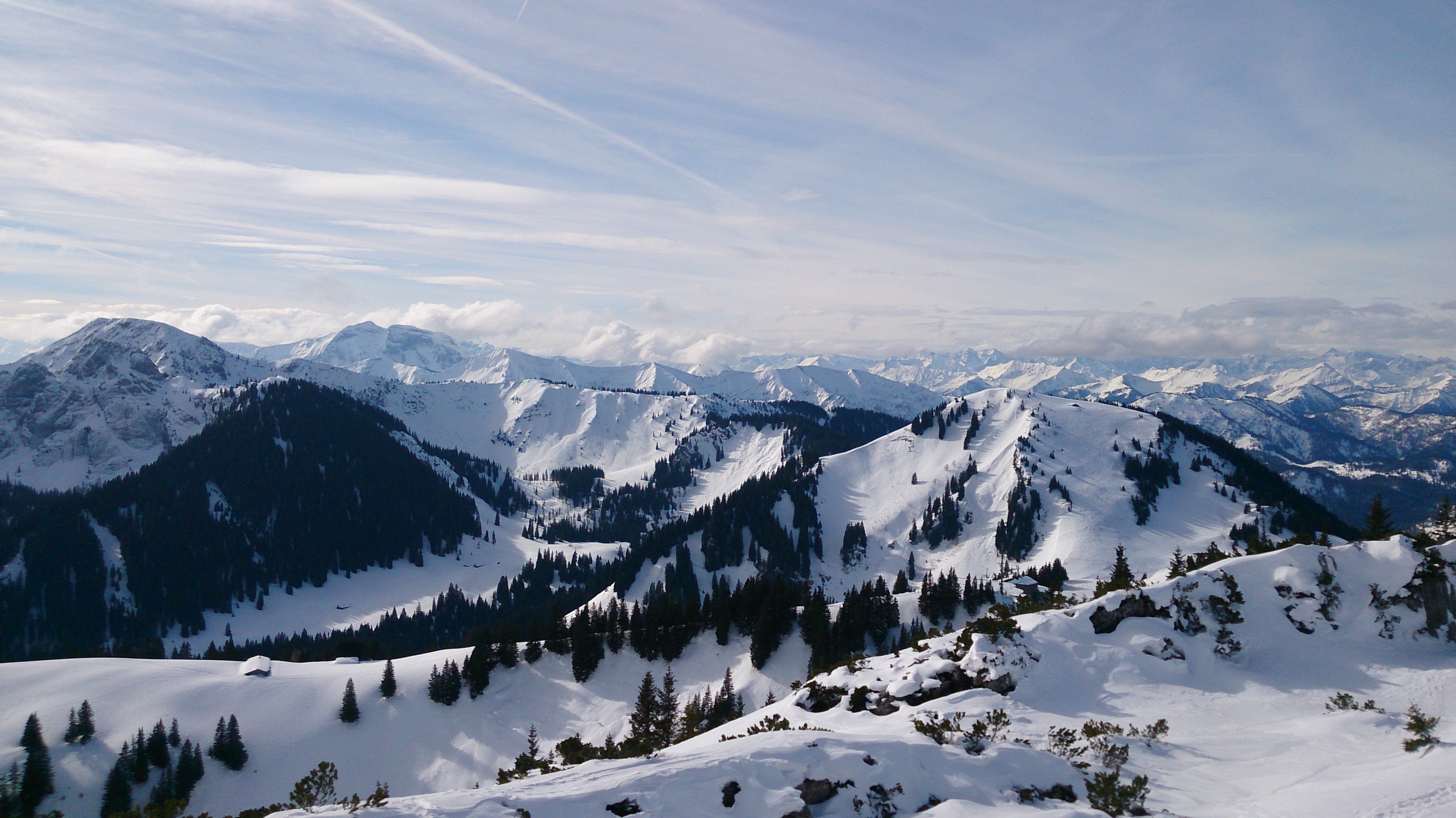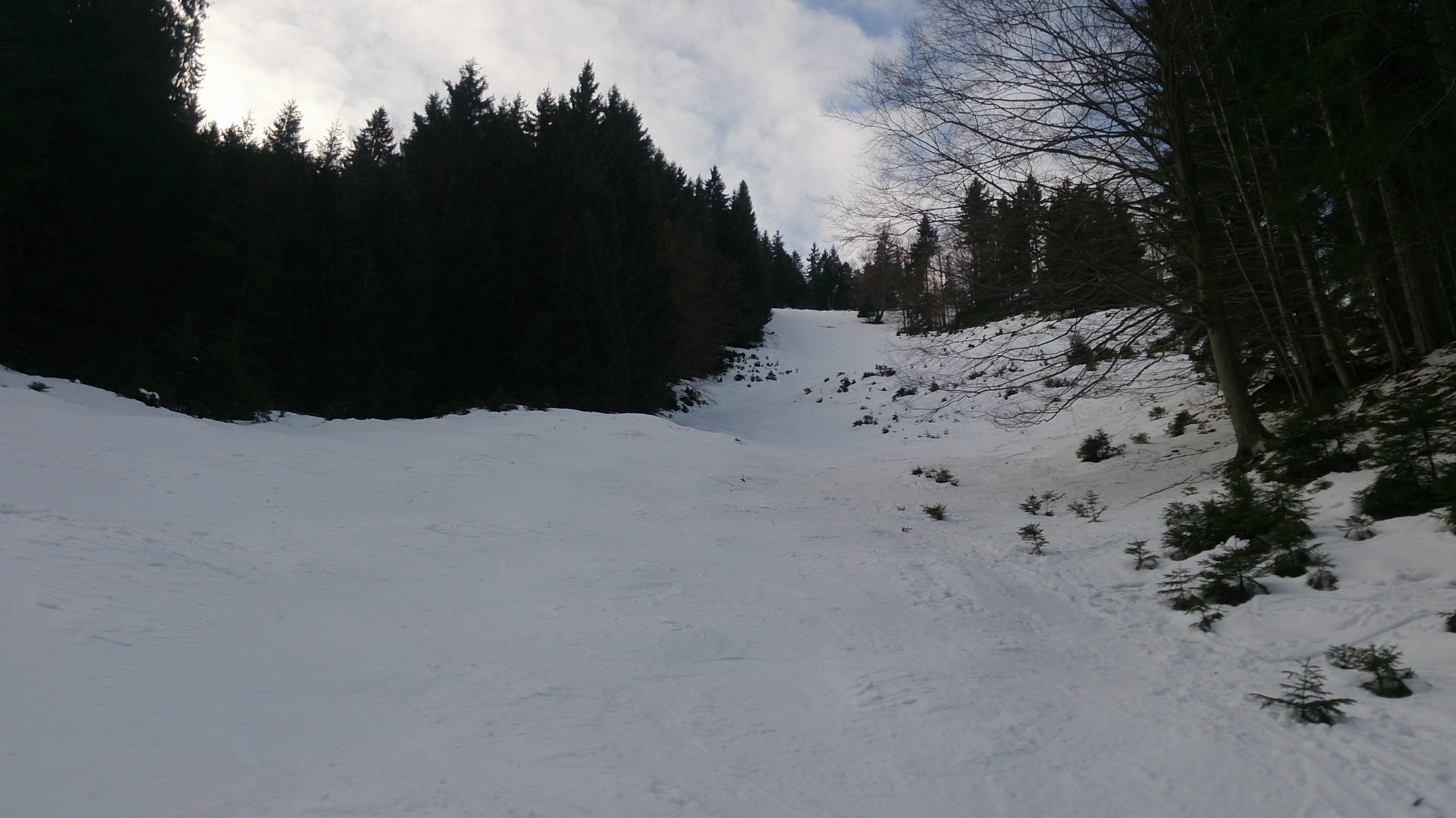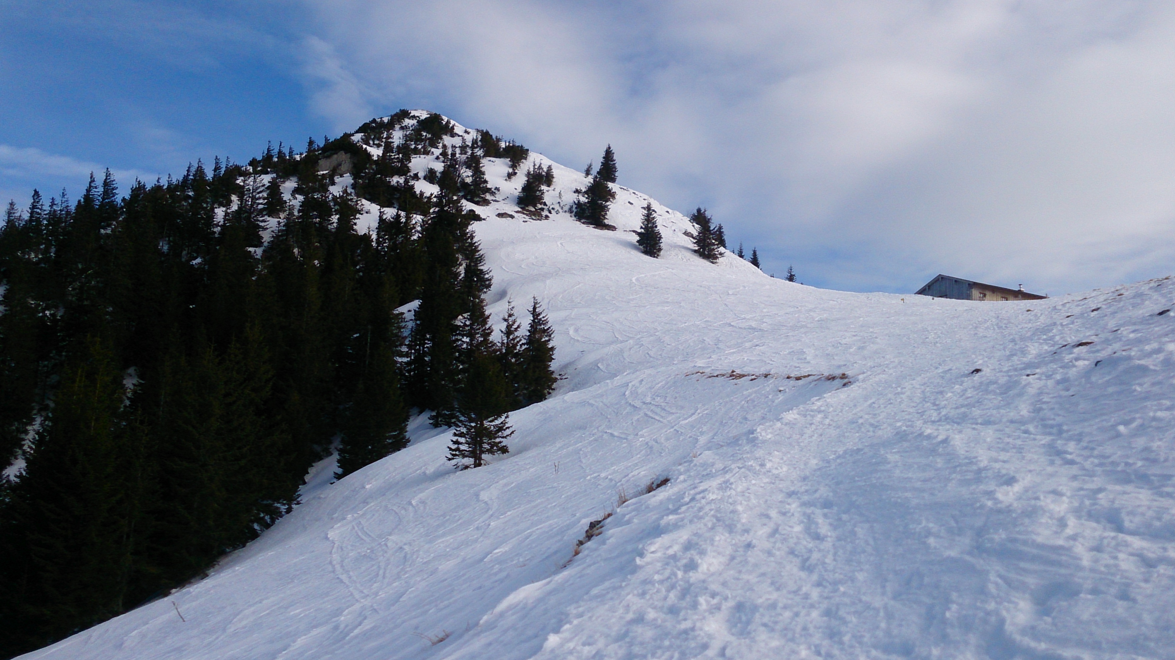 Tourenverhältnisse: genug Schnee von unten weg; abseits des eingefahrenen (häufig harten) Bereiches meist keine berauschenden Verhältnisse (windgepresst, Harsch oder Bruchharsch)