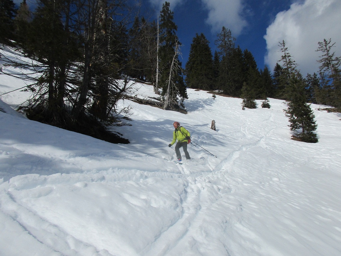 Tourenverhältnisse: Gut / bis Klausboden teils aperer Forstweg / Schnee ab Rohntalalm bis zum Gratverlauf richtig schee sulzig / droben teils tragender Altschnee mit ca. 5 cm Neuschnee darauf / Abfahrt im Großen und Ganzen ganz passabel : haben es schlimmer erwartet