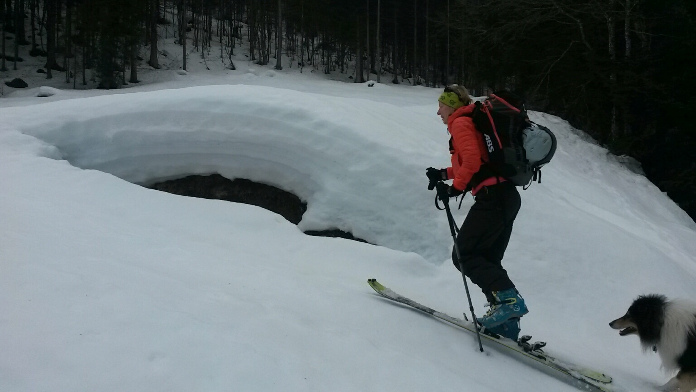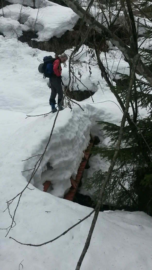 Gefahreneinschätzung: Eher gering, auf steilen Wiesenflanken hat man trotzdem gerne eine Auge. Es gilt zweimal einen Bach auf einem schmalen Steg zu überqueren. Das ist bei einem 60cm breiten Holzbrett mit 120 Schneeauflage durchaus ein eigenes Vergnügen.