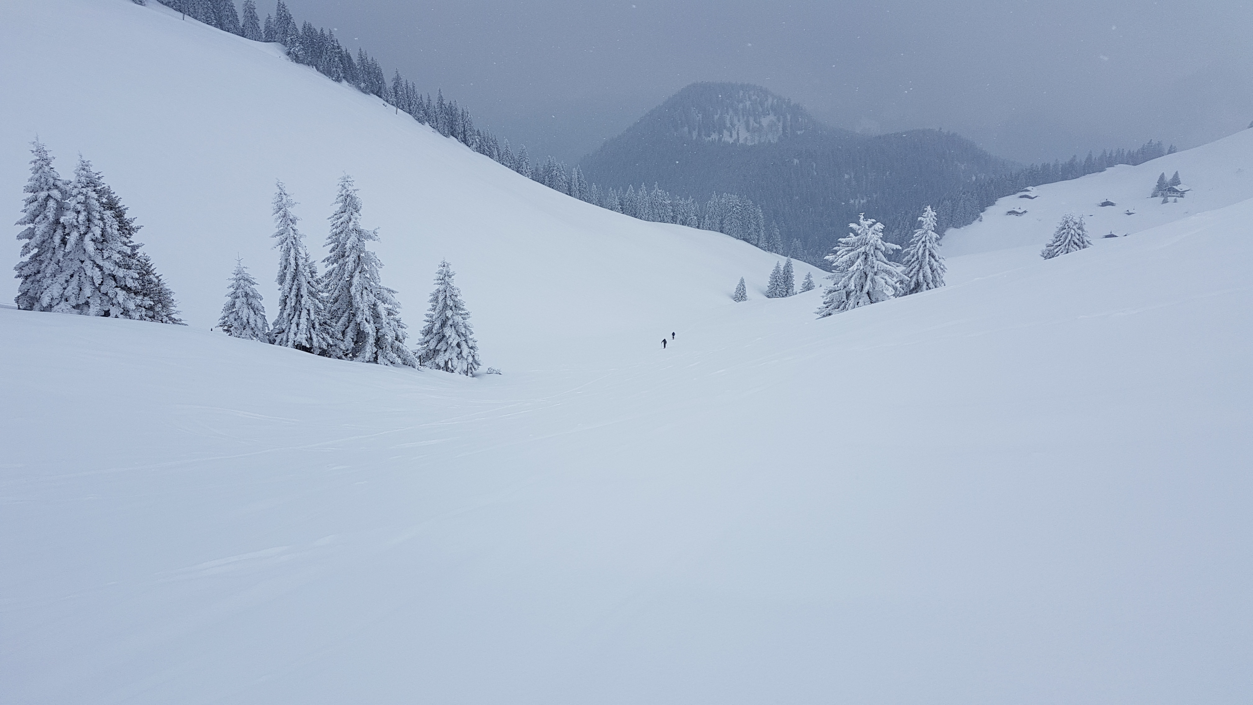 Tourenverhältnisse: ca. 5 cm sehr kalter, sehr pulvriger Neuschnee auf verharschter, im Bereich des ersten Steilhanges auch eisiger Unterlage.