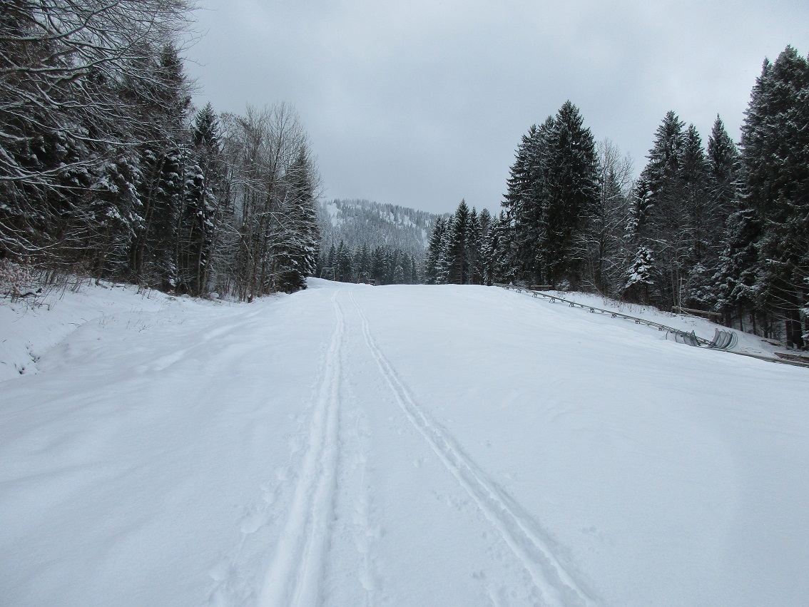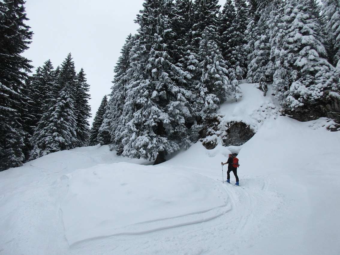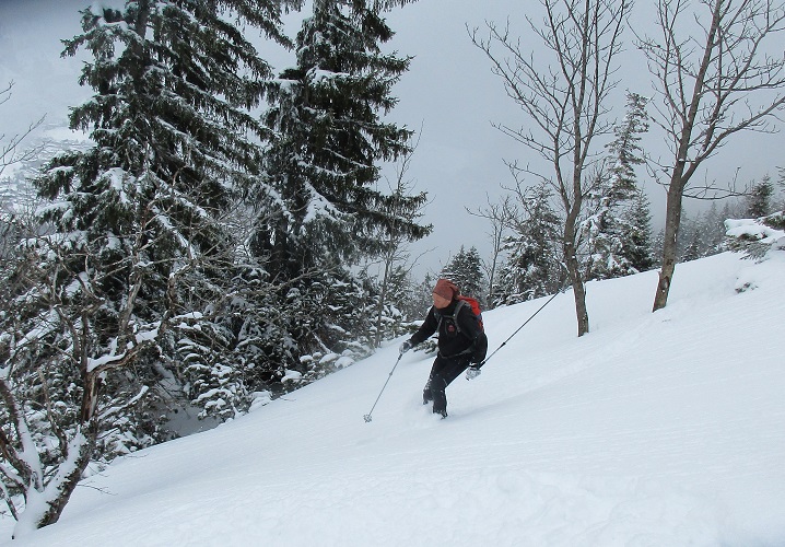Tourenverhältnisse: Sehr gut / Lifte stehen still / 10 - 20 cm frischer Pulverschnee der letzten Nacht / es war noch genug Platz für eigene Spuren / in Talnähe wurde der Schnee schon leicht schwerer