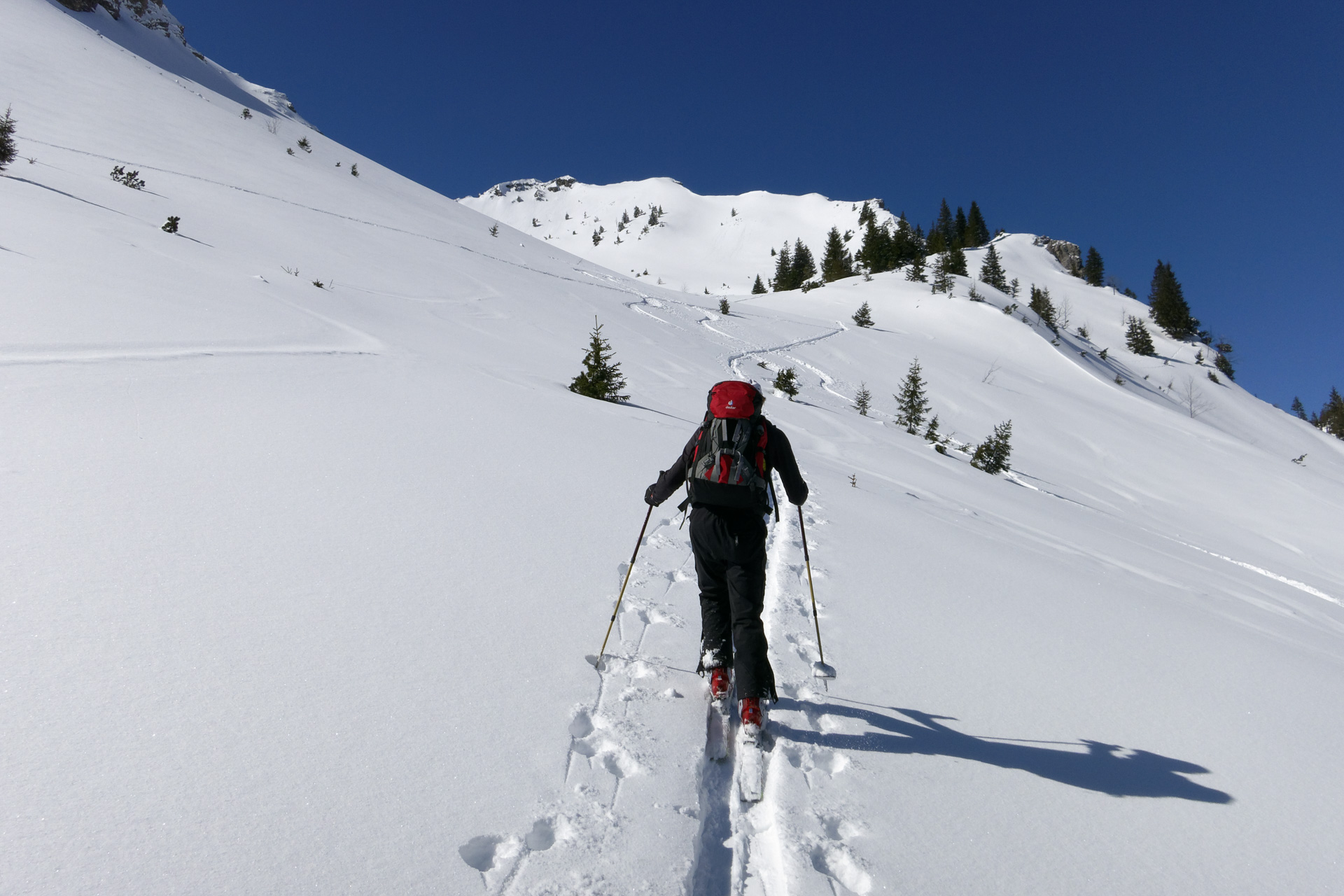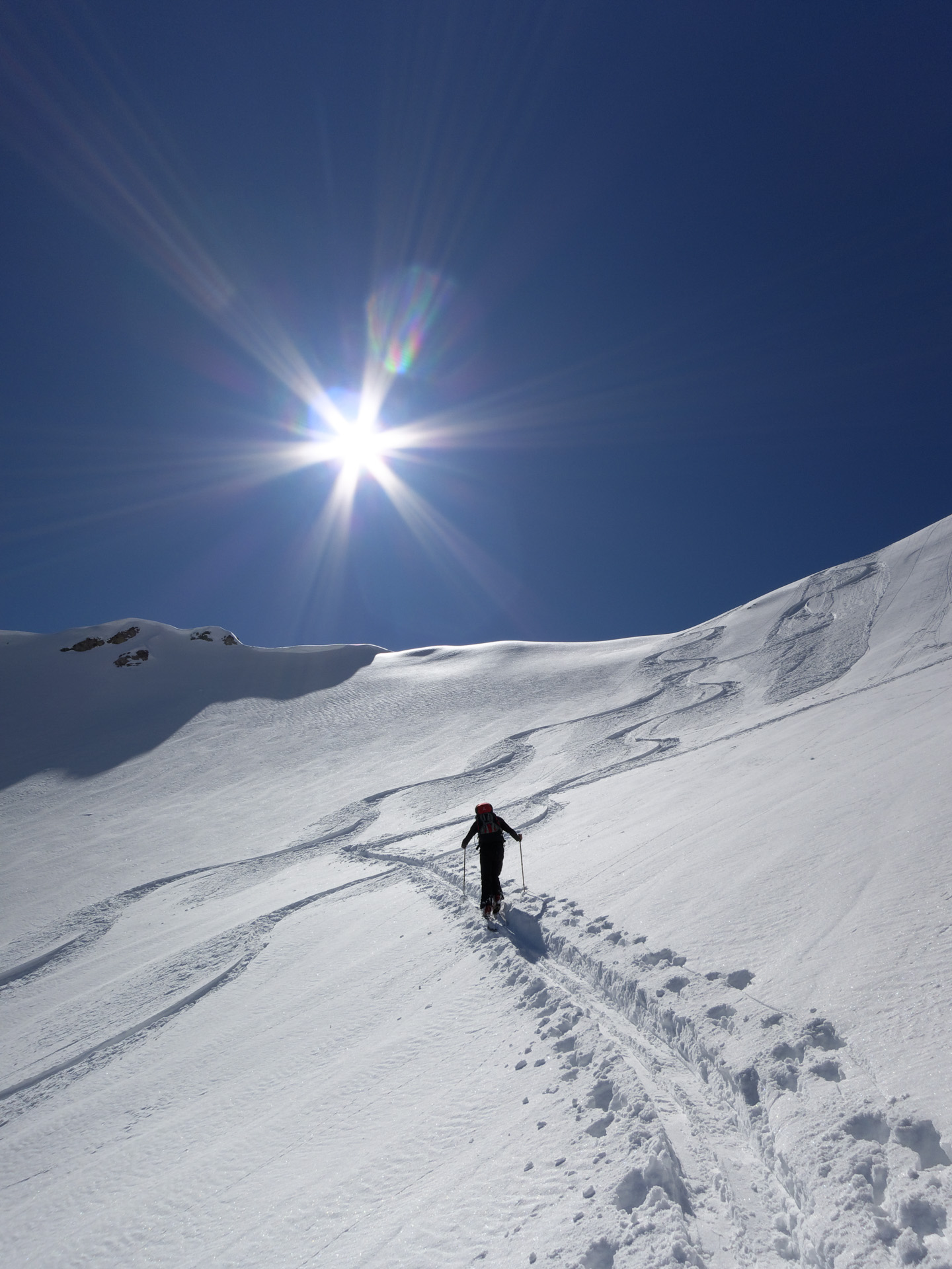 Dafür so gut wie keine Leute. Zwei Abfahrtsspuren waren schon drin, zwei Snowboarder haben wir am Sattel vor dem Gipfel (den wir uns gespart haben) getroffen.