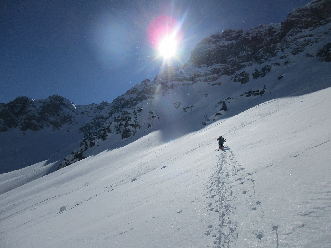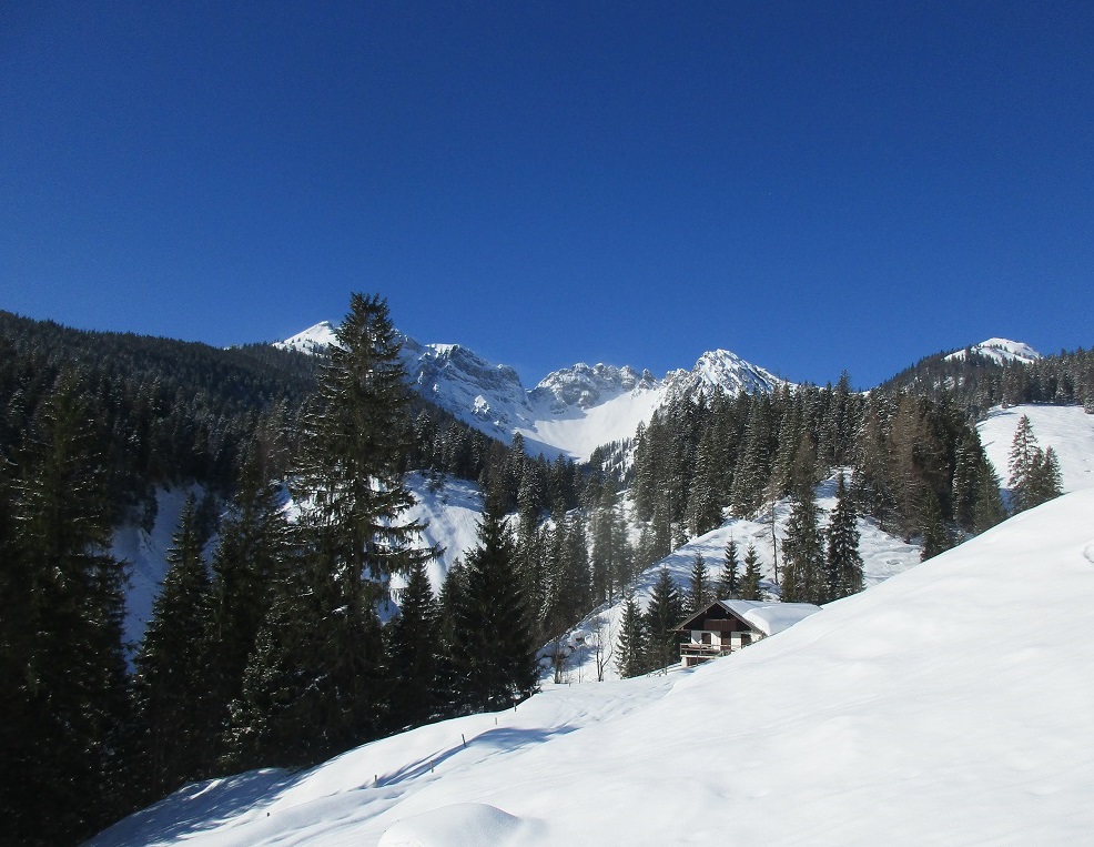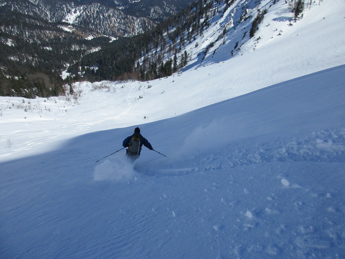 Tourenverhältnisse: Sehr Gut / Straße in die Valepp noch gut schneebedeckt / bestes Wetter + Schnee : Pulver / Schindertor + Felsrinne zum oberen Gratbeginn tief verschneit / vviieell Platz für eigene Spuren / drunten werd der Schnee scho langsam schwer