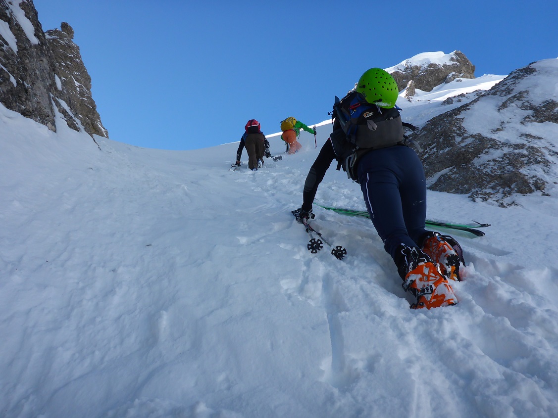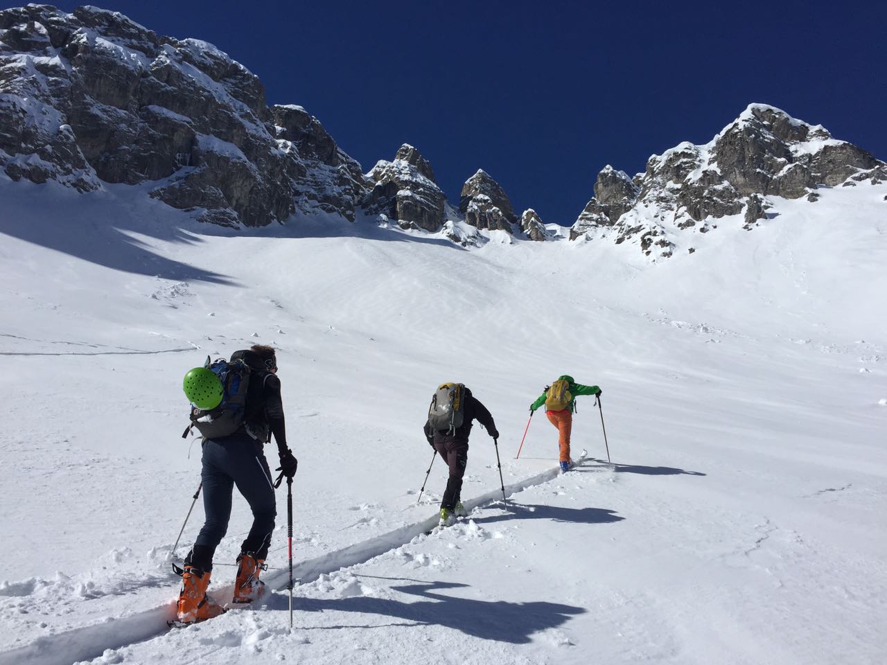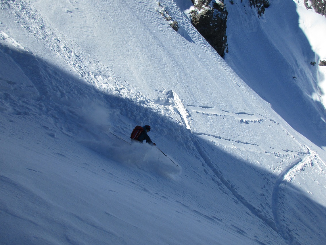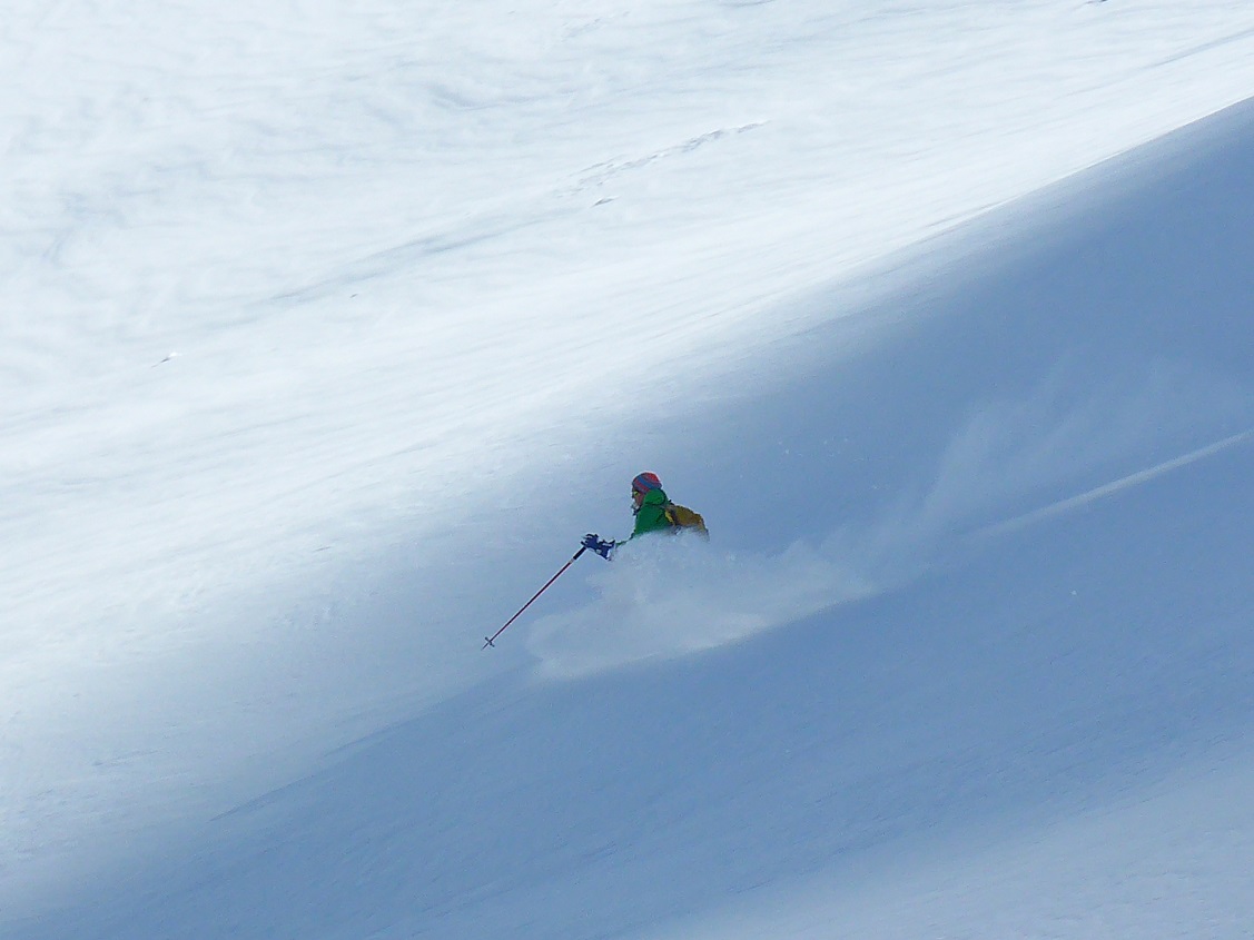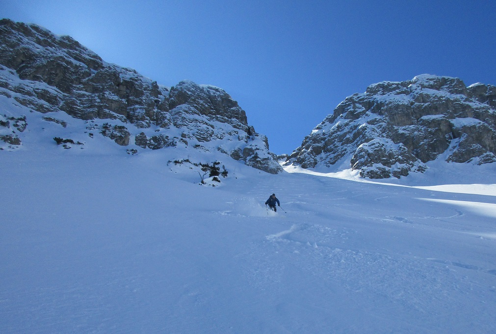 Gefahreneinschätzung: Heute keine LWS1 / zum Mittagsläuten saßen wir wieder drunten im Karboden / bisher noch keine Lawinen abgegangen / Kar in die rechte Scharte zum Bay. Schinder noch mit oben lauernden mächtigen Wechten