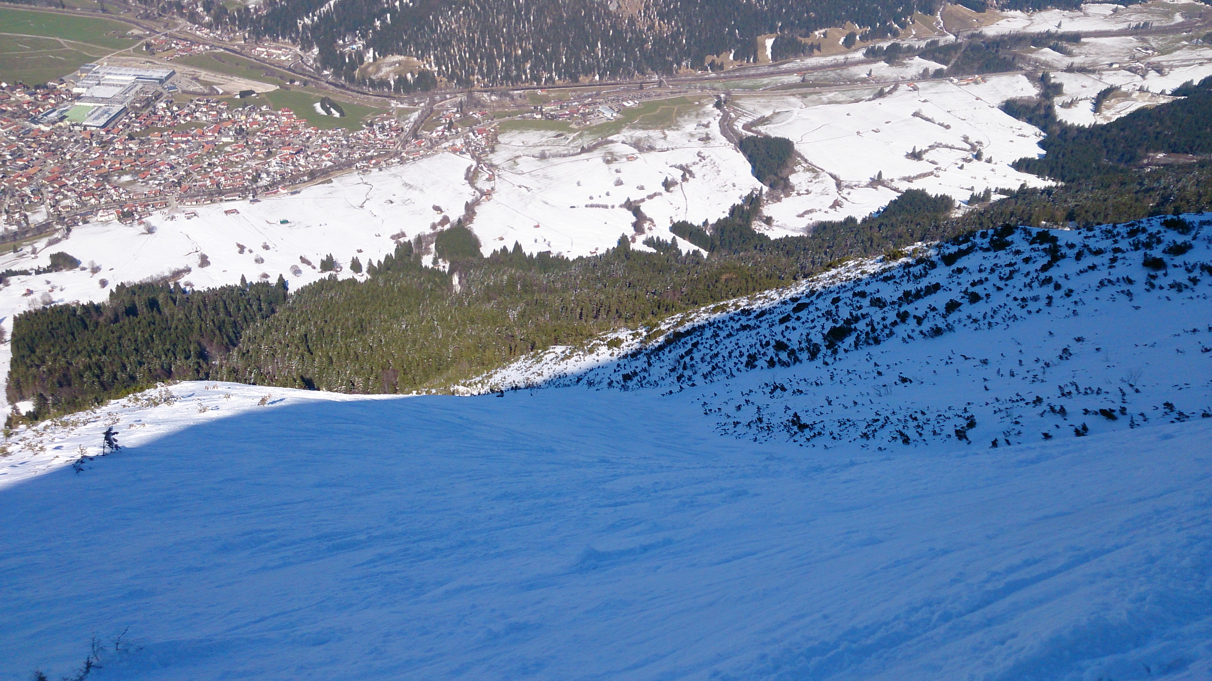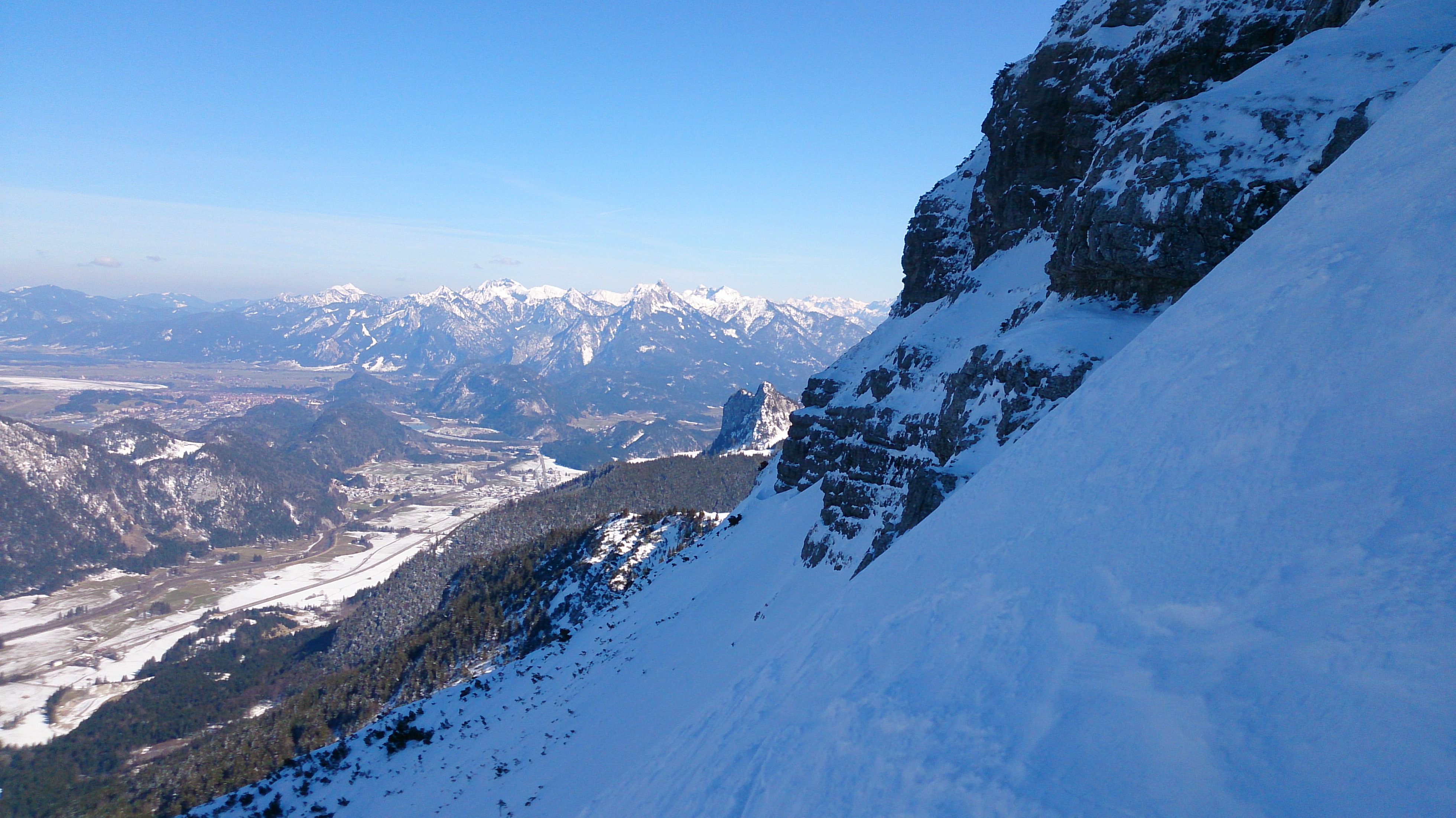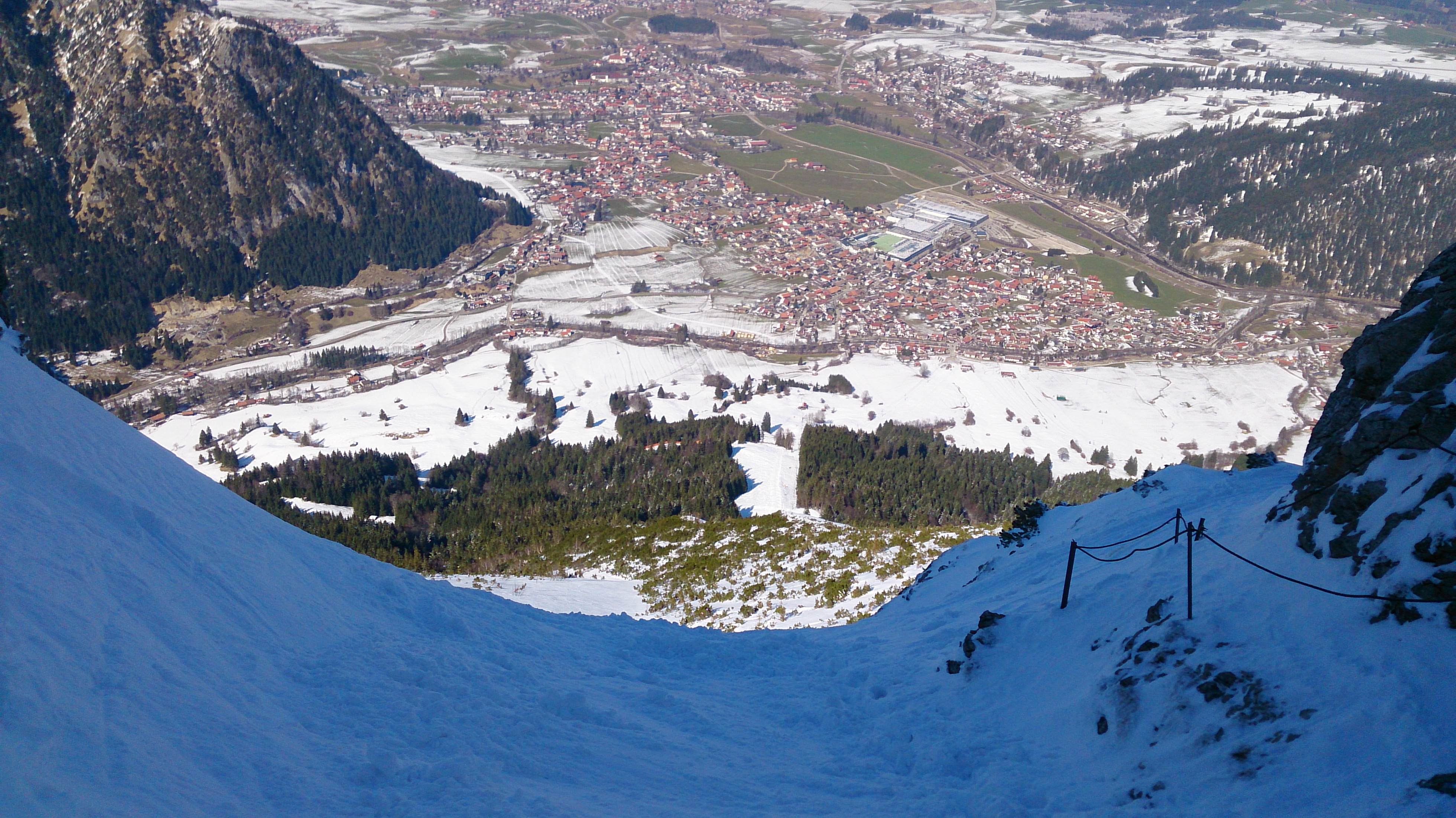 Nach dem Wiederaufstieg kurz zu Fuß hinab in das Taufat, heute nicht vereist und die Drahtseile sind auch frei gewesen - Steigeisen mitzunehmen lohnt sich aber sicher, wenn die Verhältnisse anders sein sollten. Die Nordabfahrt über das Taufat war pulvrig, aber leider etwas inhomogen und unten auch auf sehr hartem Harschdeckel. Ein bißchen hakelig geht es dann zu den Pisten des Skizentrums Pfronten - haben den Skibetrieb schon eingestellt und dementsprechend ist es entweder hart oder zerfahrener Acker - aber es geht bis ganz hinunter.
