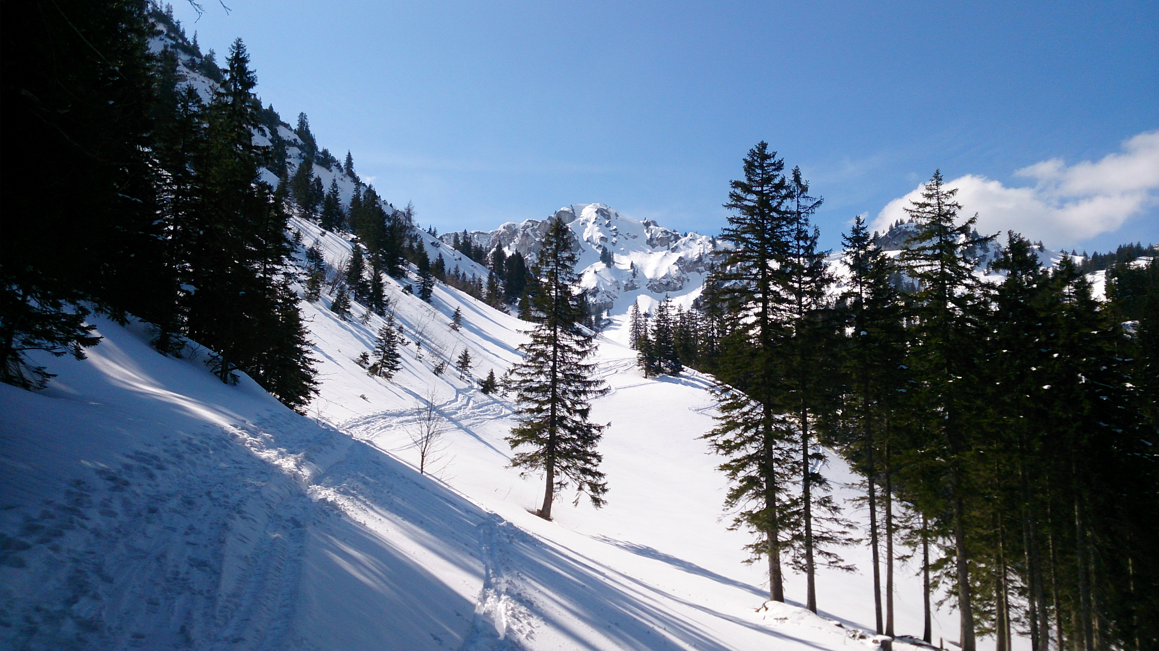 Tourenverhältnisse: unten auf den Wiesen hinter Geitau nur wenige cm Neuschnee, auf dem Forstweg ab ca. 1.000 m deutlich mehr Schnee