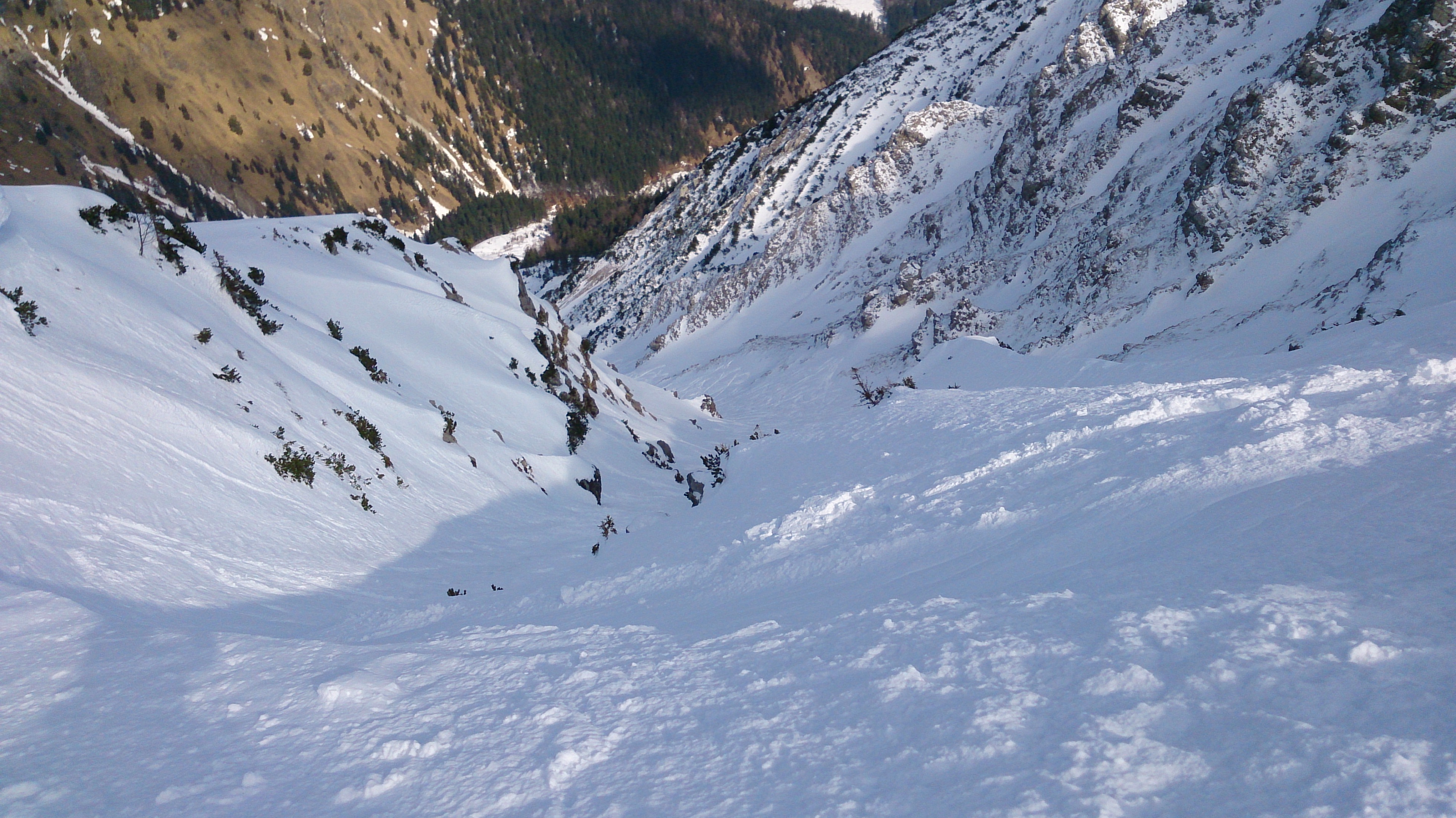Blick von oben in die eigentliche Einfahrt der Rinne - die Steilheit und v.a. der harte Schnee auf dem Einfahrtsband kommen aber nicht heraus: