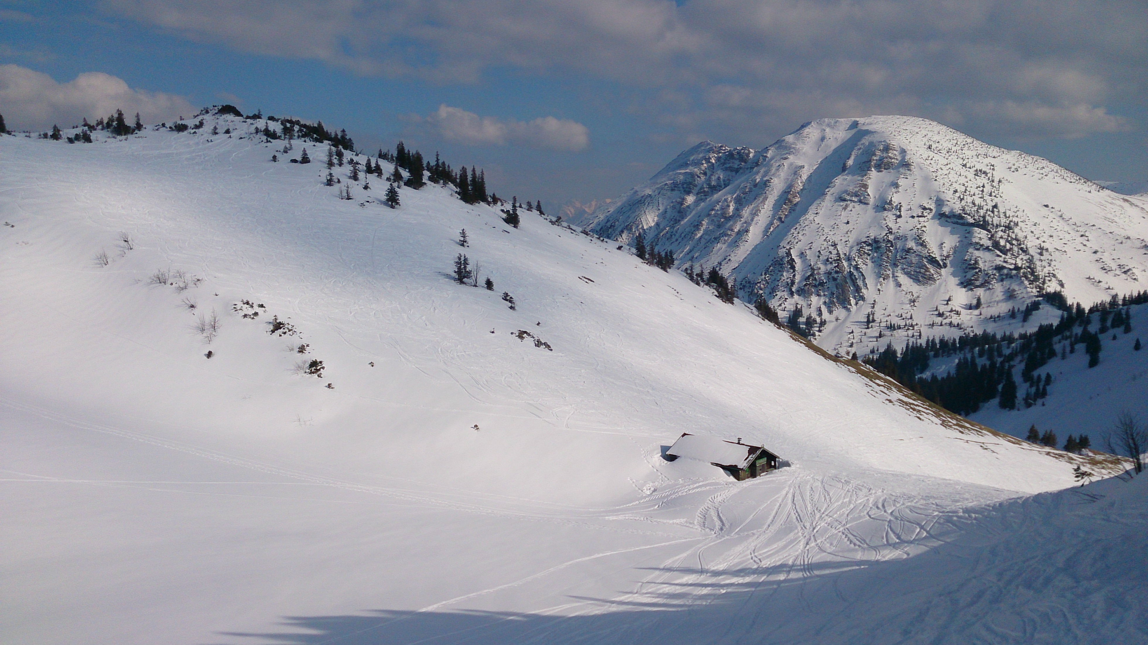 Anschließend ging es noch hinüber zum Jägerkamp und die Nordabfahrt hinab nach Aurach (Fischbachau). Teilweise schön pulvrig, aber auch schon Passagen mit leichtem Deckel. Nach der Alm im Wald ist die Abfahrt etwas abenteuerliches Abrutschen auf schmalen Schneebändern - sehr viel Schnee ist da auch nicht mehr. Auf einer teilweise extrem dünnen Schneedecke ging es aber noch bis zur Kapelle in Aurach.