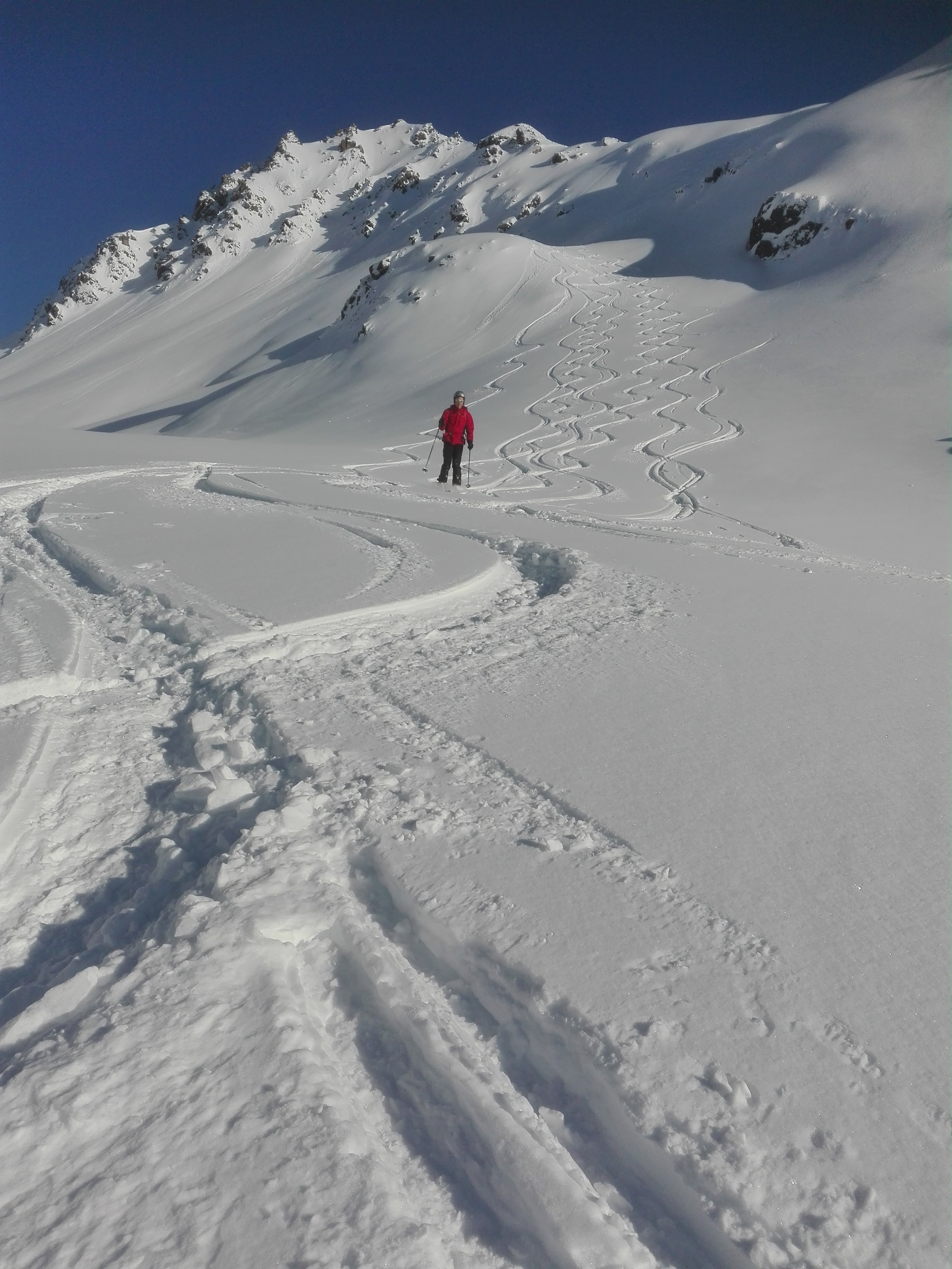 Am Sonntag von der Hütte über den Jamtalferner auf die Hintere Jamspitze. Mit Ski bis zum Gipfel möglich. Keine sichtbaren Spalten, allerdings im Vergleich zur Landkarte mit Gletscherstand von 1991 (!) gravierende Änderungen: diverse große Felsinseln, wo laut Karte noch durchgehend Gletscher sein sollte. Auch hier nordseitig Pulverschnee vom Feinsten, nur nützte uns das nichts, da wir zur Tuoihütte wollten. Hierzu benutzt man nicht (mehr) das Jamjoch (weist, soweit von weiter unten erkennbar, einen Felsriegel auf), sondern fährt östlich an der Hinteren Jamspitze vorbei auf einen Sattel zwischen dieser und dem Piz Urezzas. Von dort zunächst das Tal direkt nach Süden, später nach Westen und Südwesten hinab zur Tuoihütte. Südseitig war der Schnee schwer, westseitig noch einigermaßen pulverig. Wetter wolkenlos, am Gipfel windstill, erst abends erste Wolken.