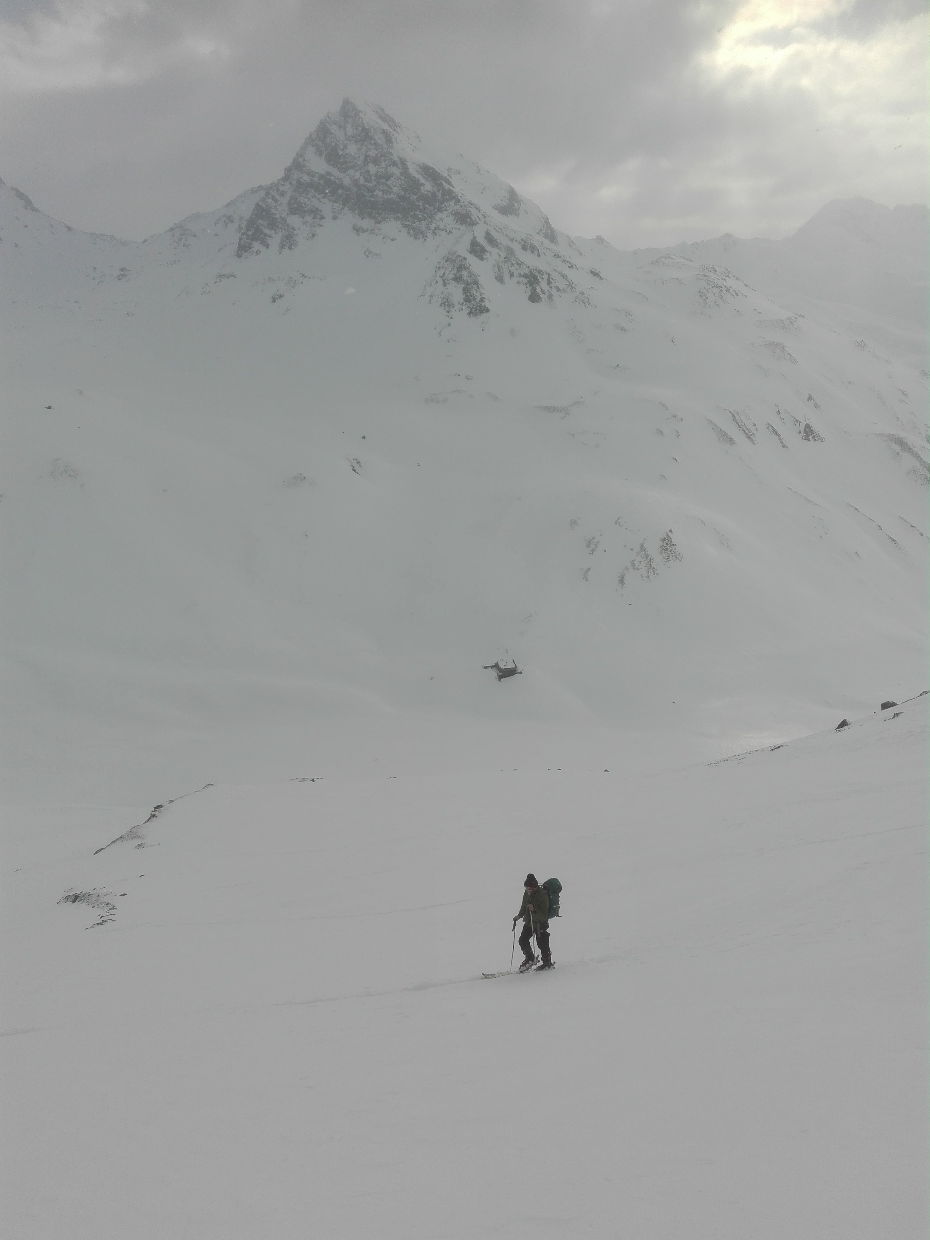 Am Dienstag war die Sicht morgens zunächst genauso schlecht, dazu schneite es leicht. Während des Aufstiegs zur Oberen Ochsentaler Scharte wurde die Sicht zumindest so gut, dass man ohne Probleme hoch fand. Die Gipfel blieben meist in Wolken, so dass wir auch auf die Dreiländerspitze verzichteten. Zudem in der Höhe ca. 20cm Neuschnee. Abfahrt über den Jamtalferner wieder bei bestem Pulverschnee unter Ausnutzung einzelner Aufhellungen, so dass wir einigermaßen Sicht hatten. Anschließend das elend lange Jamtal bei zunehmend sonnigerem Wetter wieder nach Galtür hinaus, dank der hier nun feuchten Neuschneeauflage auf der Straße mit viel Schieben.