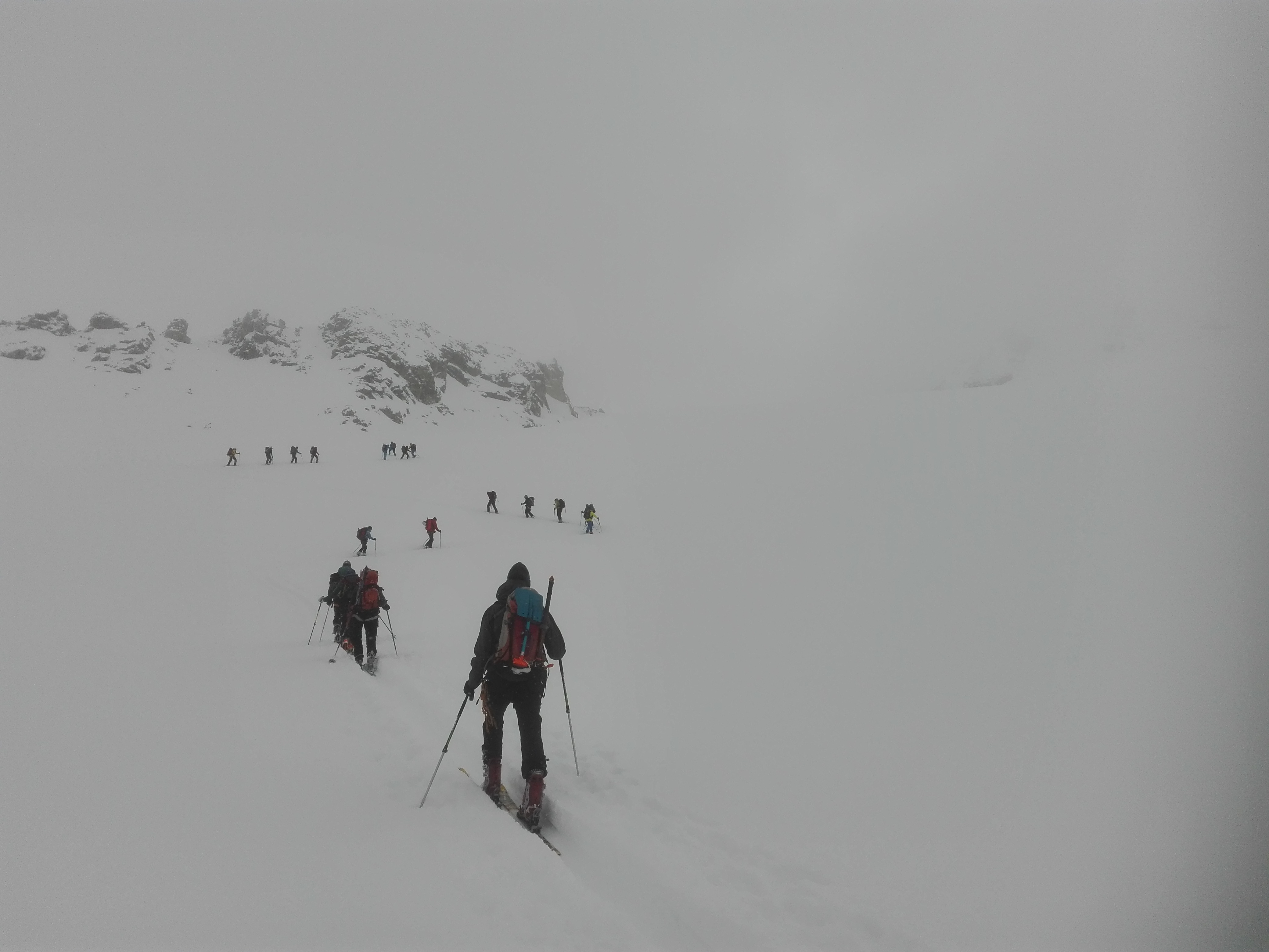 Bis zur Scharte waren die Gipfel zwar in Wolken, die Sicht aber noch brauchbar. Ab der Scharte dann den Rest des Tages maximal 50m Sicht, zeitweise auch "whiteout". Piz Buin daher illusorisch, stattdessen stocherten wir im Blindflug und mit GPS (wieder durch besten Pulverschnee) den Gletscher hinab und weiter zur Wiesbadener Hütte.