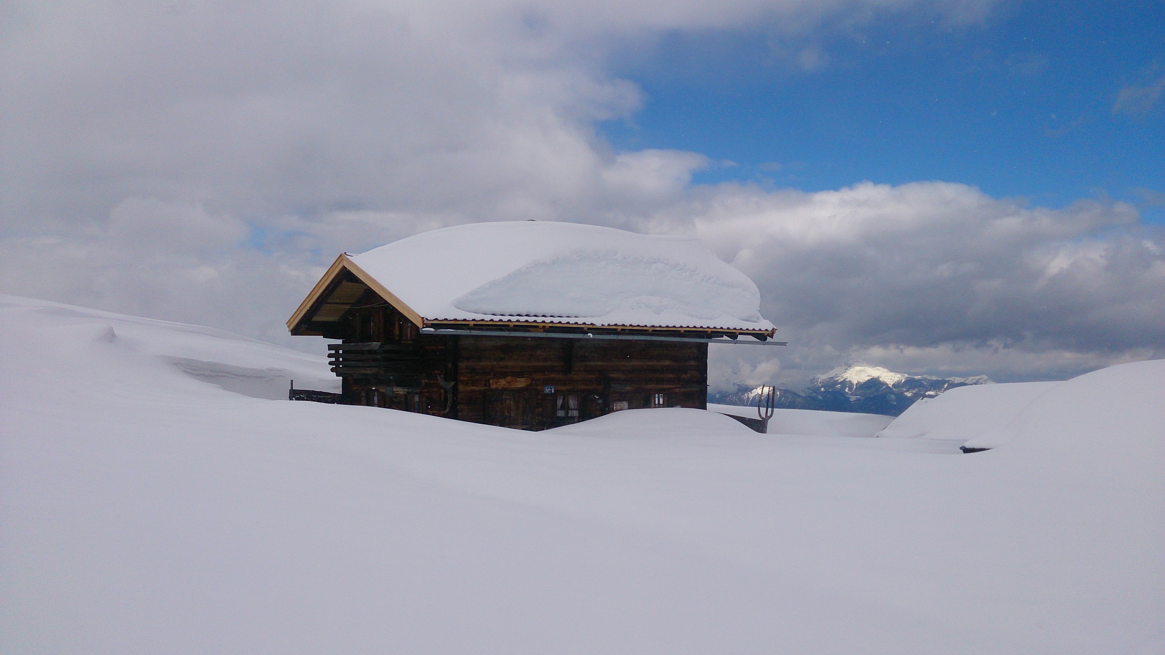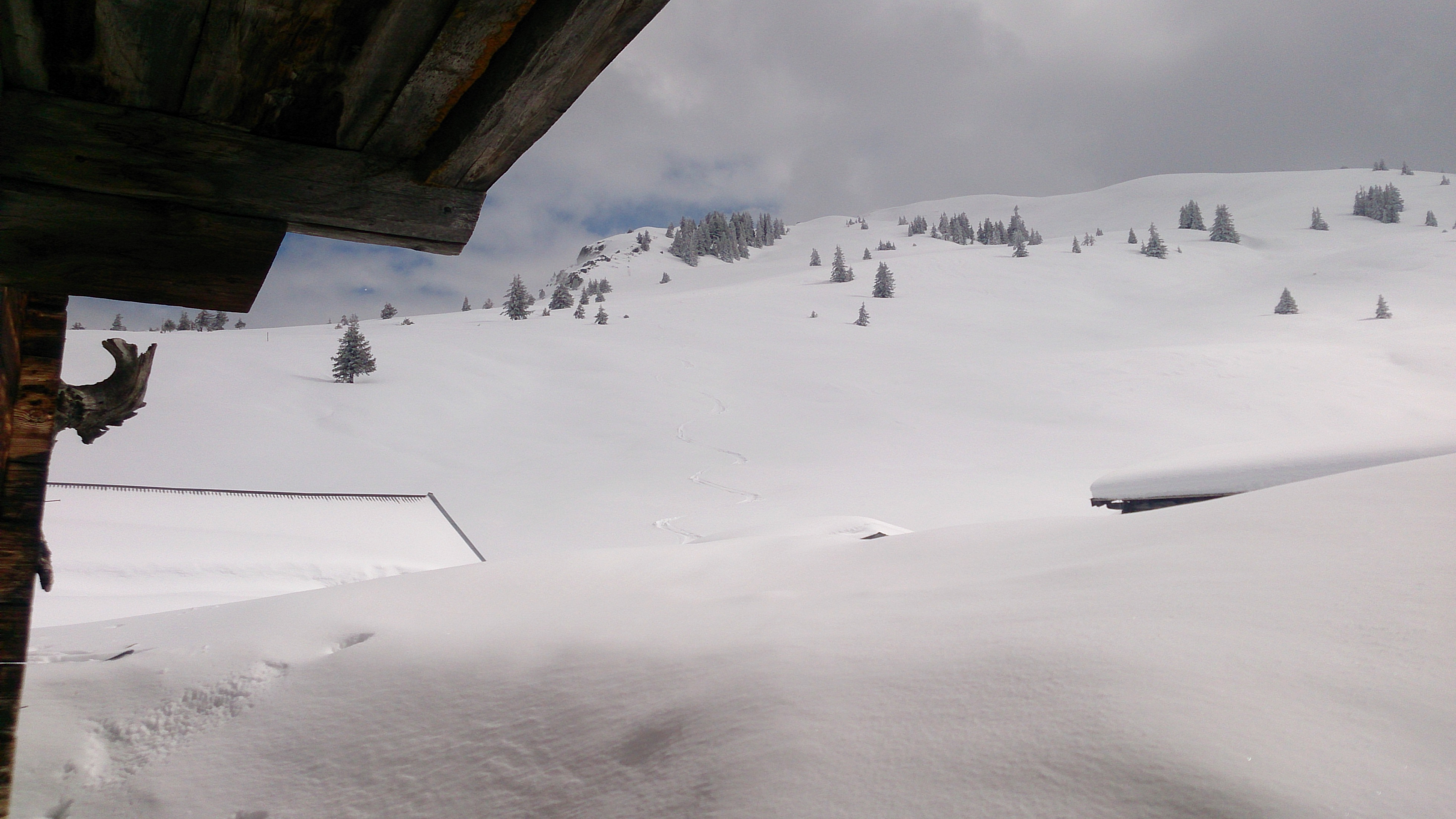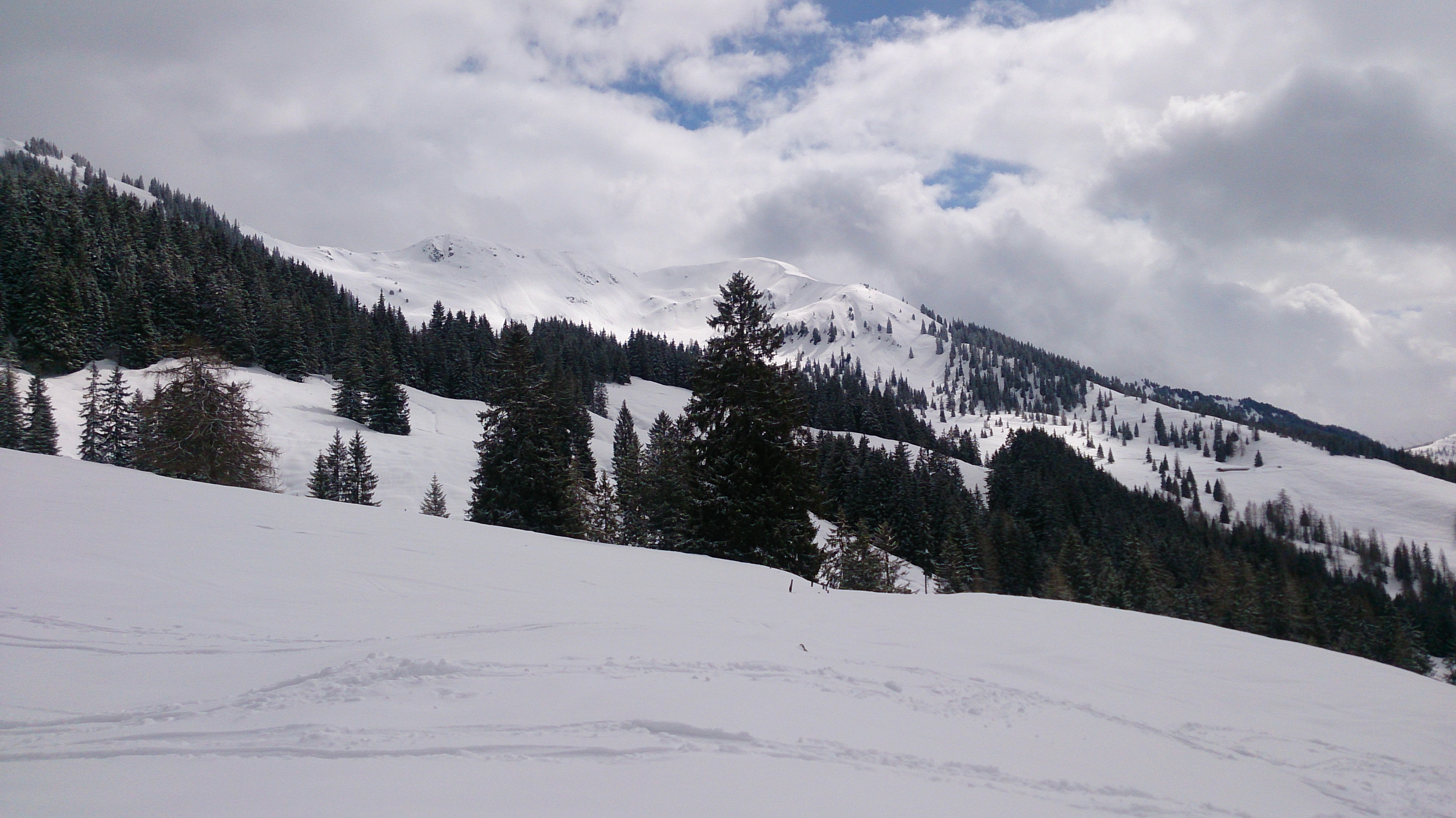 Tourenverhältnisse: Schnee von unten weg, 1x ca. 100 m Wegstrecke aper (könnte man auch umgehen) - oben schöner Pulver, am frühen Nachmittag unterhalb 1.500 m stark saugender Schnee