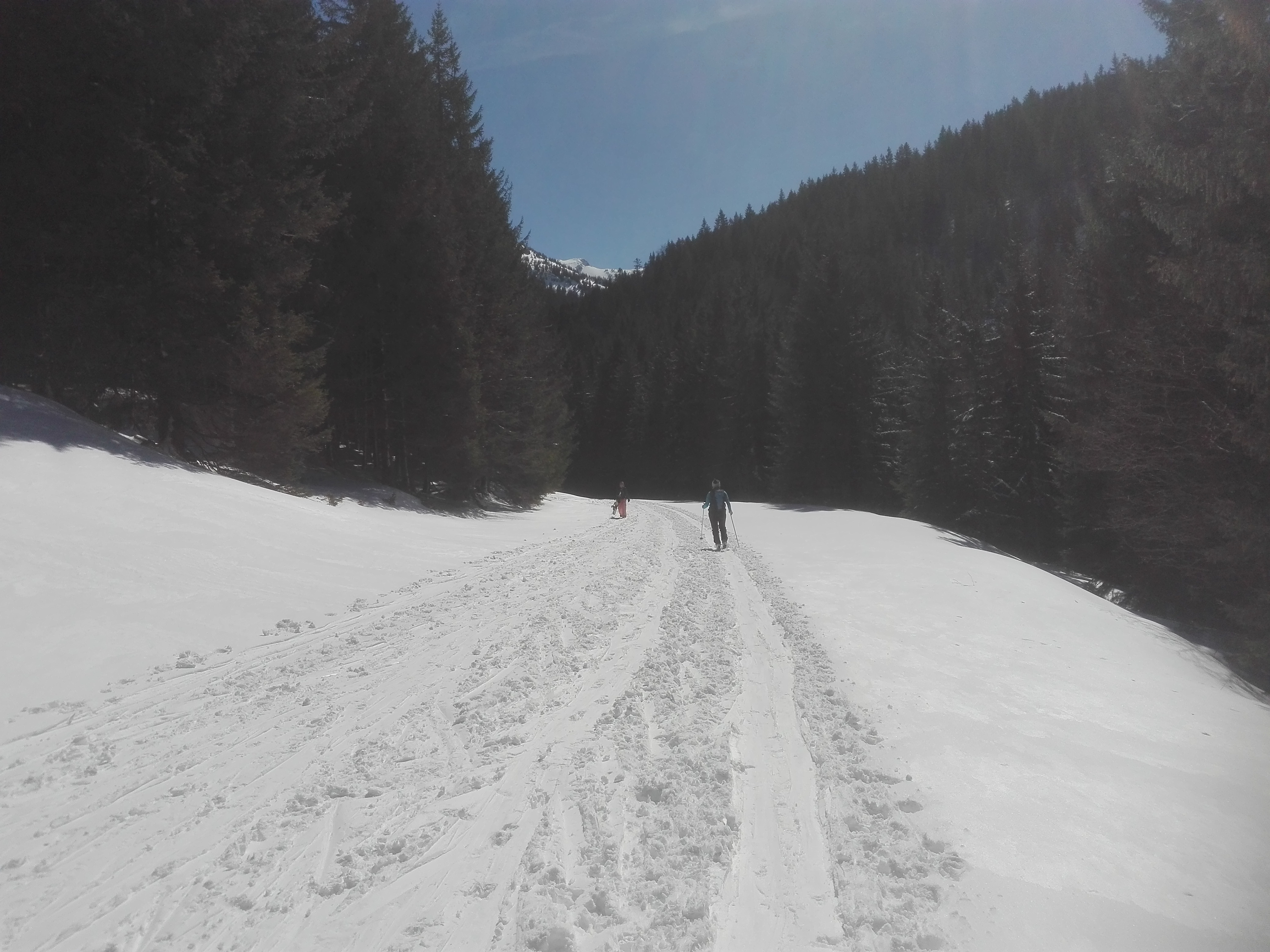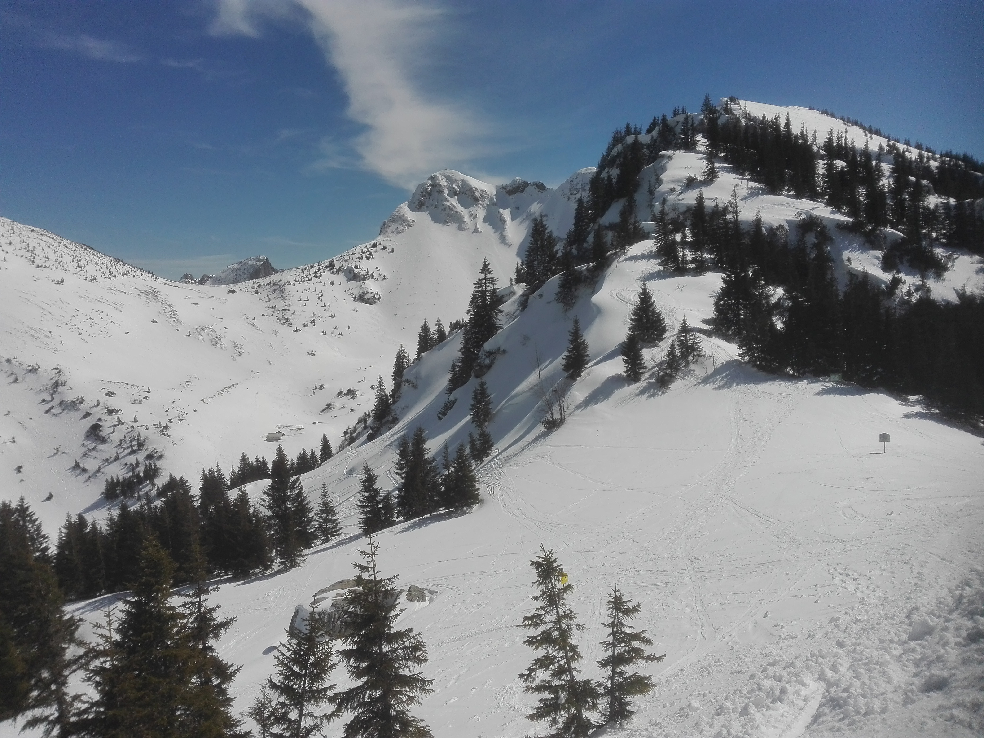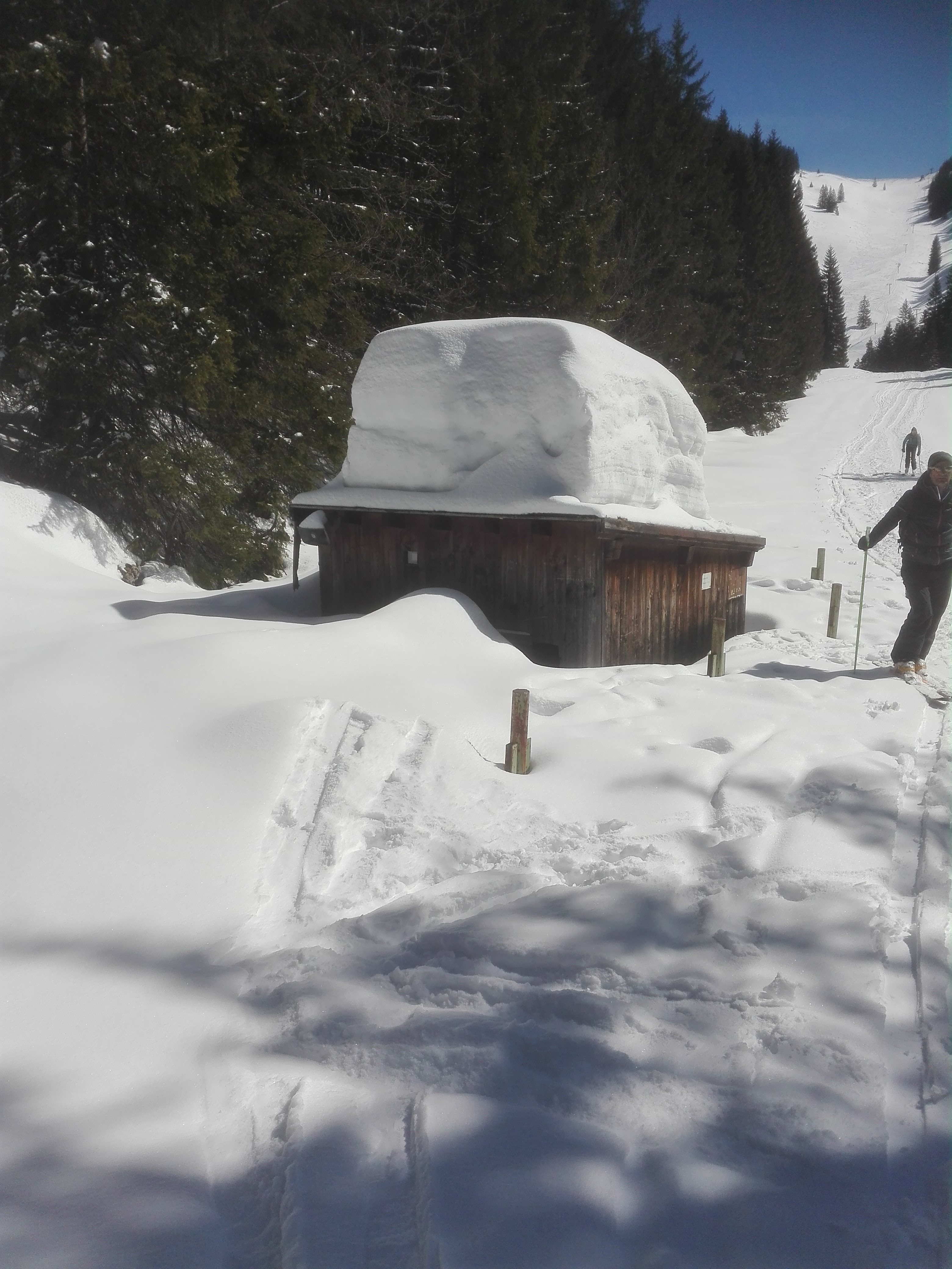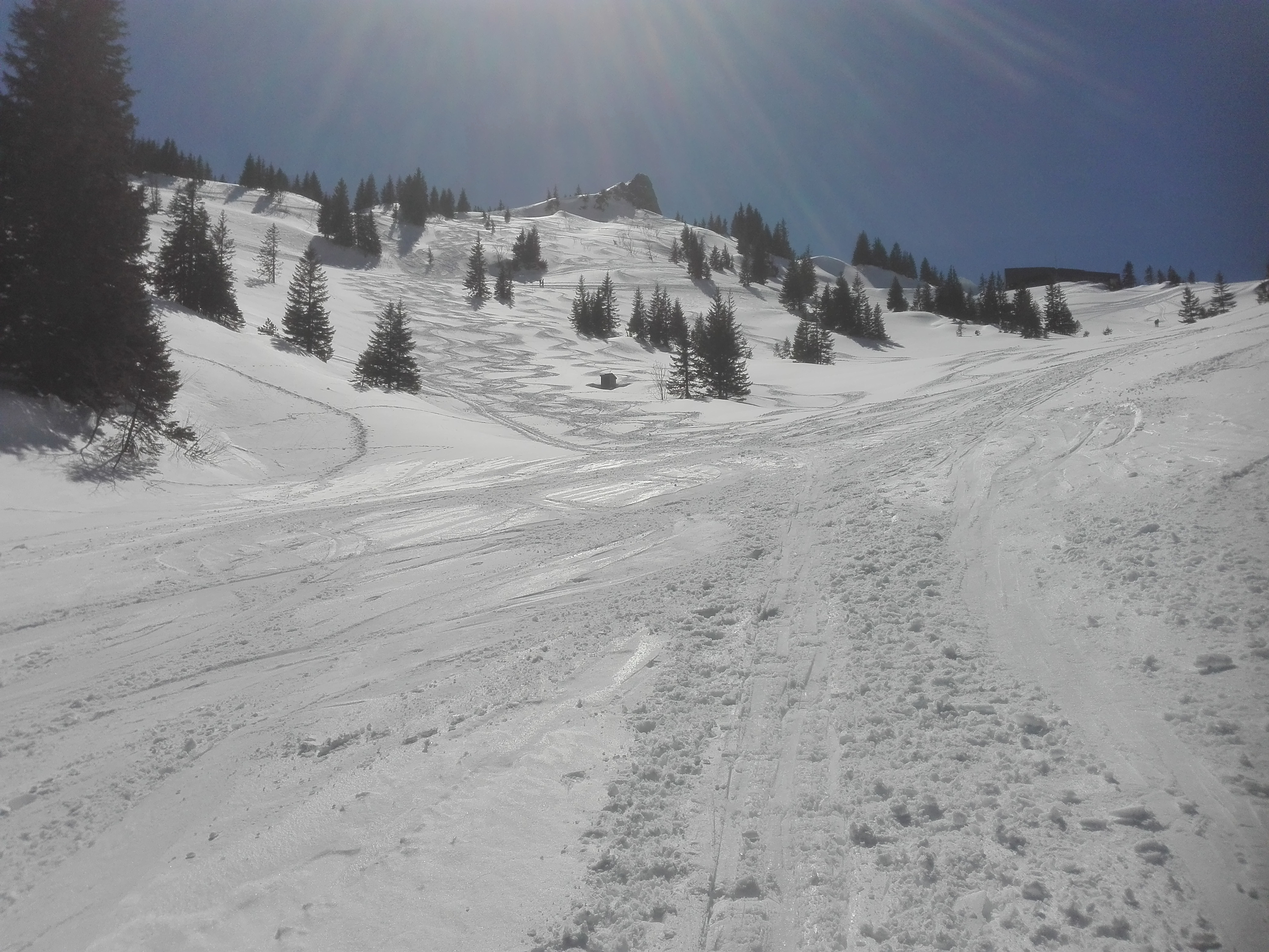 Tourenverhältnisse: Auf der Seilbahntrasse hoch und über den oberen Lochgraben zur Bergstation der Bahn und weiter zum Gipfel. Abfahrt auf dem gleichen Weg. Nordseitig gegen 14.00 noch schwerer, aber ganz gut fahrbarer Pulver, ansonsten je sonnseitiger man abfuhr, desto schwererer Schnee.