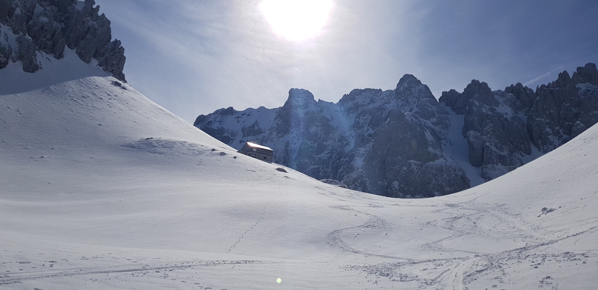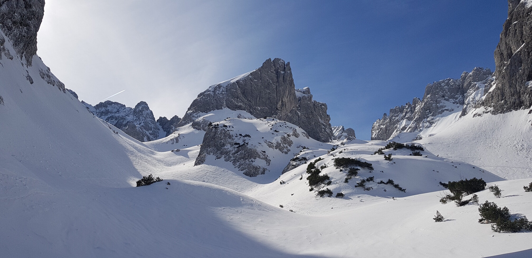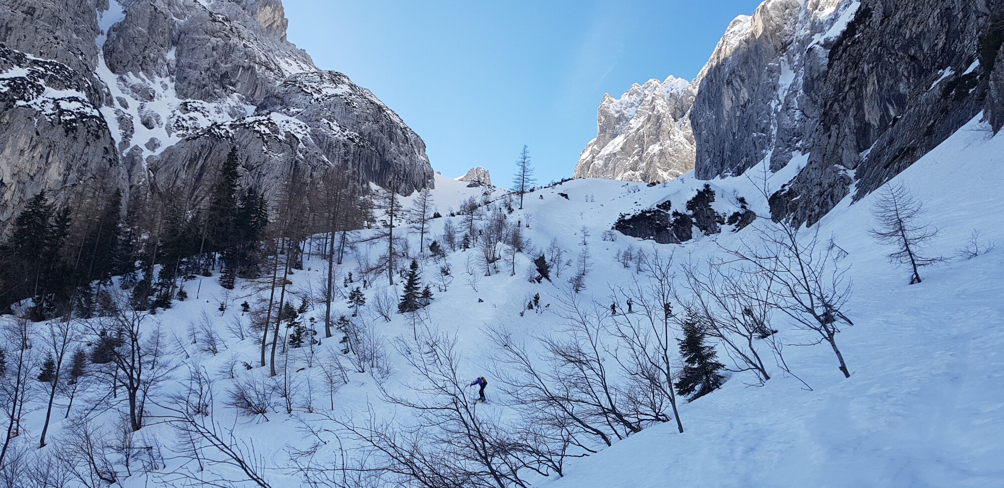Hier öffnet sich das Kar und über den ersten Steilhang geht’s hinauf. Unbedingt Harscheisen mitnehmen, der Hang war bockhart gefroren.