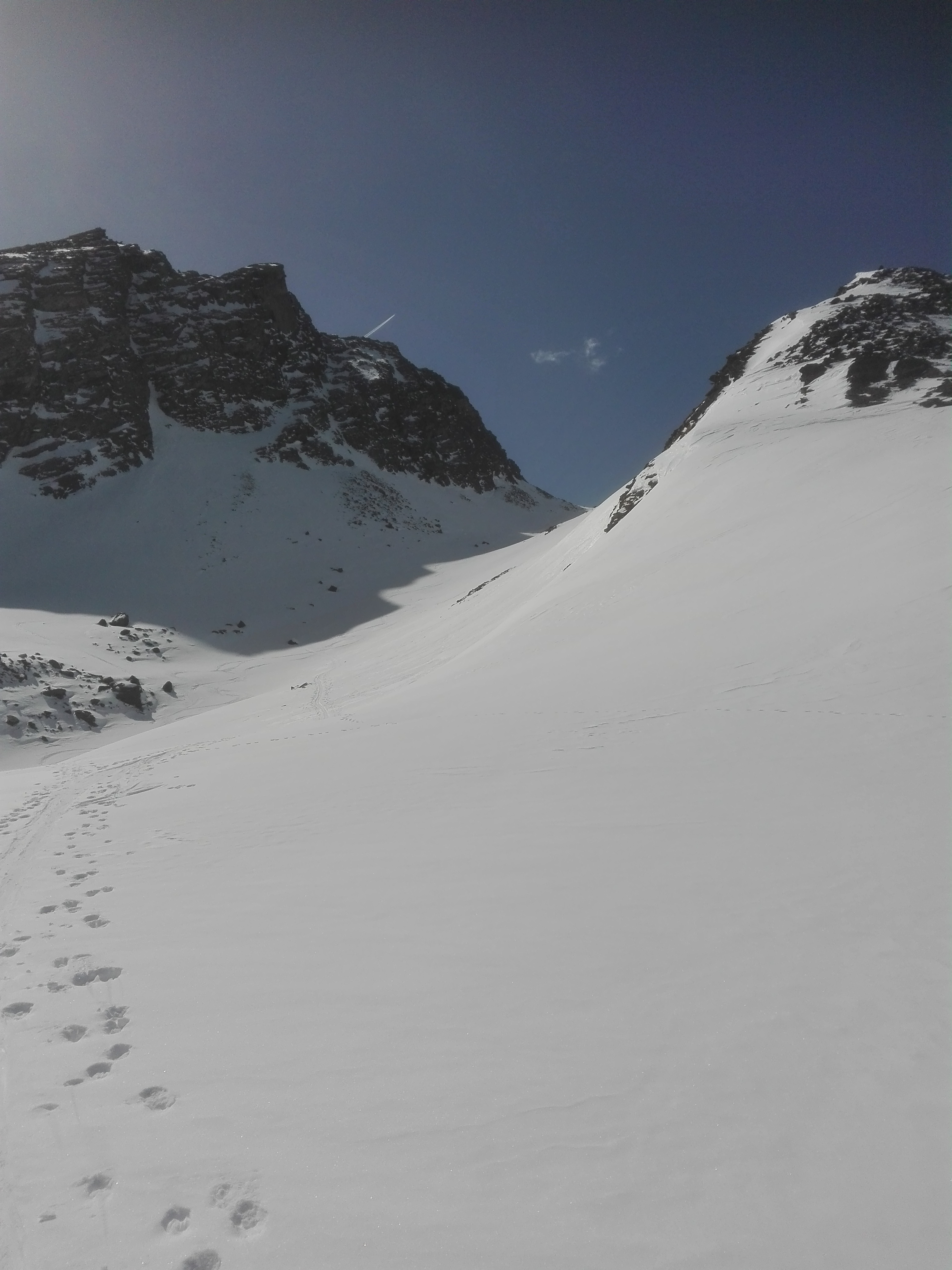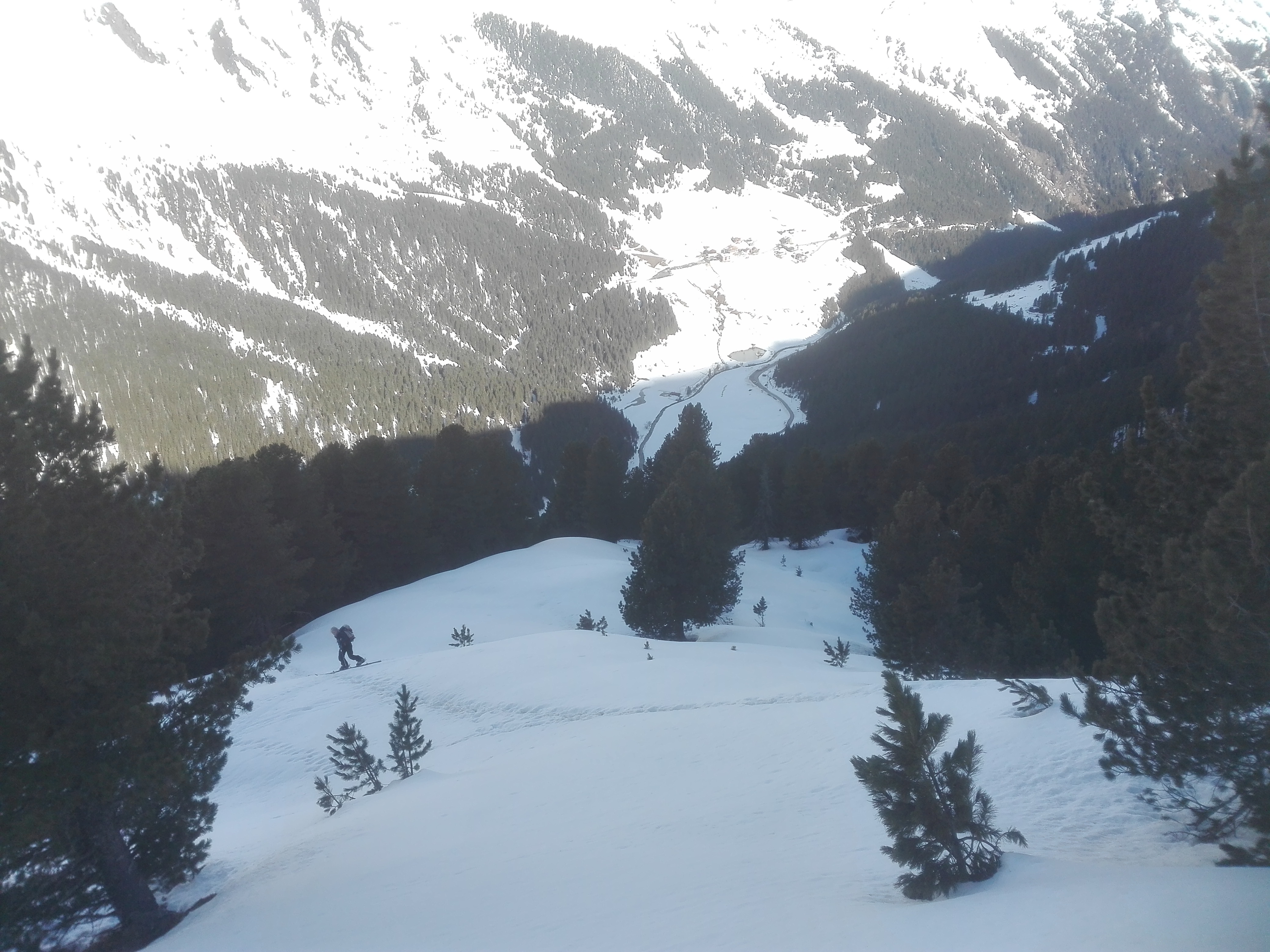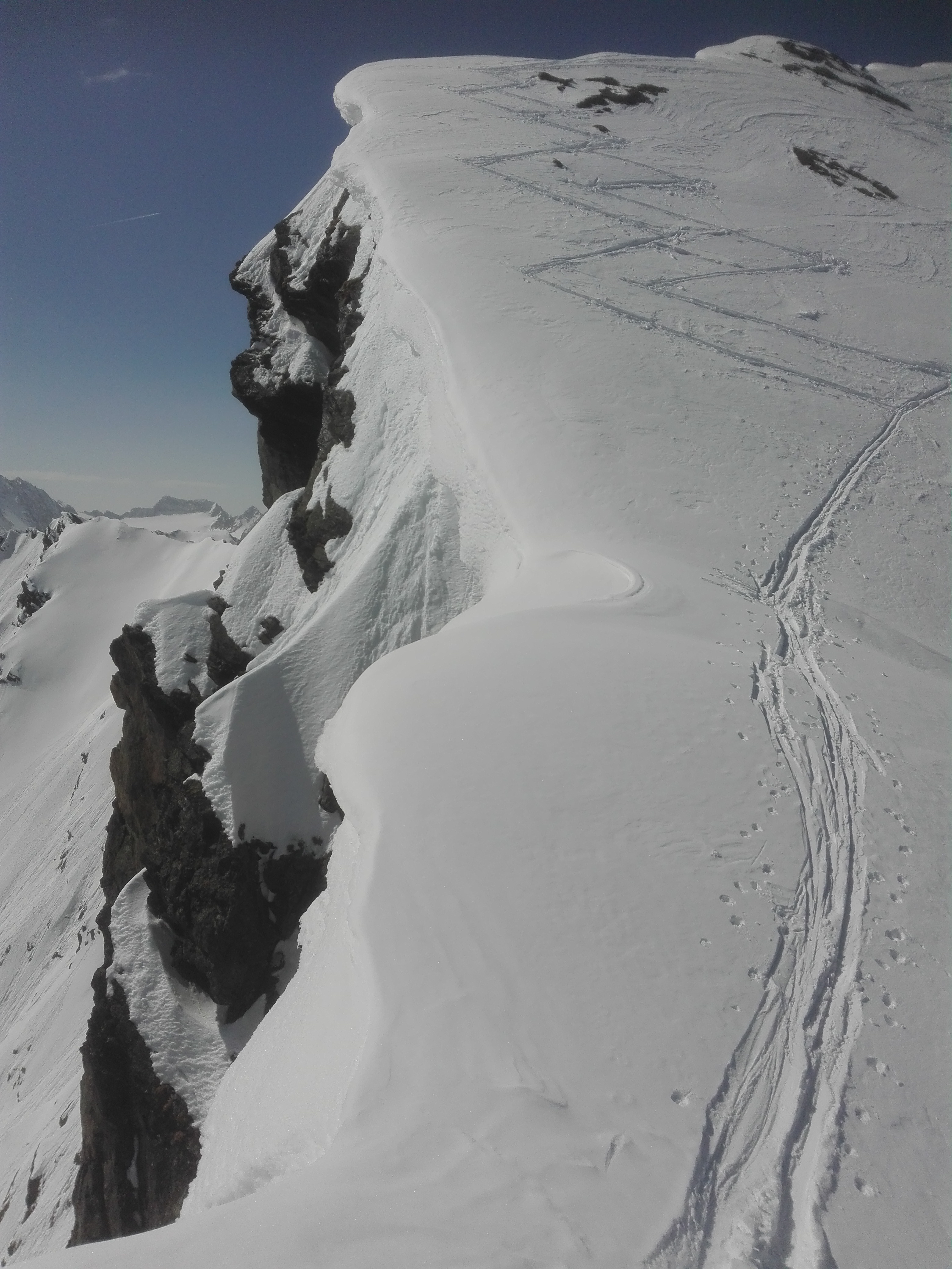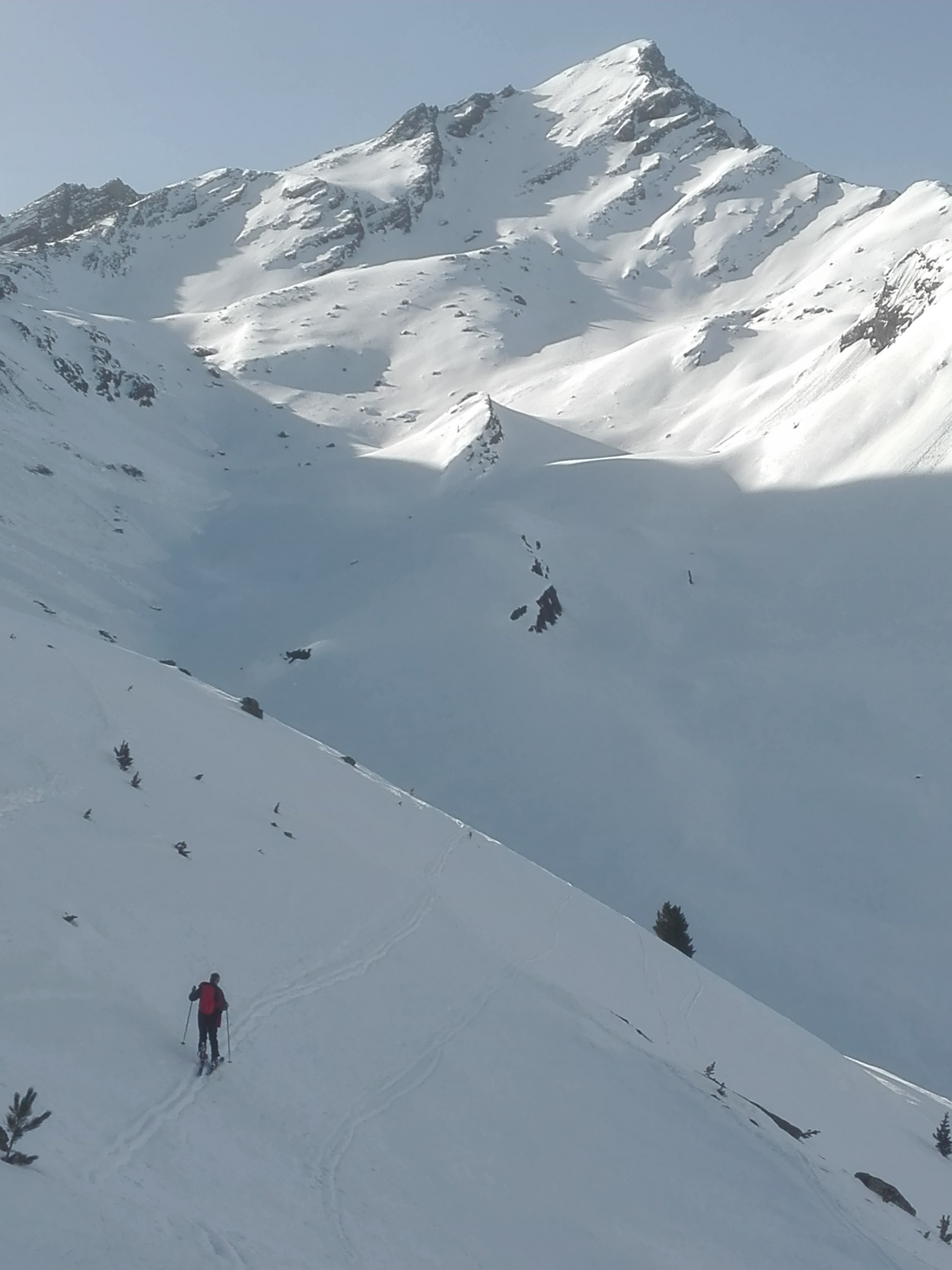 Abfahrt dann direkt vom Gipfel über den ziemlich steilen Nordhang und durch das Schönlisenstal bis auf knapp unter 2100m. Im obersten Teil noch gepresster Pulver, der nach unten hin in feuchten Schnee überging und zum Schluss auch noch in Firn. Insgesamt ganz gut zu fahren. Dann aber trauten wir uns nicht Spuren zu folgen, die direkt Richtung Tal führten, weil wir diese Abfahrt nicht kannten. Stattdessen querten wir wieder zum Aufstiegsweg zurück und fuhren diesen ab. Allerdings war es inzwischen so spät, dass nun im Wald und unterhalb überall tiefer Sulz war. Zu allem Überfluss verfransten wir uns auch noch ein wenig im Wald, so dass es über rund 400Hm ein rechtes Geackere wurde.