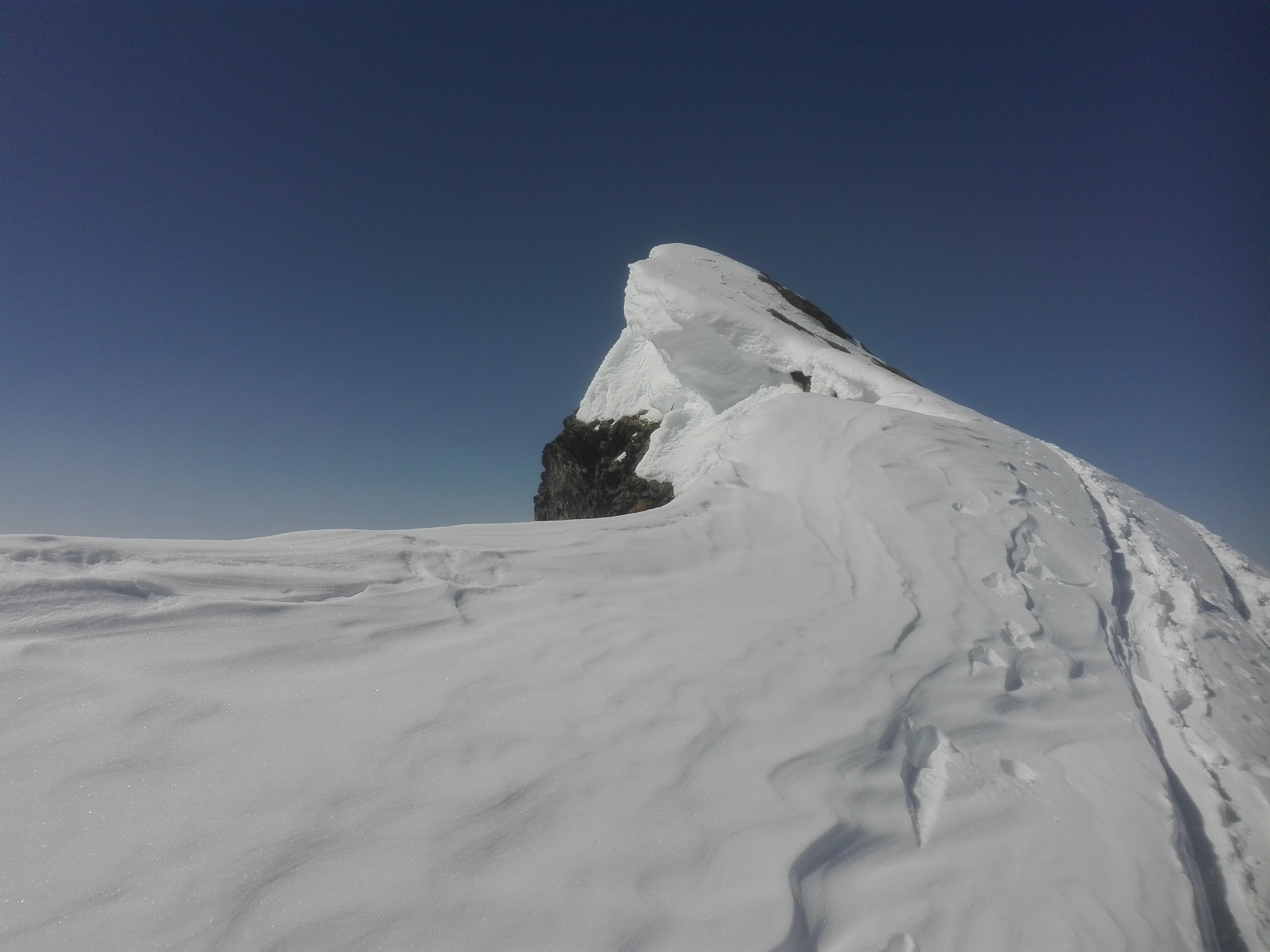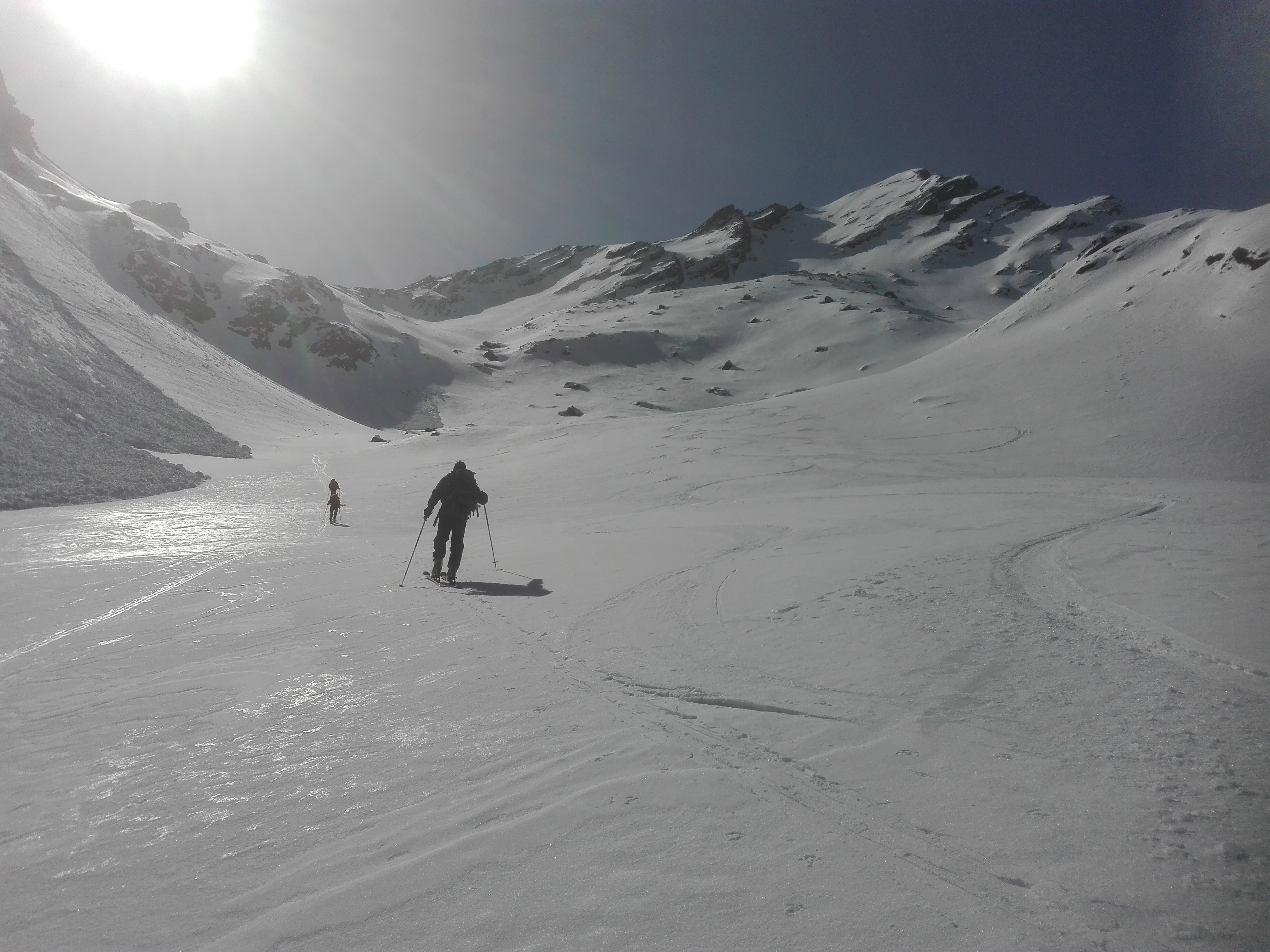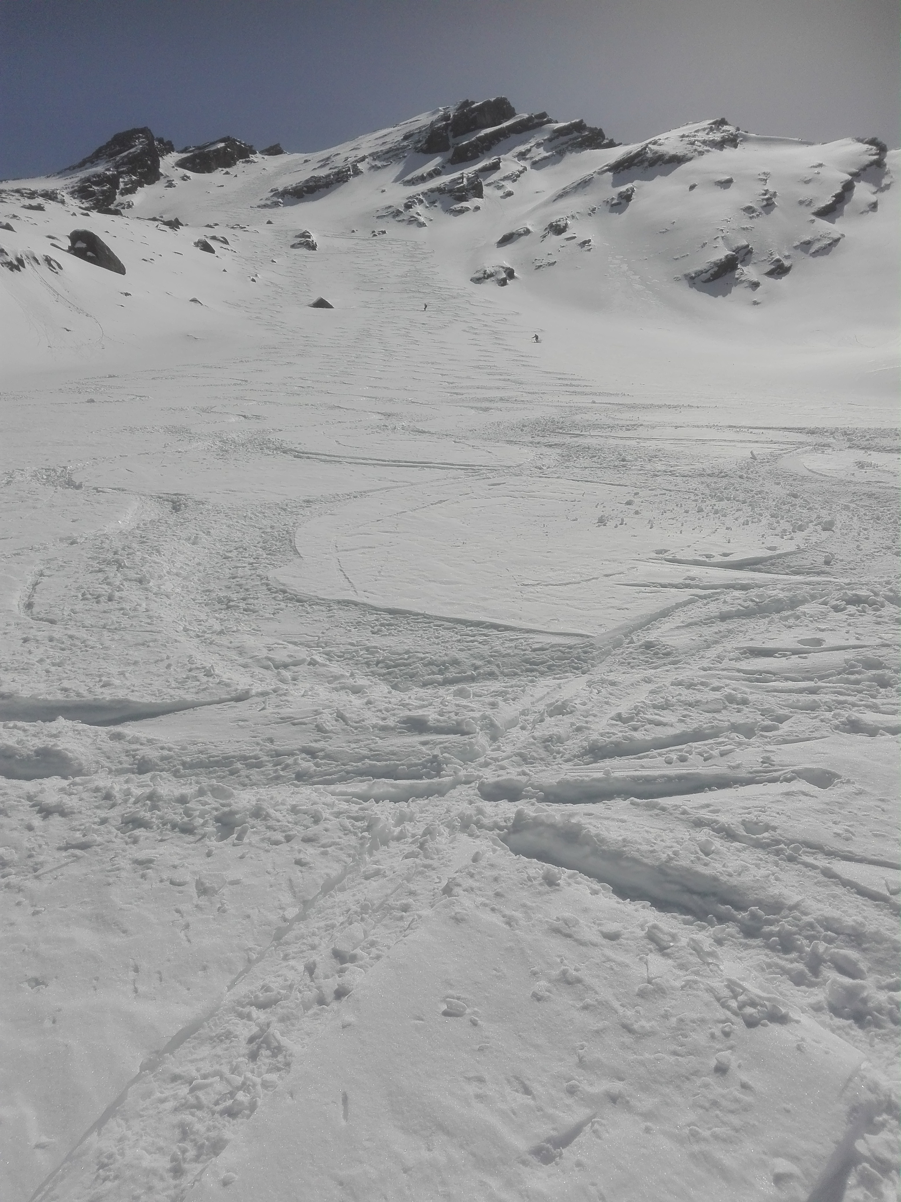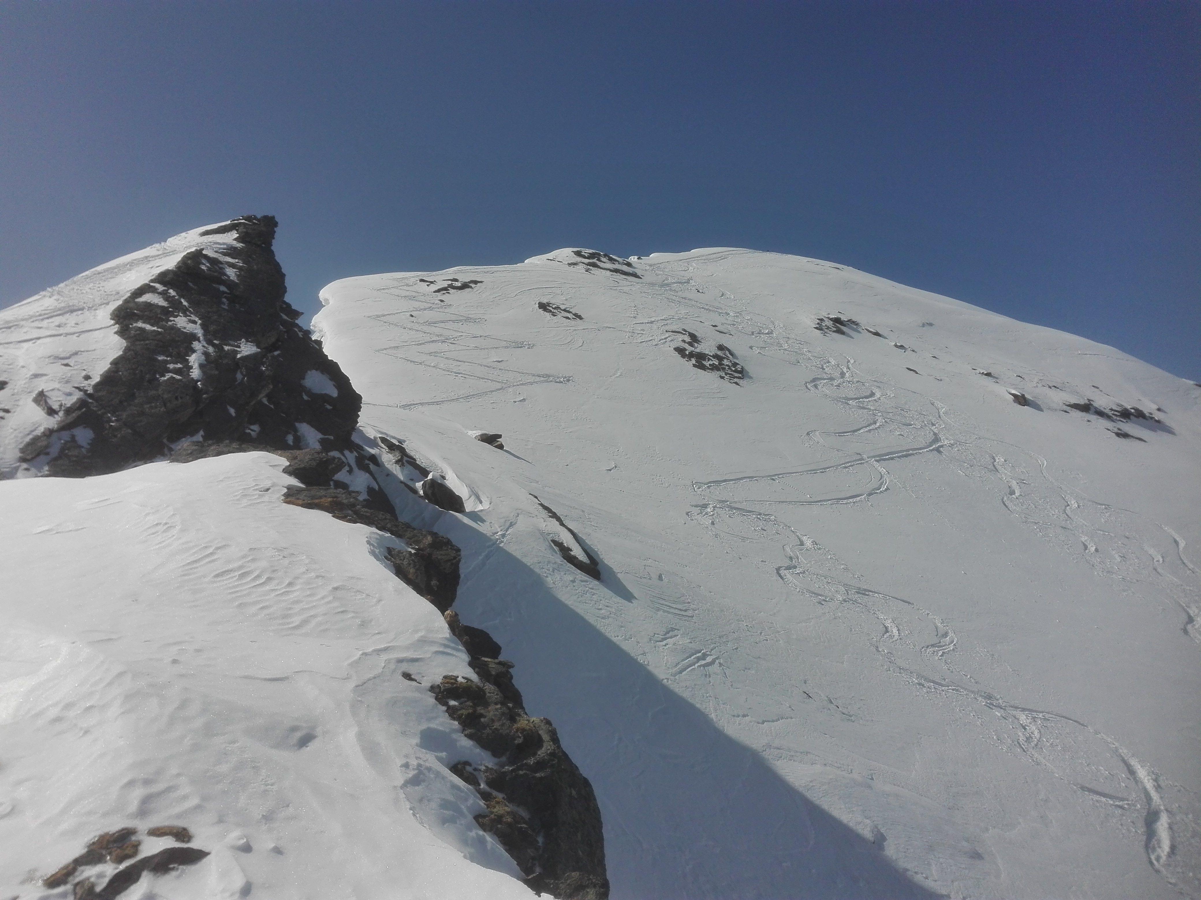 Tourenverhältnisse: Startpunkt ist genau die Stelle, ab der Parkgebühren erhoben werden. Hier am Waldrand entlang bis ca. 1800m. Hier morgens hart, Harscheisen wichtig. Dann nach links in den Wald und durch diesen ungefähr in einem großen Bogen nach rechts auf die freien Hänge ab etwa 2050m. Im Wald war der Schnee nicht durchgefroren, wir ahnten schon Ungemach für die Abfahrt. Nun ins Schönlisenstal hineinqueren (hier wieder recht hart), ua. über zwei Lawinenkegel, und durch das Tal problemlos (nun auch ohne Harscheisen) Richtung Hochgrafljoch. Entweder immer im Talboden bleibend in einem Bogen unter dem Joch durch in das sich anschließende schmale Kar Richtung Süd oder - kürzer - ab ca. 2600m auf den Rücken, der das schmale Kar begrenzt und dann einfach ins Kar hinein queren. Durch das Kar zu einem flachen Sattel (P.2822m) und über einen ostseitigen sehr steilen Hang, der im Aufstieg schon recht weich war und auch ein paar Felsen aufweist, weiter hoch auf den Gipfelrücken. Dabei ein paar Meter zu Fuß. Über den Rücken, kurzzeitig schmal und fast schon etwas ausgesetzt, zum P. 2981m. Hinter diesem 2m zu Fuß absteigen (derzeit harmlos) und mit Ski weiter zum Gipfel.