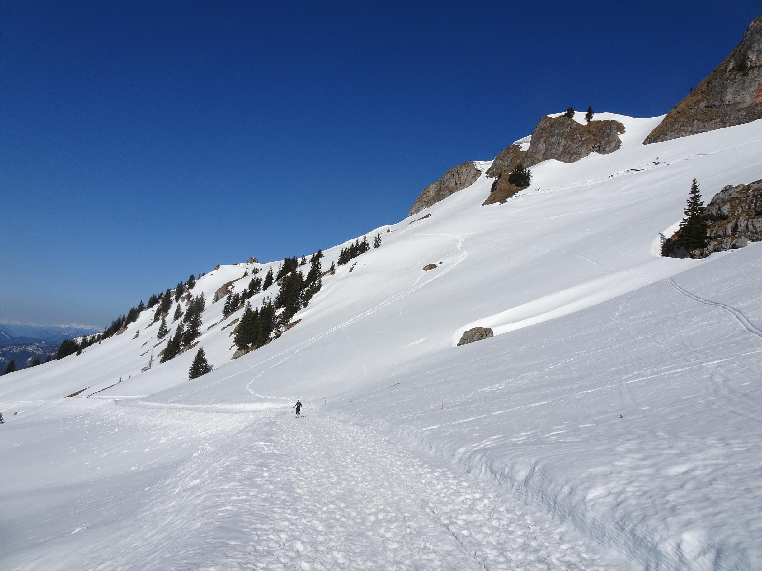Grundsätzlich liegt noch genügend Schnee - sieht man mal von Stellen am Forstweg zum Rotwandhaus ab sowie vom obersten Bereich des Miesingsattels. Auch die Taubensteinabfahrt ist noch in einem guten Zustand.