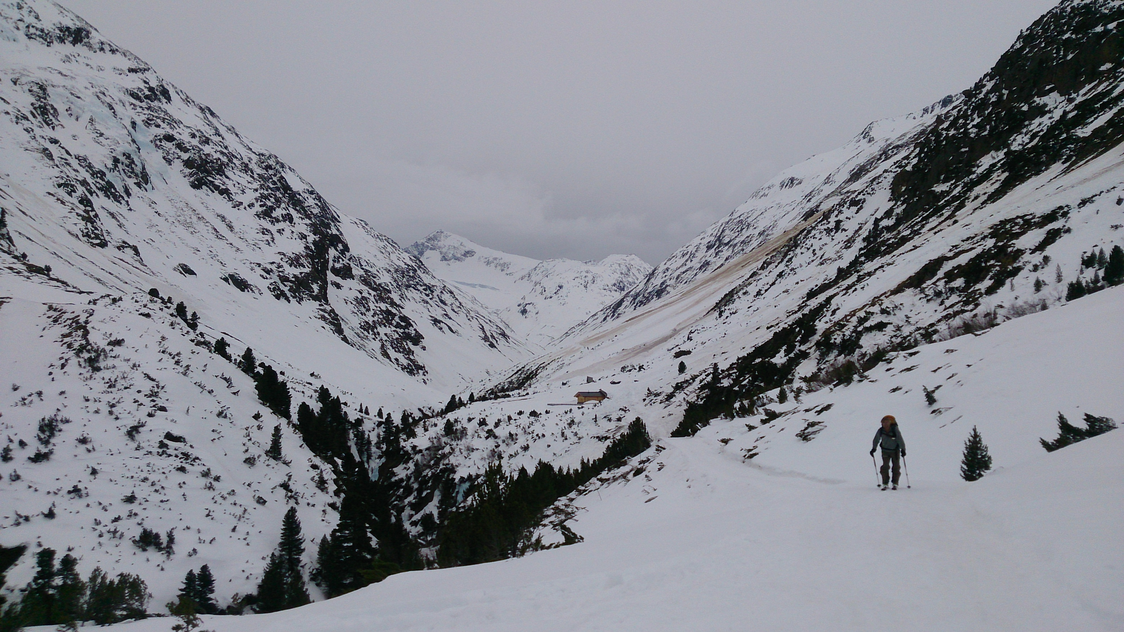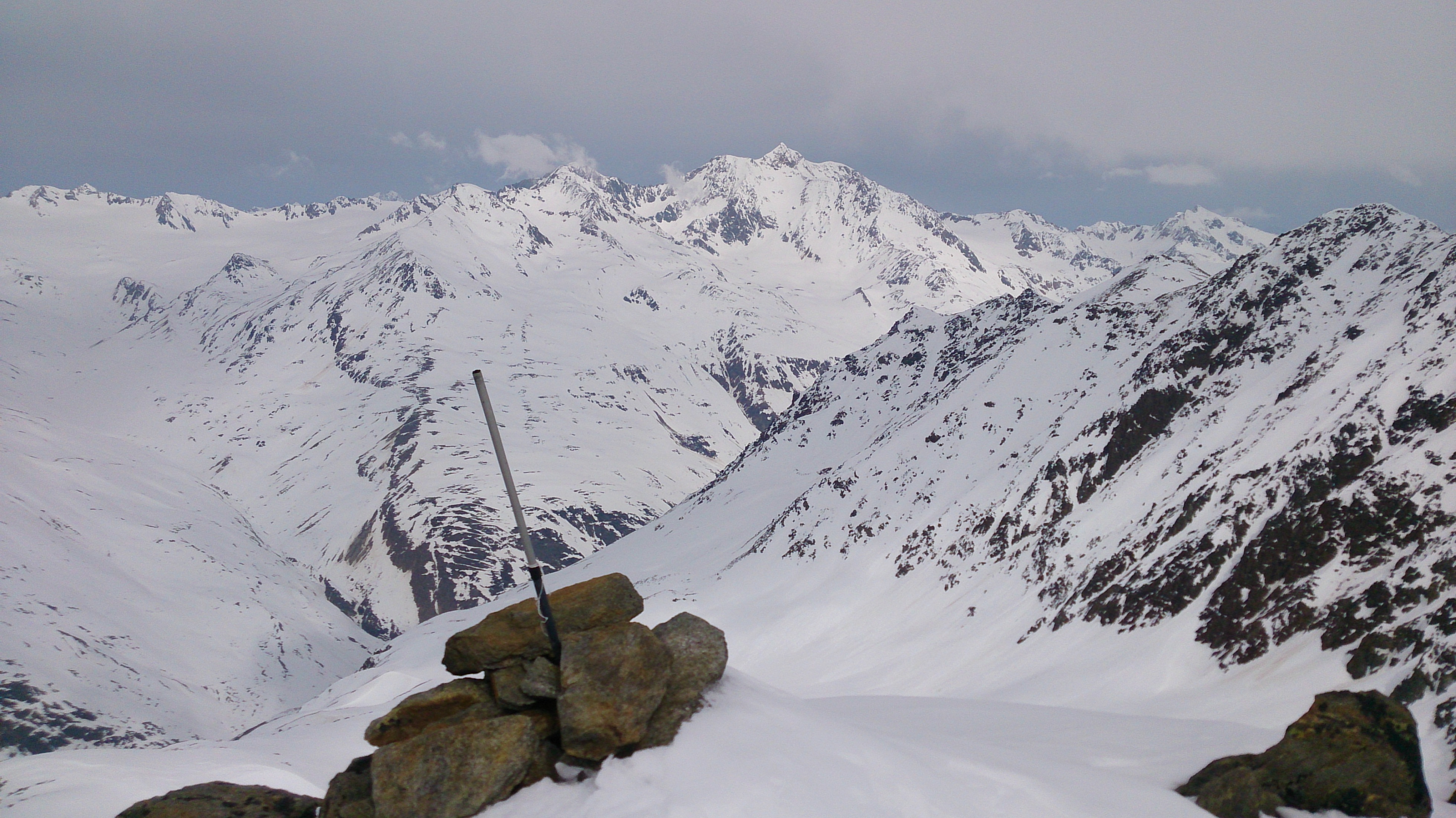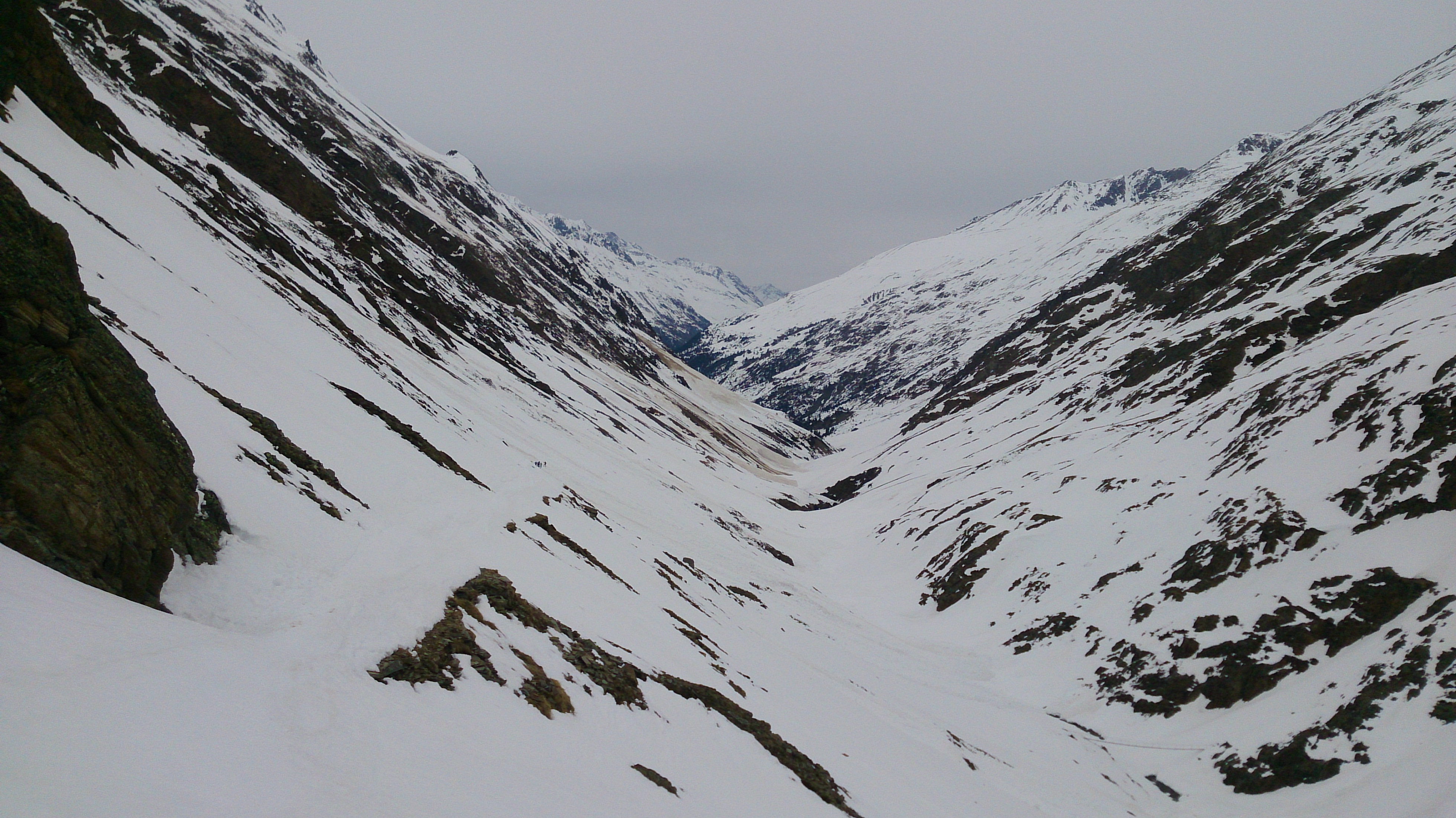 Sonstiges: Vom Hauptkamm drückten heute die Wolken herüber und sorgten für deutlich schlechteres Wetter als die beiden vergangenen Tage. Der Zustieg durch das Niedertal ist wirklich von vielen und großen Lawinen verwüstet - unangenehm zu gehen (immerhin: was schon unten an Schnee ist kann einen nicht mehr einlahnen). Nicht zu spät Harscheisen anlegen, ist zwar in den vielen Gleitpassagen deutlich langsamer, aber bei dem harten Schnee doch wesentlich sicherer.