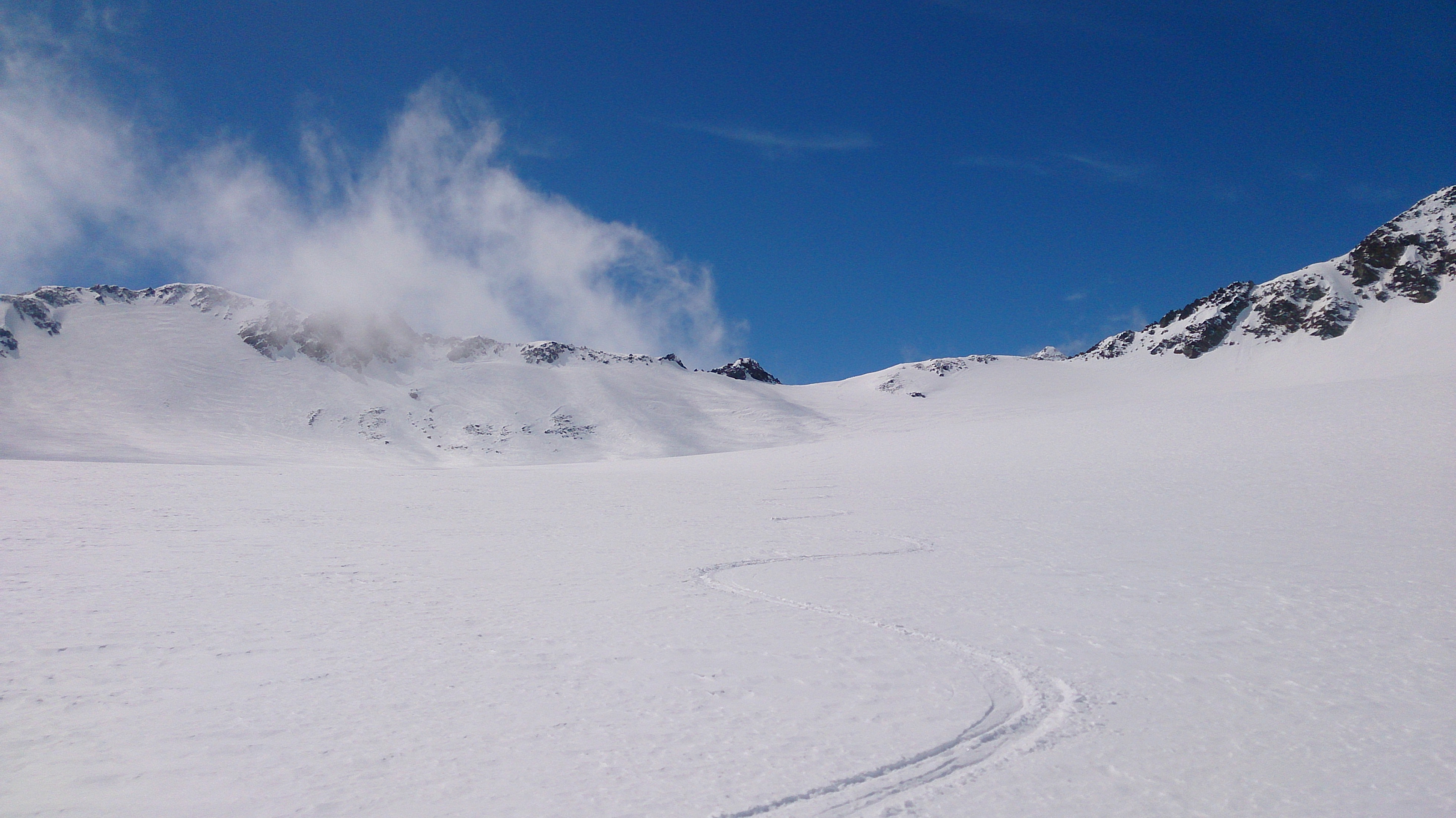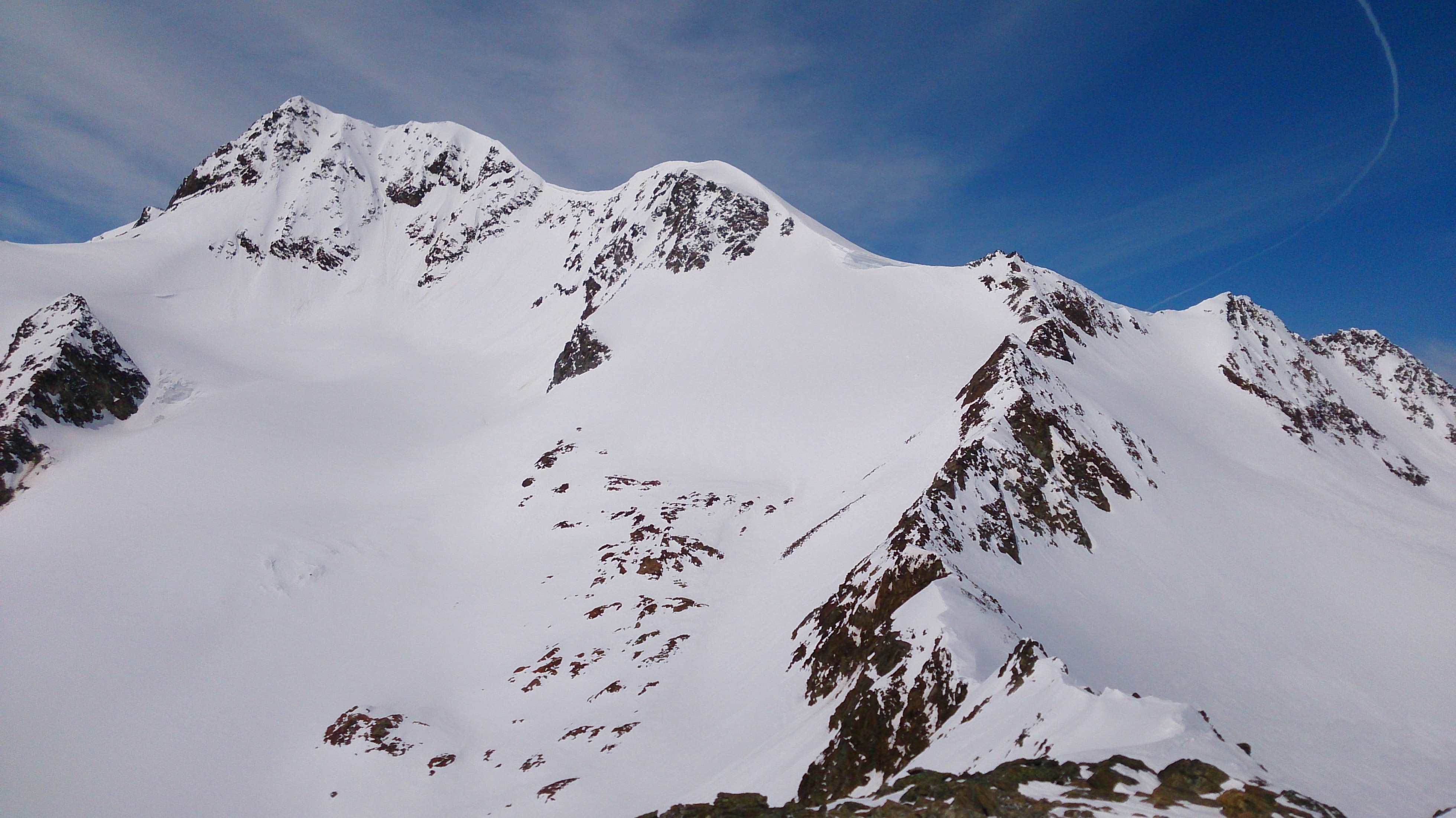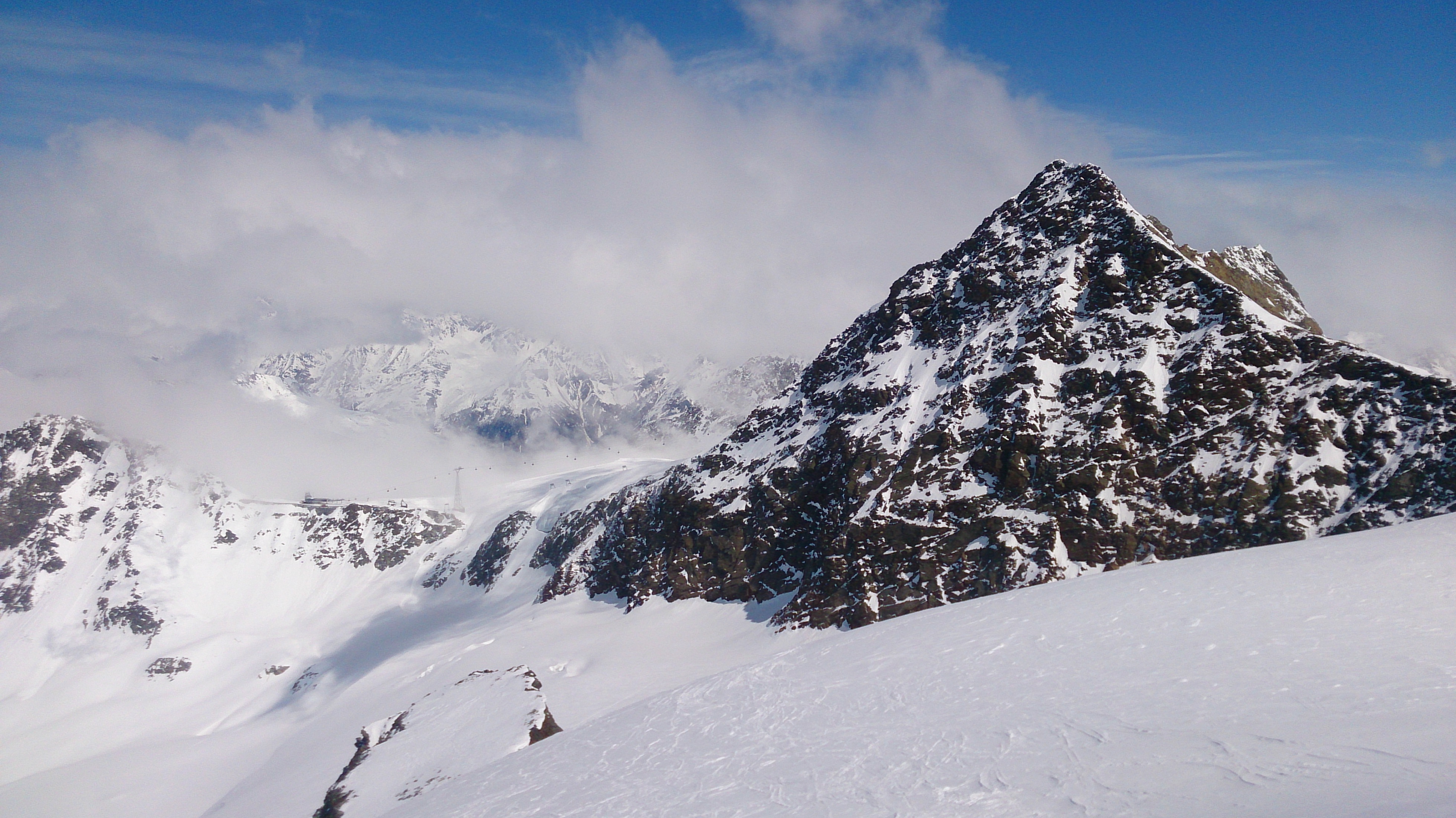 Tourenverhältnisse: genügend Schnee von Vent weg und dank der beschneiten Talabfahrt auch bis nach Sölden hinab; im freien Gelände (überwiegend Gletscher) viel windbeeinflusster Schnee, ab und zu auch guter Pulver