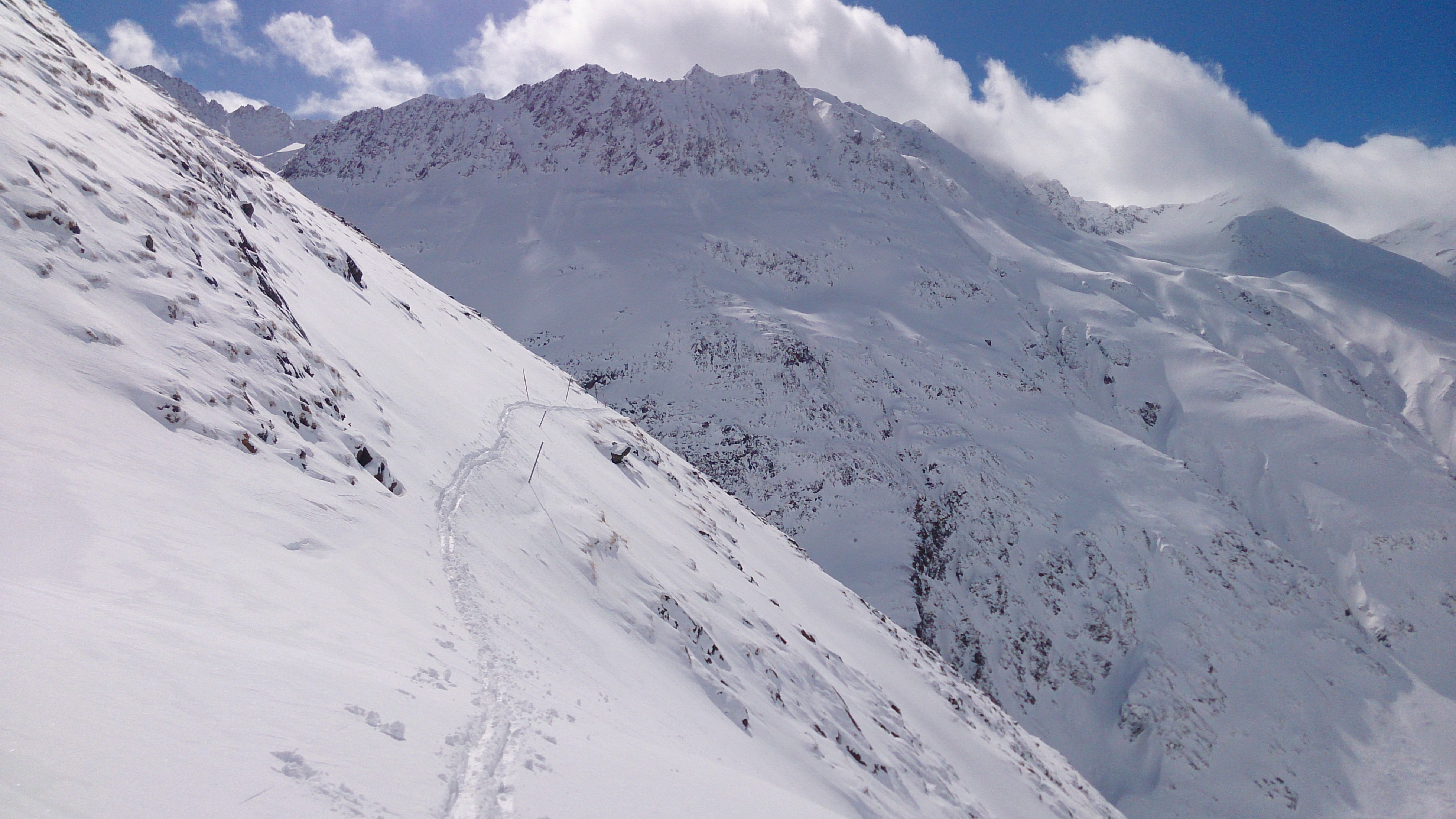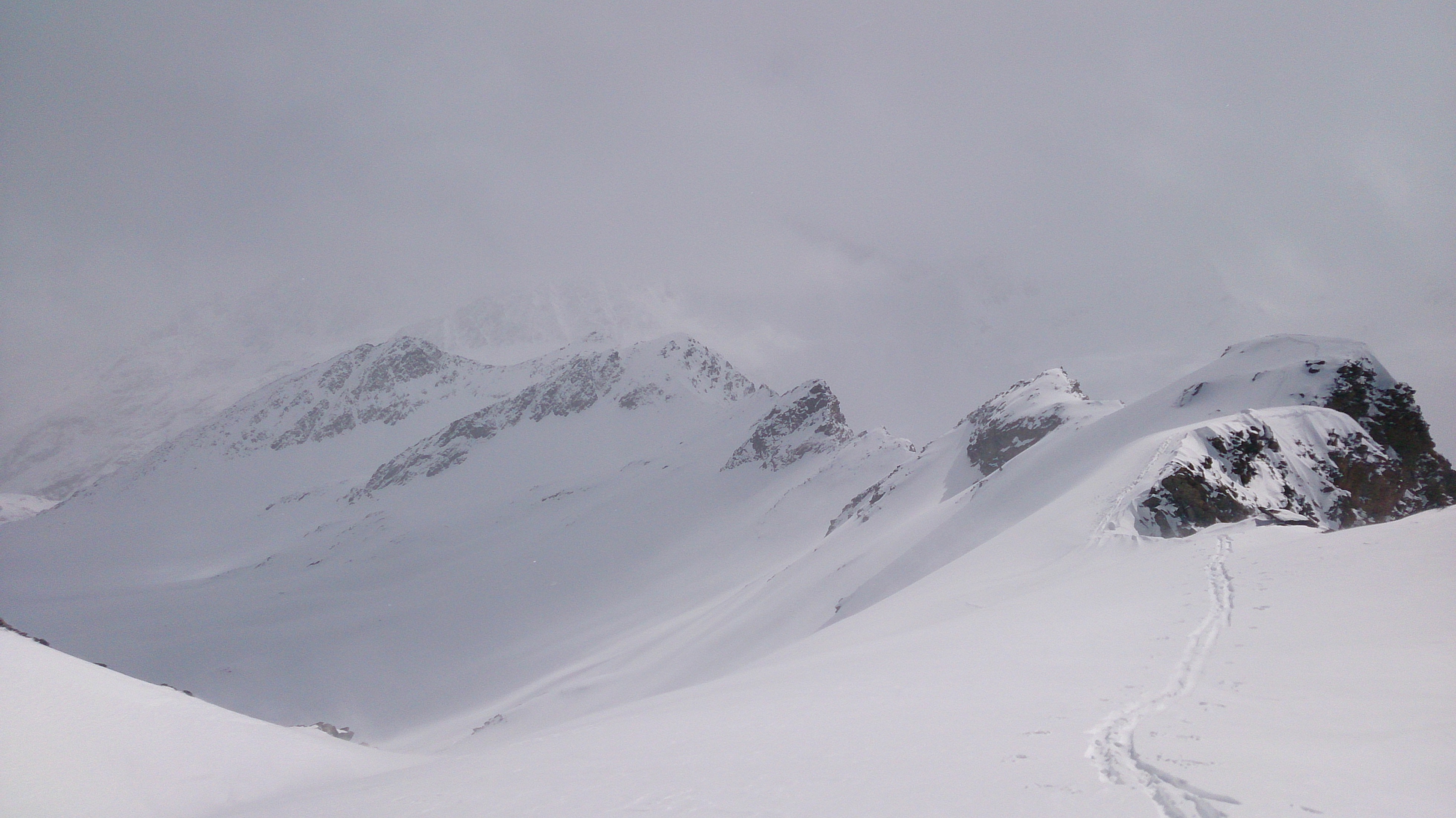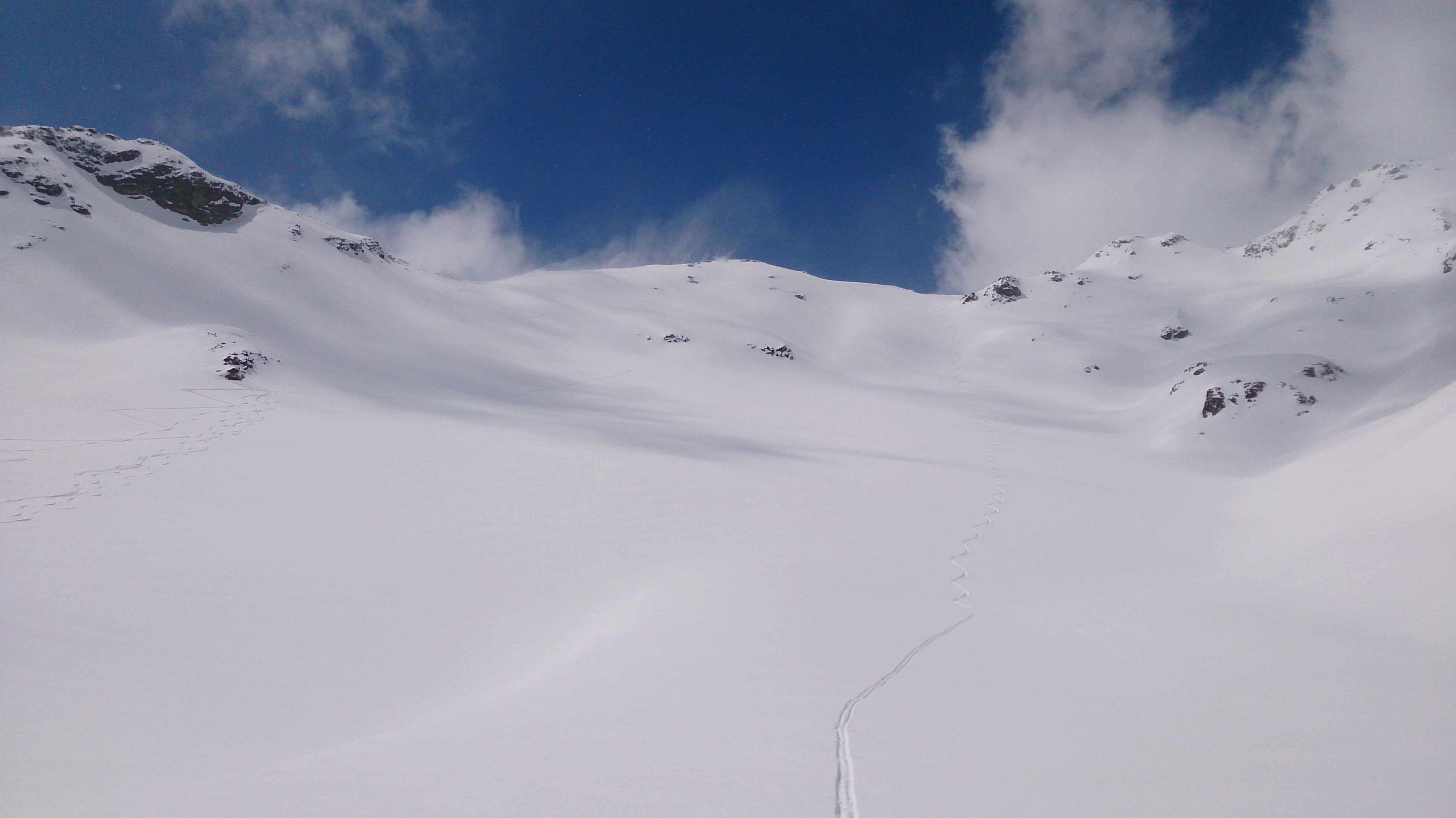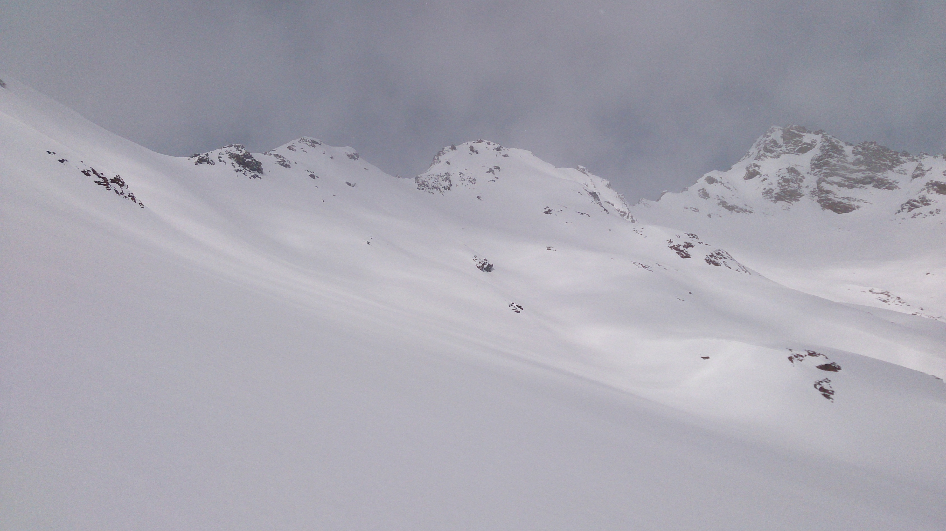 So soll es sein, jedenfalls bei Pulver - Traumabfahrt vom Jöchl, links mein Anstieg in die erste Scharte, von der es am Kamm weiterging: