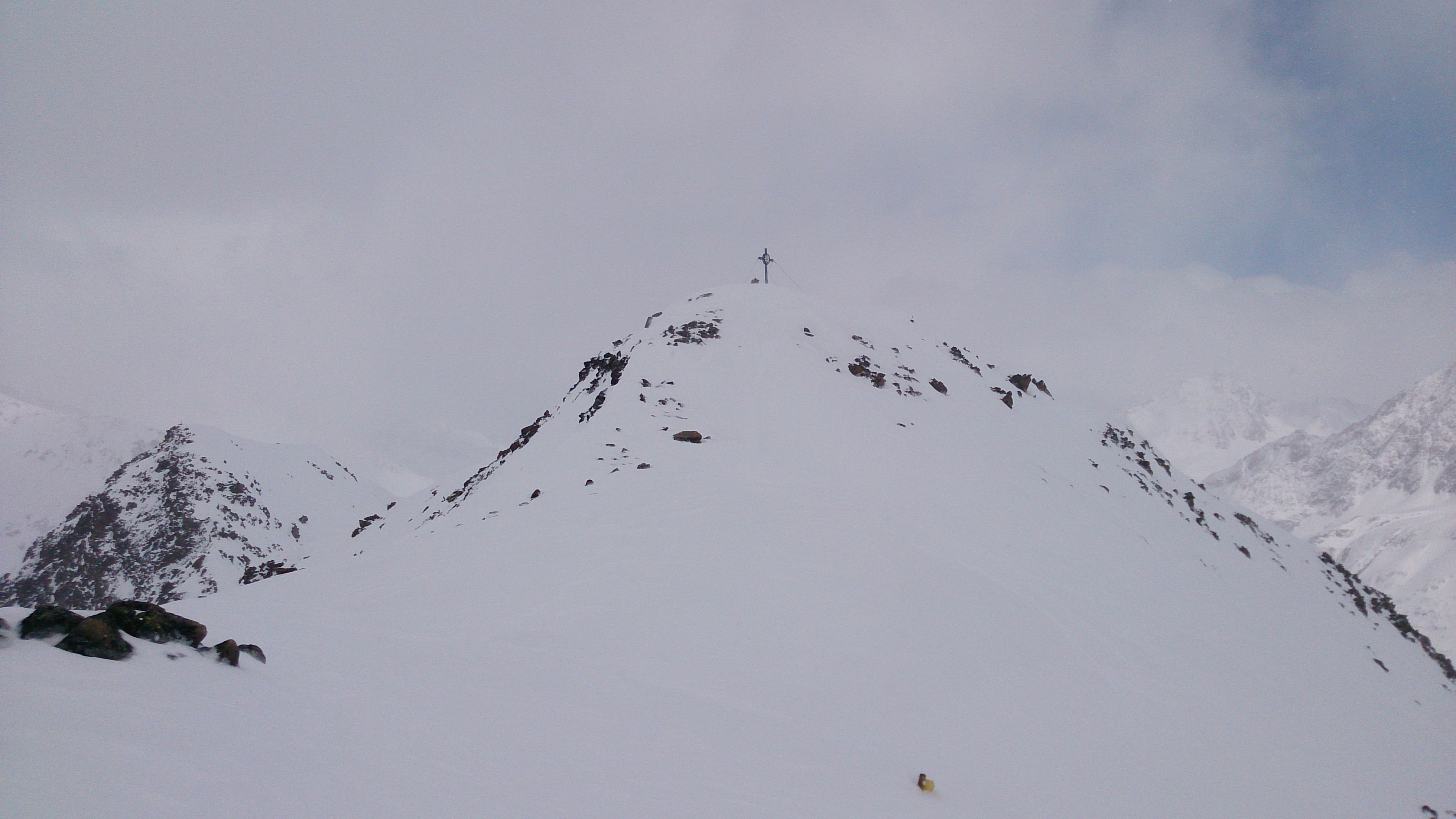 Oben ging es zunächst zu einer Scharte mit Markierung im Grat zwischen P. 3197 und der Kesselwandspitze - in der Karte gibt es da nur das Brandenburger Jöchl, letztlich konnte selbst ein Einheimischer mir nicht sagen, wo das genau ist. Nach der AV-Karte könnte das Brandenburger Jöchl auch noch etwas weiter Richtung Kesselwandspitze sein. In anderen Karten taucht es meistens gar nicht auf, im Internet ist auch nichts zu finden. Ein Abstieg / Abfahrt von meinem Joch Richtung Kesselwandferner dürfte jedenfalls nicht möglich sein bzw. abseilen erfordern.