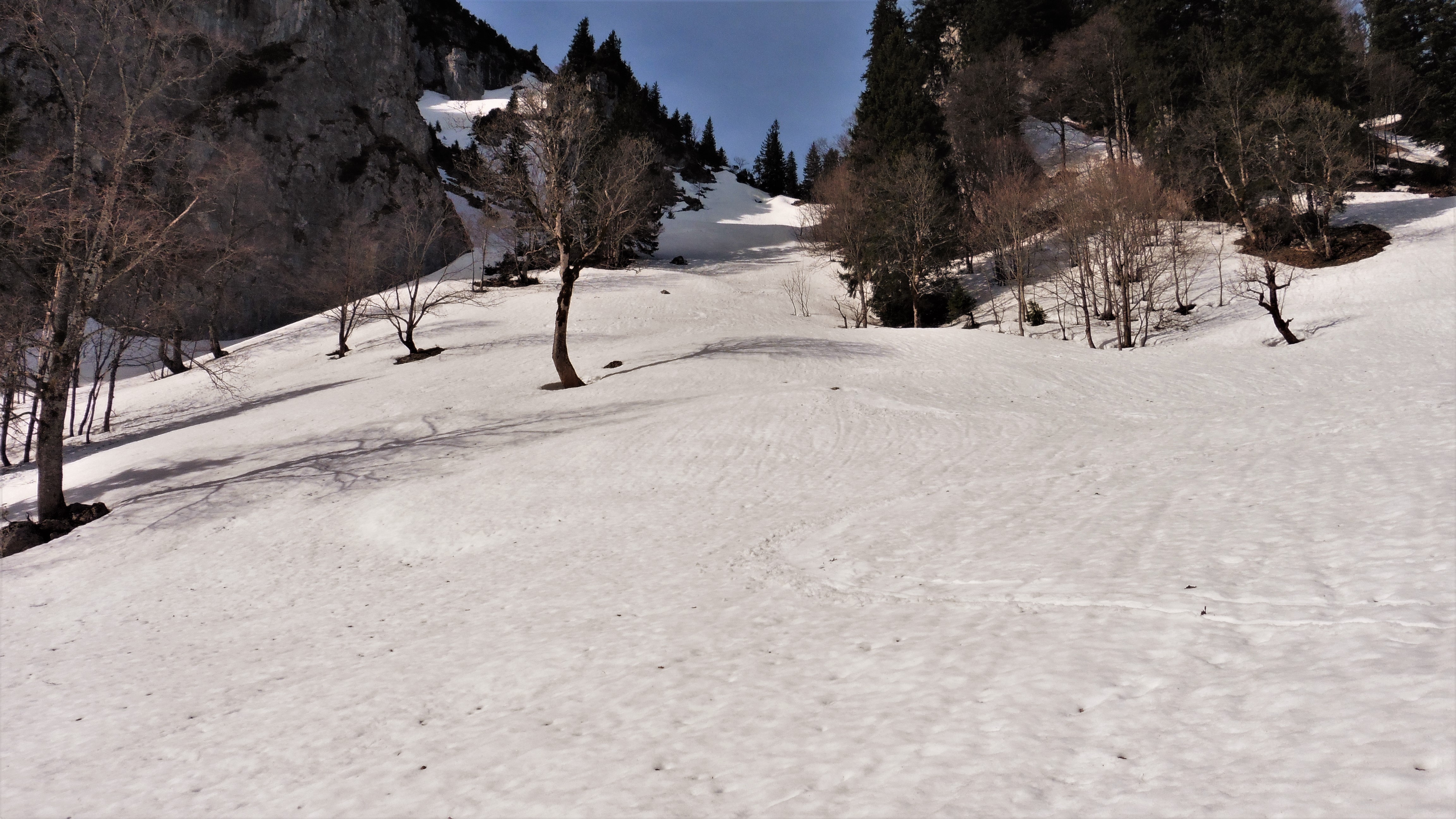 Prognose: im unteren Bereich apert die Route langsam aus, daher nicht mehr empfehlenswert; generell ist dies eher ein Hochwintertour, da die Rinne erst am Nachmittag auffirnt;