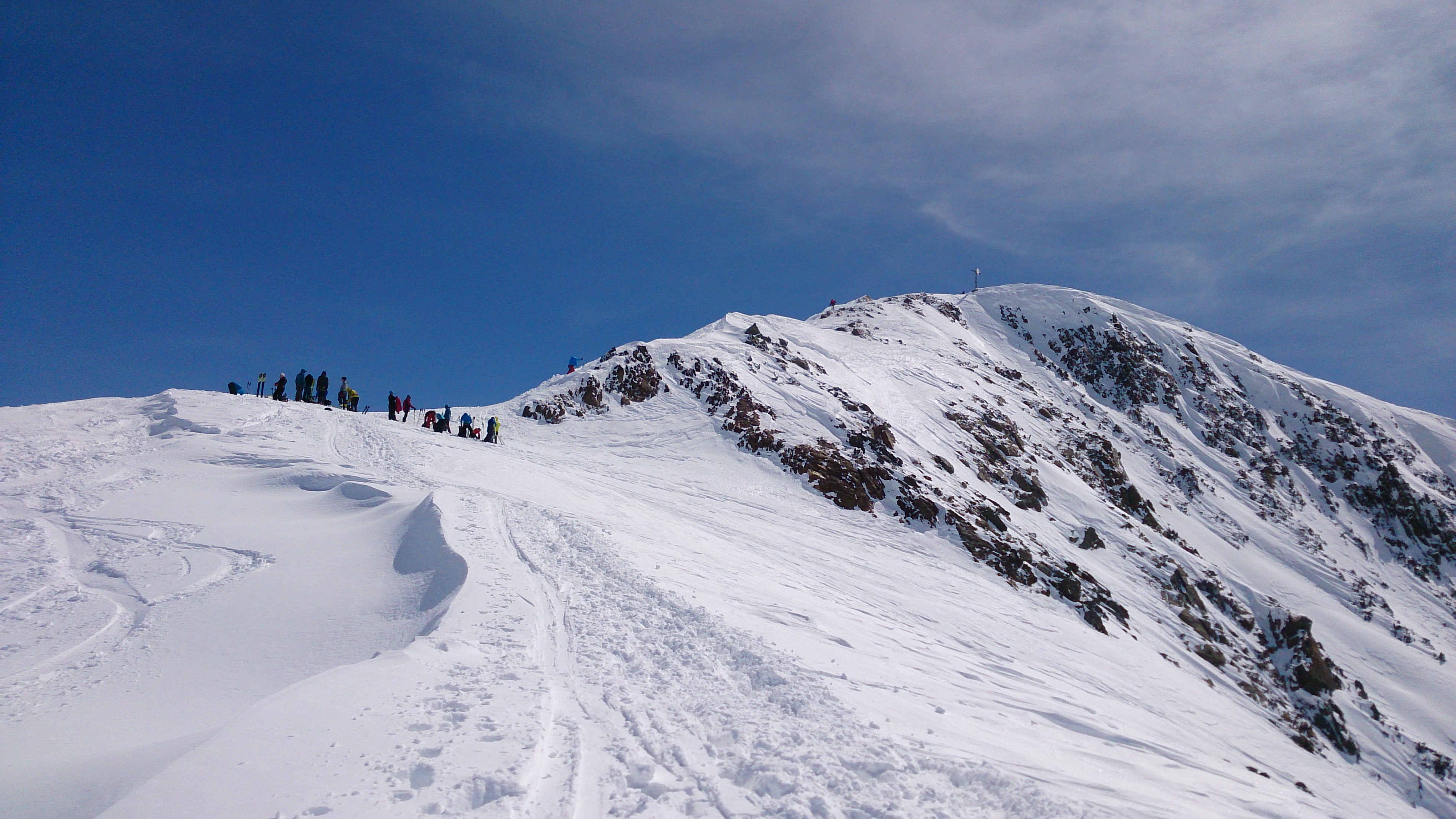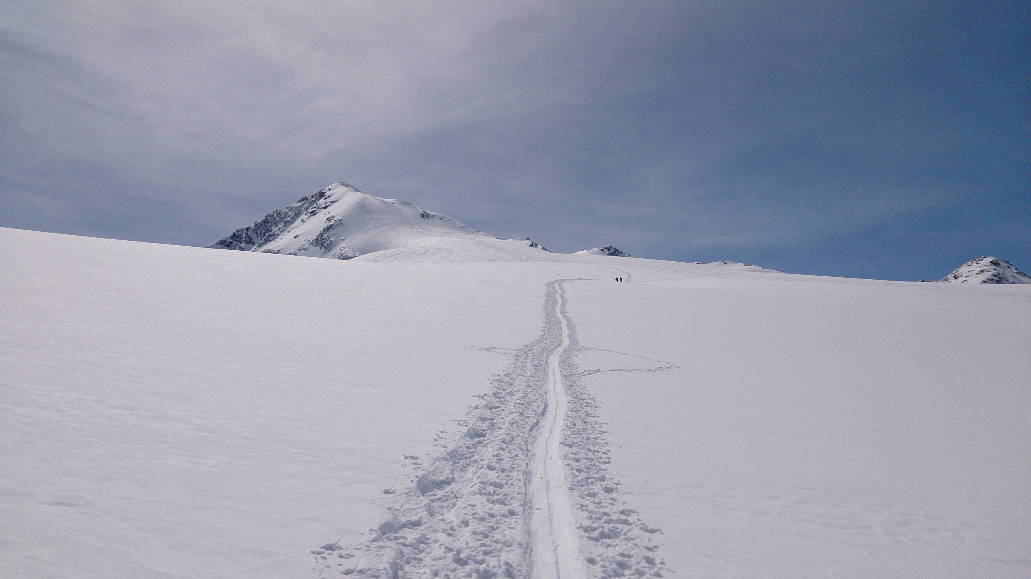 Links sieht man schon das Skidepot, Gipfelanstieg zur Zeit weicher Schnee (keine Steigeisen nötig, aber sie mitzunehmen ist sicher sinnvoll):