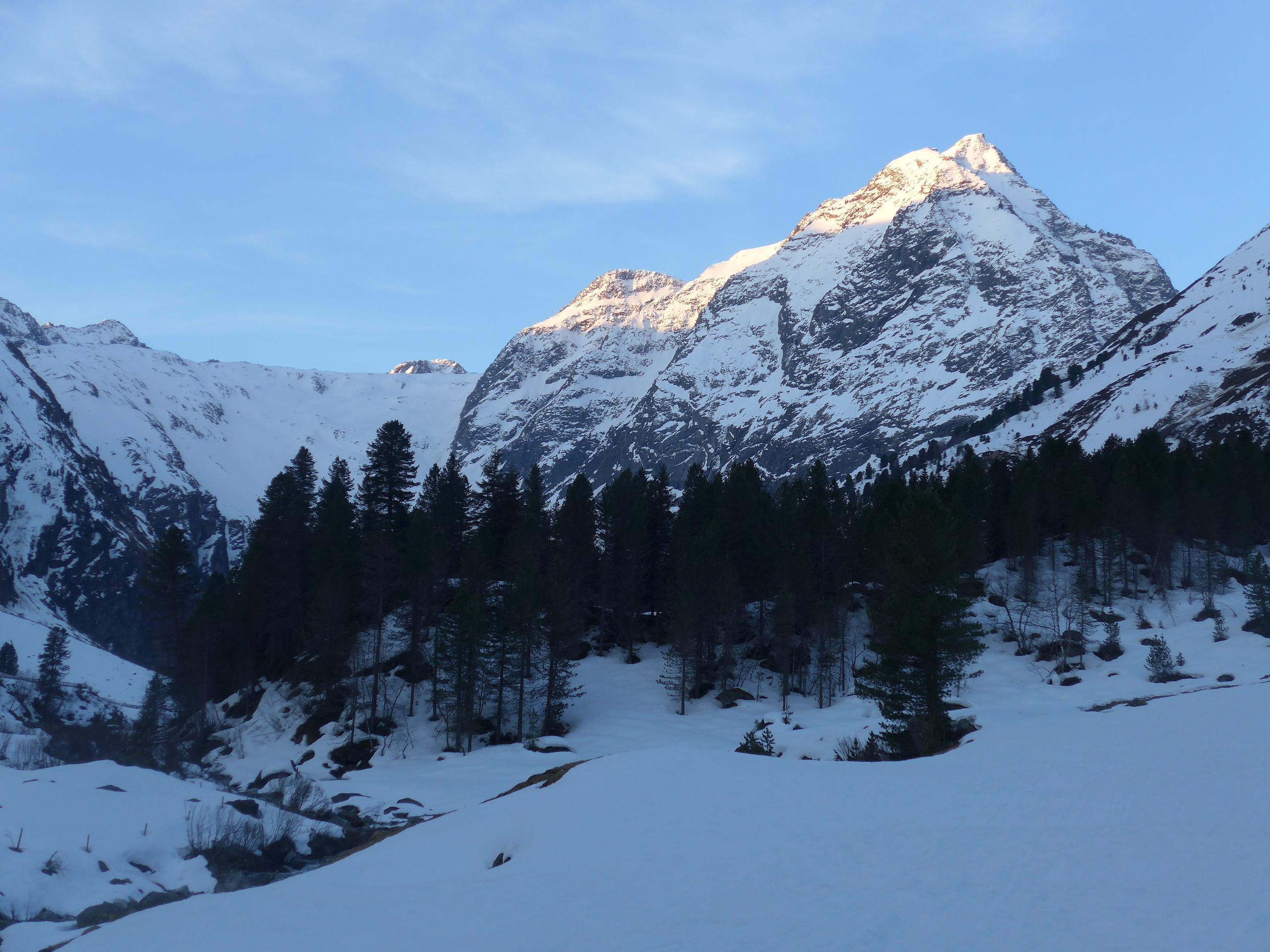 Bestes Wetter mit Sonnenschein den ganzen Tag. Beim Start um ca. 6:15 hatte es schon ca. 2°C. Fast zu spät; der Parkplatz war schon voll. Schnee war noch gut gangbar, kein Einsinken bis zum Gipfel. In der Rampe gab es im ersten Teil Tragestücke, der Weg in ihr bis zum Schöntal war teilweise recht hakelig, aber sicherer als der frühere Weg.