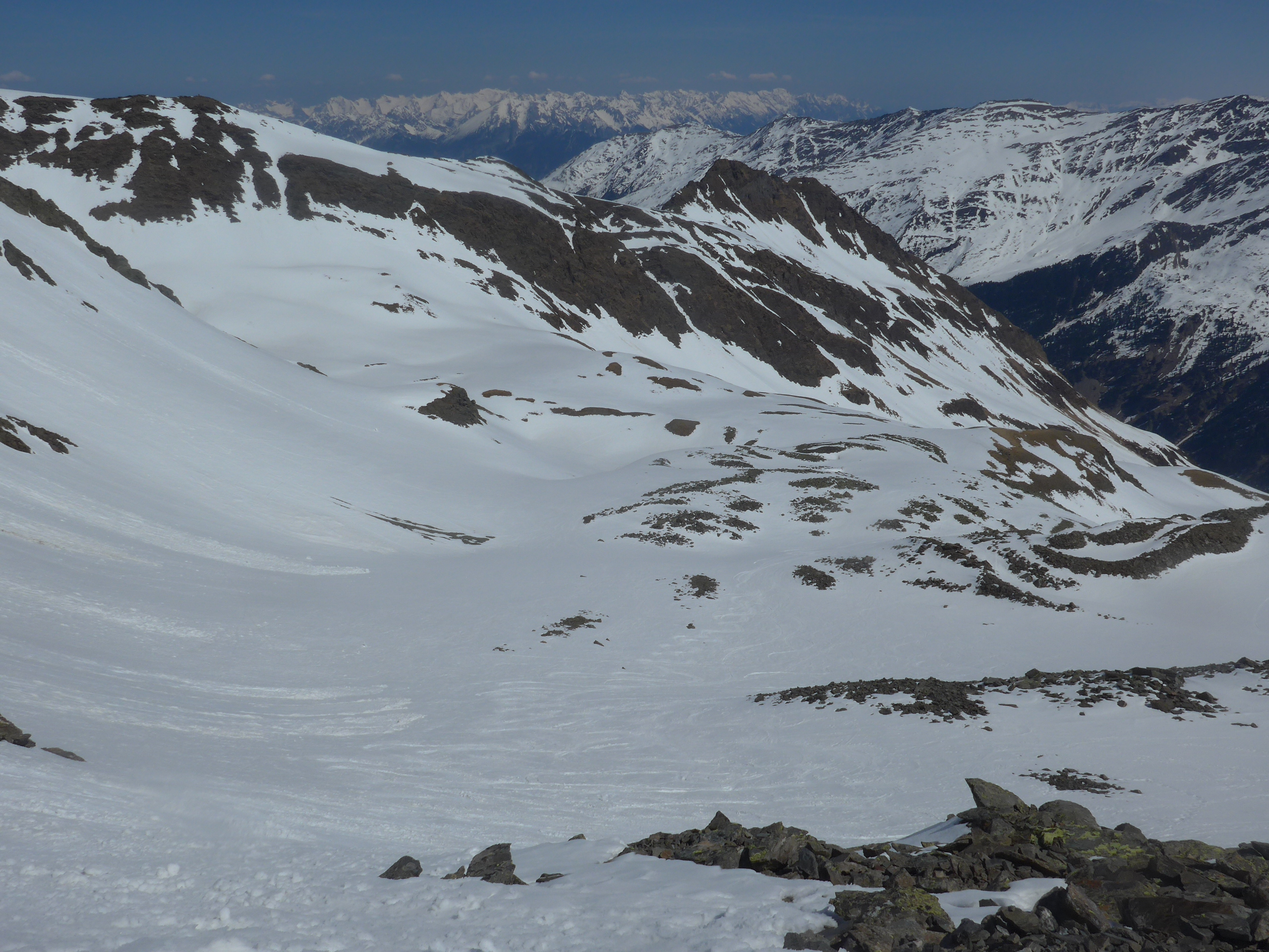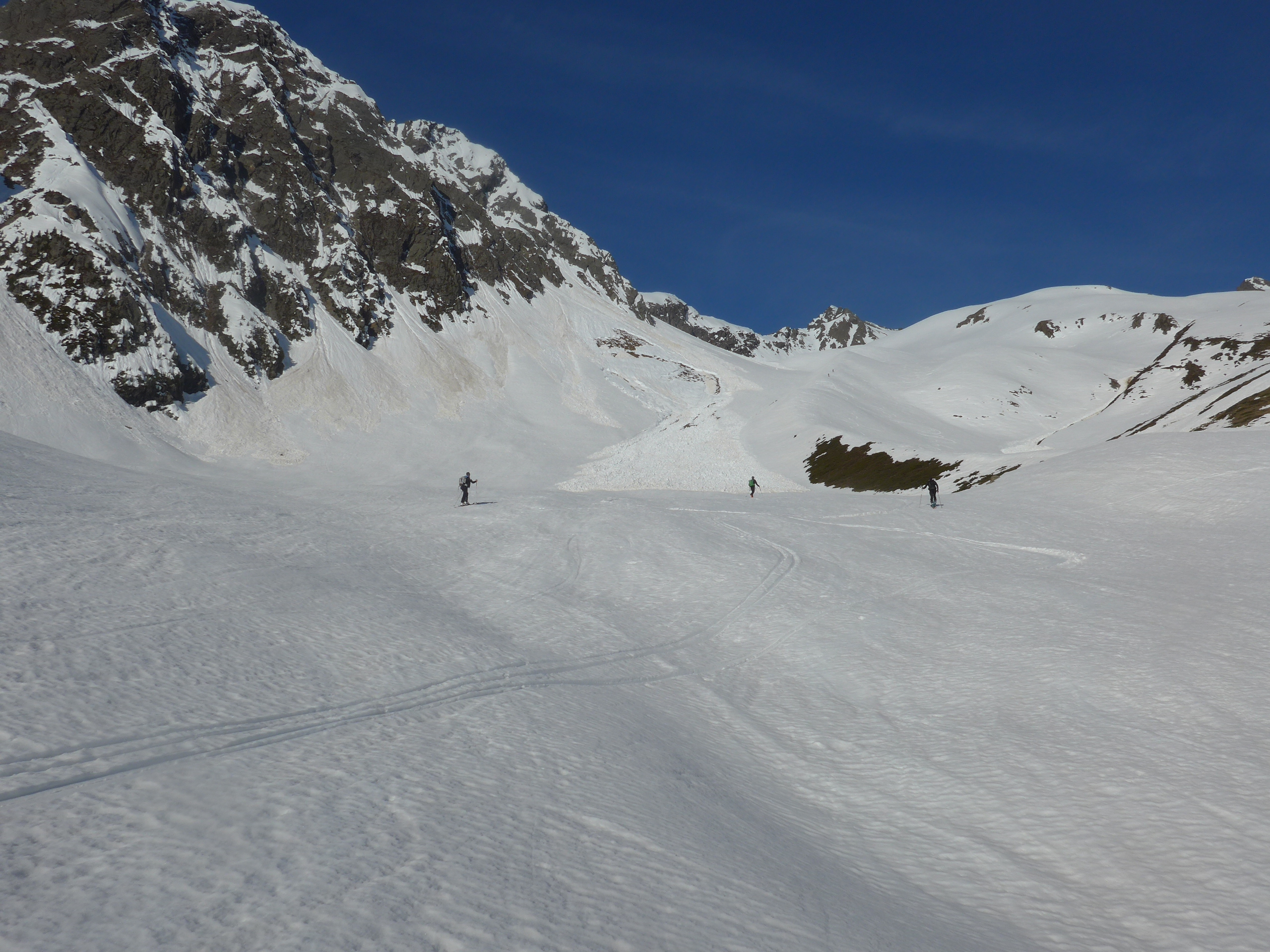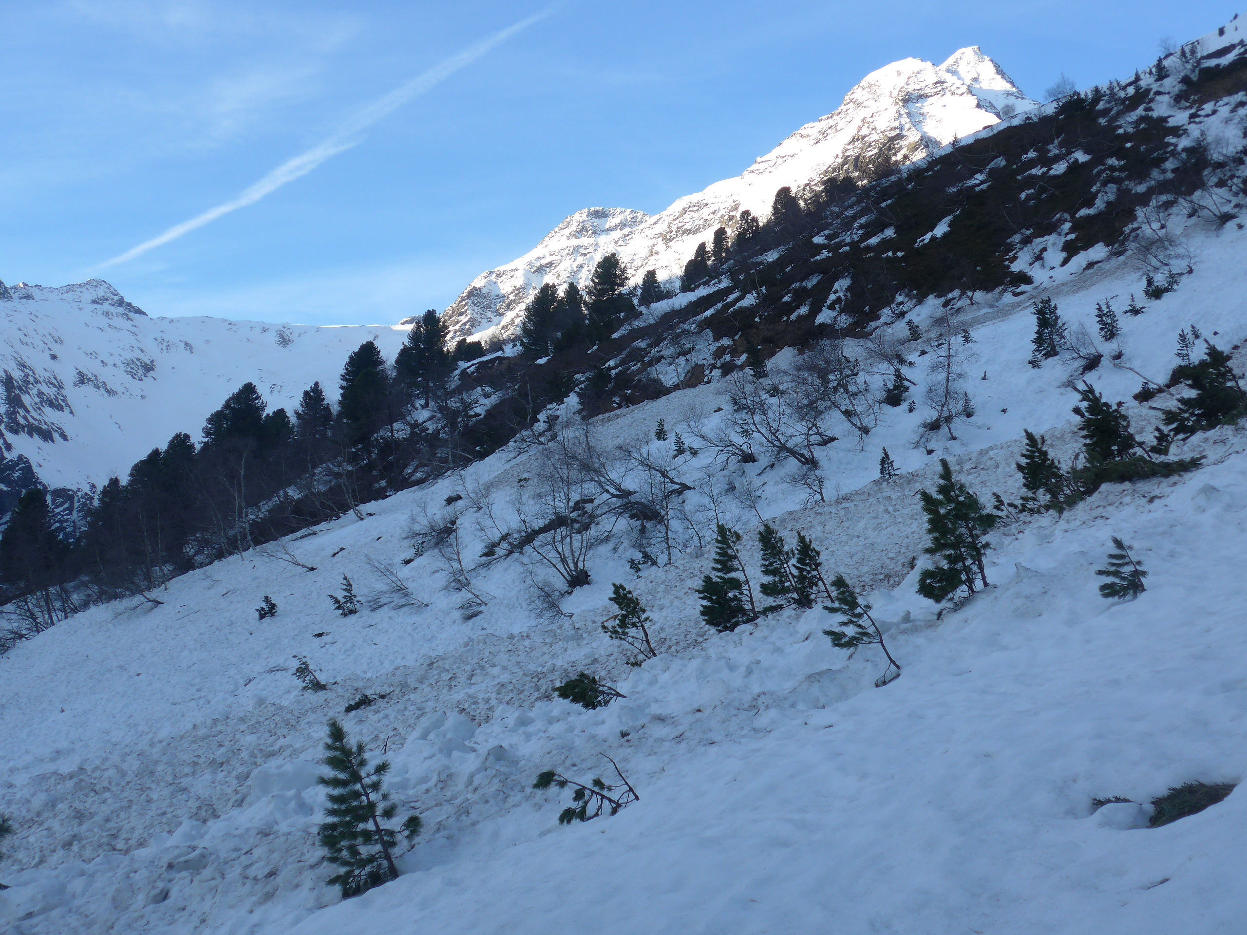 Es gab bereits viele, auch größere Entladungen: Unten über den Sommerweg zum Westfalenhaus ging eine größere Lawine ab, die umgangen werden musste, dann eine weitere am Lawinenstrich vor der Abbiegung zur Rampe. Im Schöntal gingen aus den seitlichen Flanken zwei weitere größere Lawinen ab, die sich in den beiden Senken neben dem mittleren Gratrücken sammelten. Der Weg verlief daher auf dem teilw. steilen Gratrücken. Den Flanken sollte man nicht zu nahe kommen.