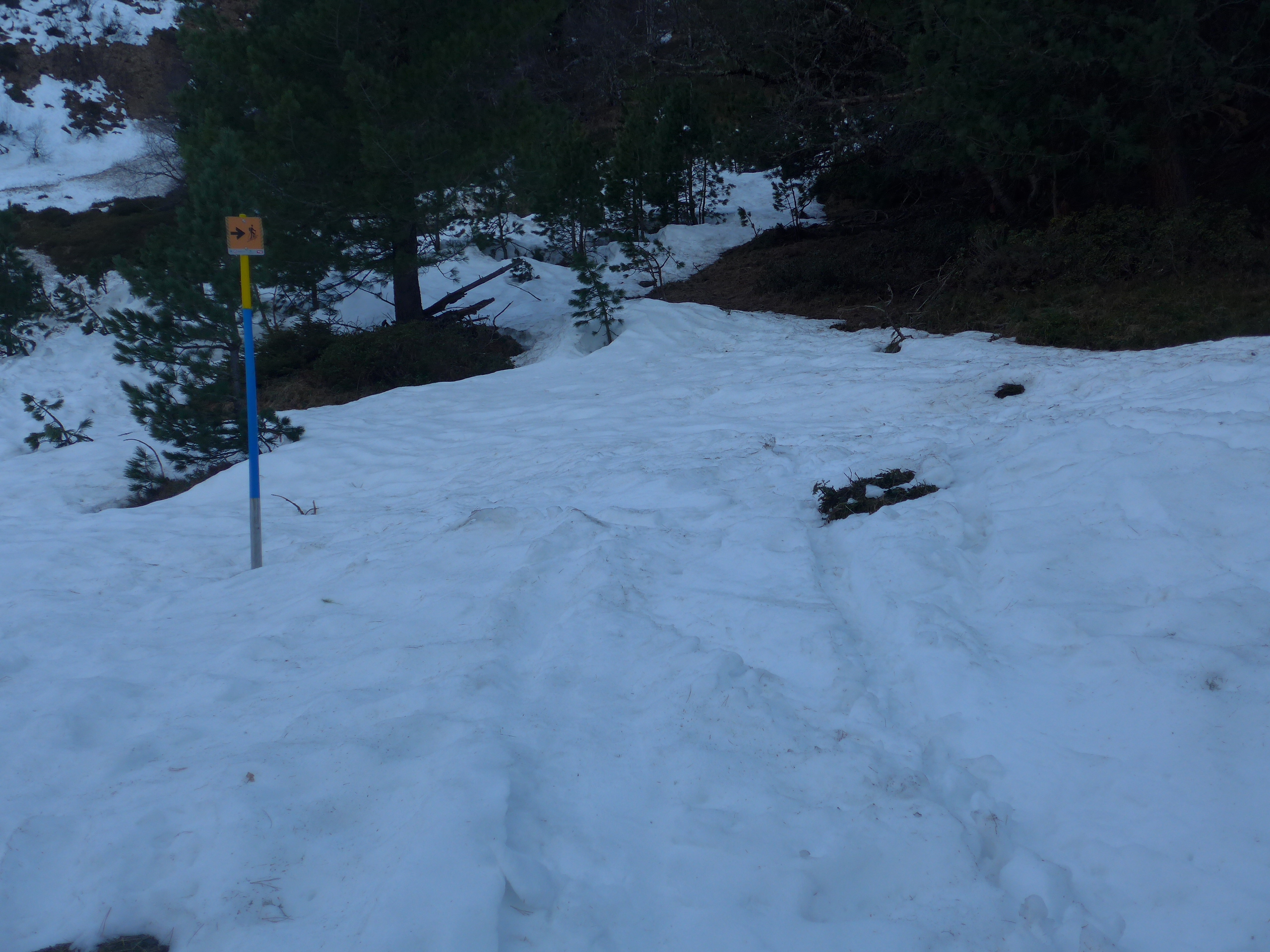 Die Schneeauflage ist sehr gut, kein Steinkontakt bis zum Waldstück. In der Rampe auf Wurzeln und Baumstöcke aufpassen!