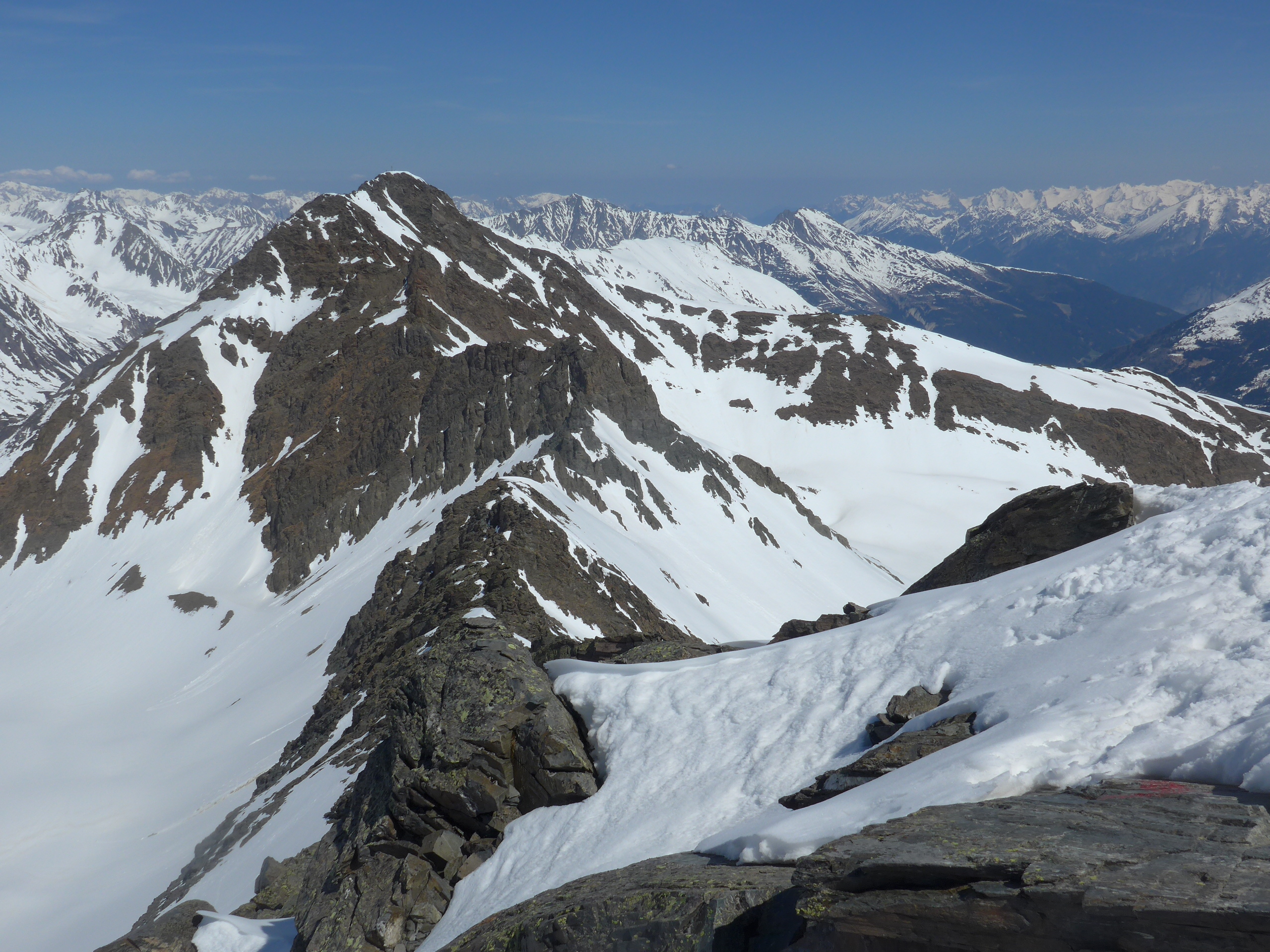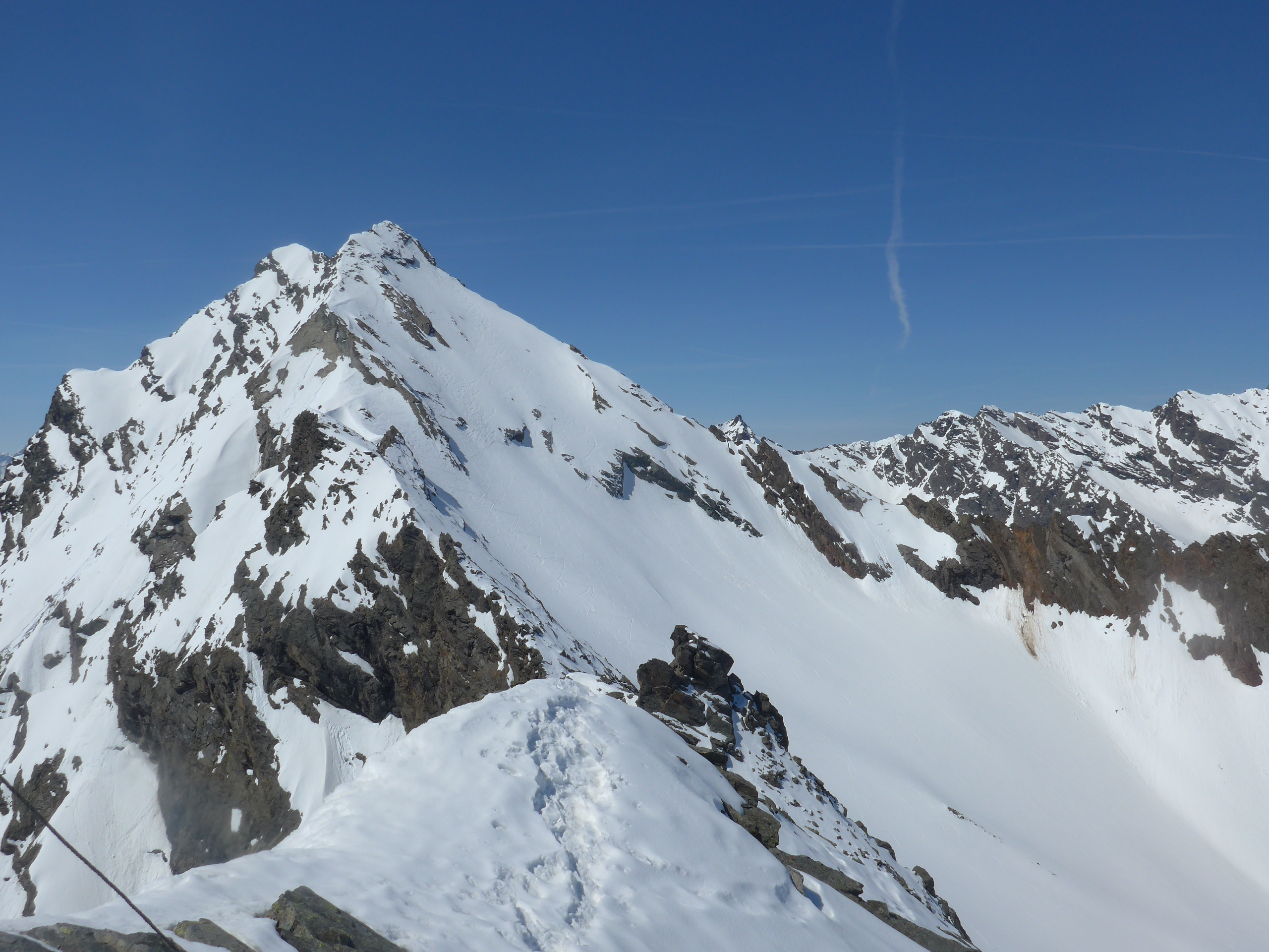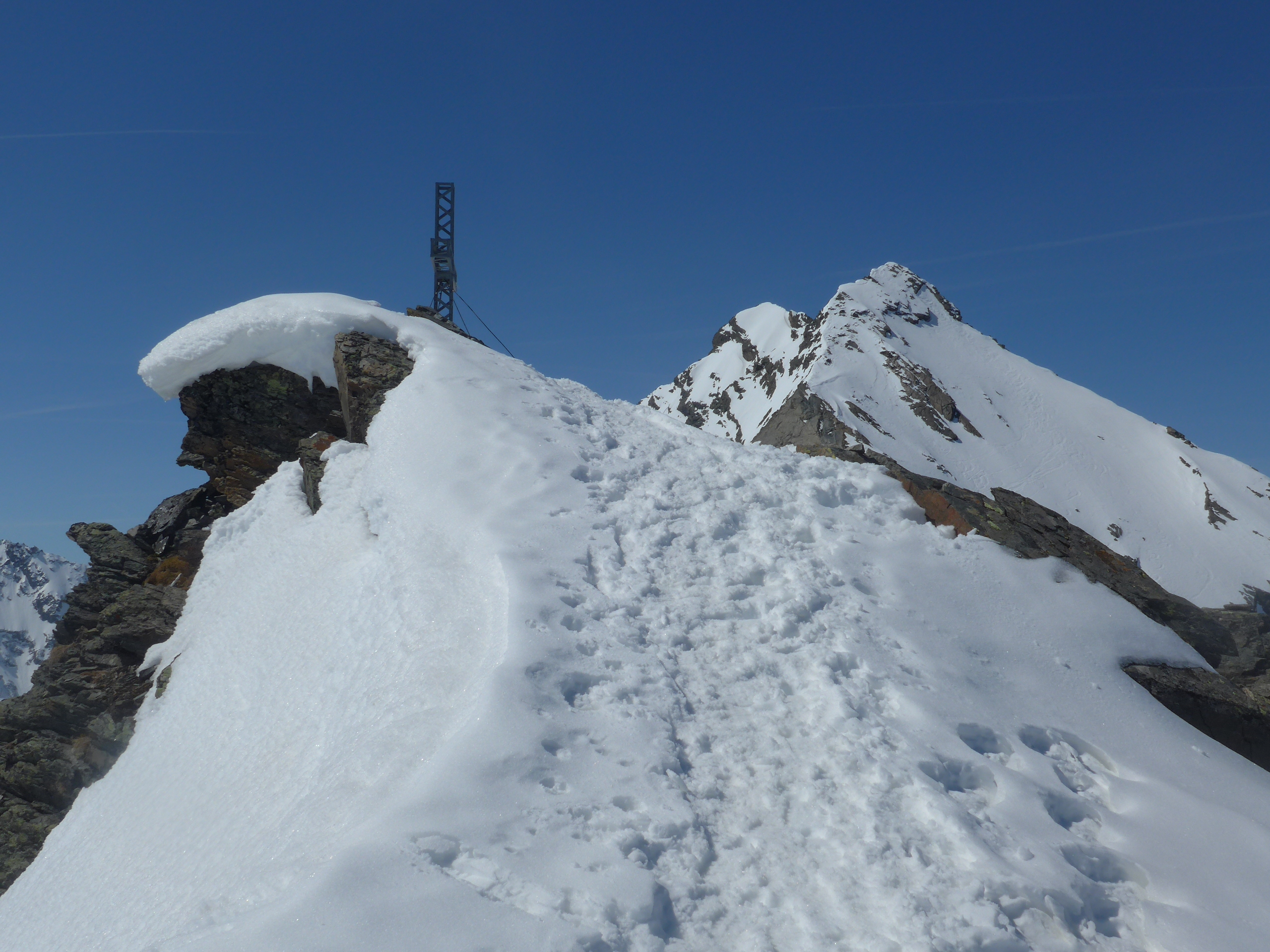 Der steile Gipfelhang konnte mit Skiern begangen werden, aber eher mühsam. Ab der Mitte bietet sich ein Skidepot an, von dem man auch zu Fuß per Schneestapfen in festem Schnee zum Gipfel gehen kann. Der Gipfel kann mit Ski nicht bestiegen werden, es gab aber guten Stapfschnee bis zum Kreuz.