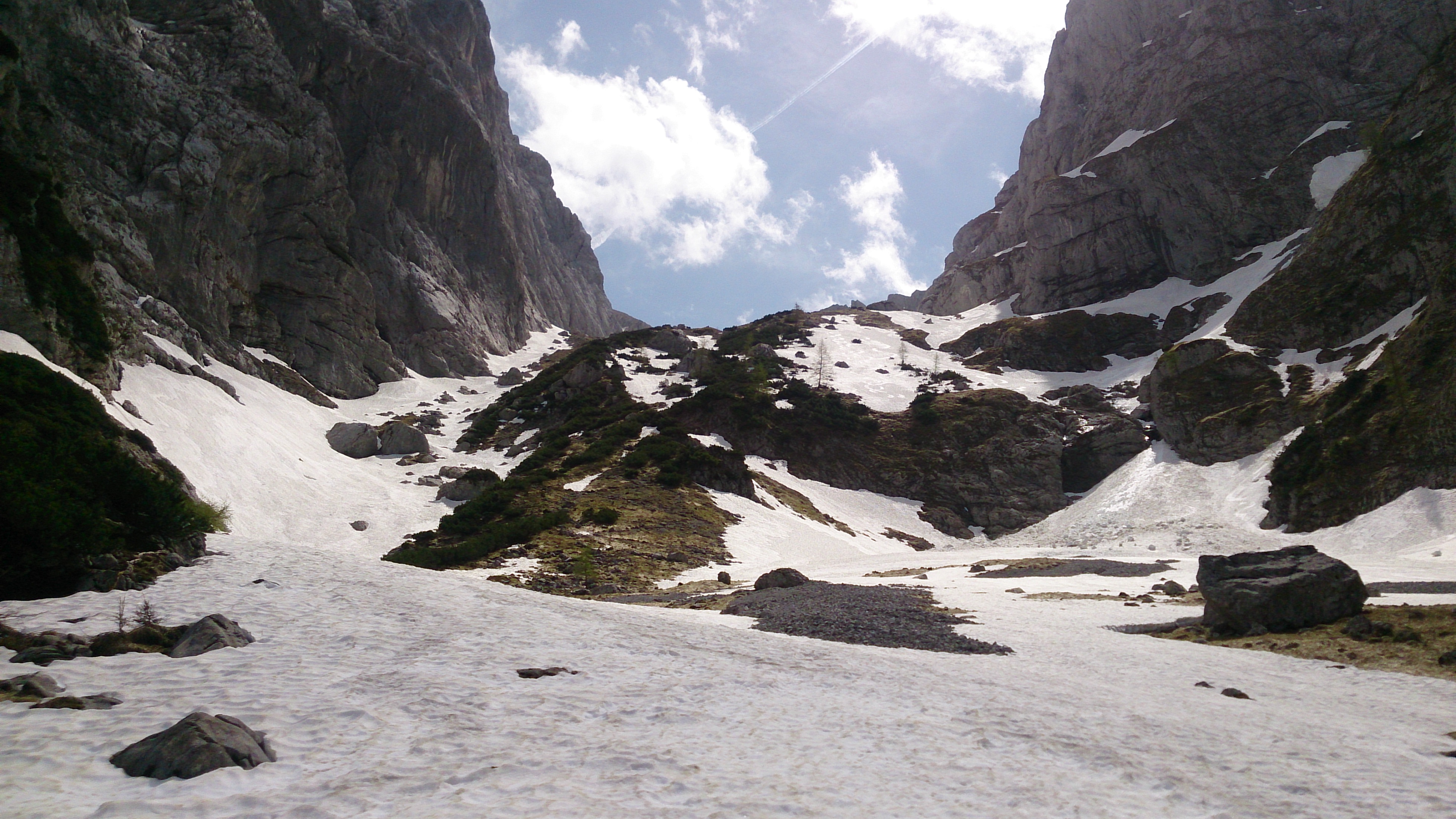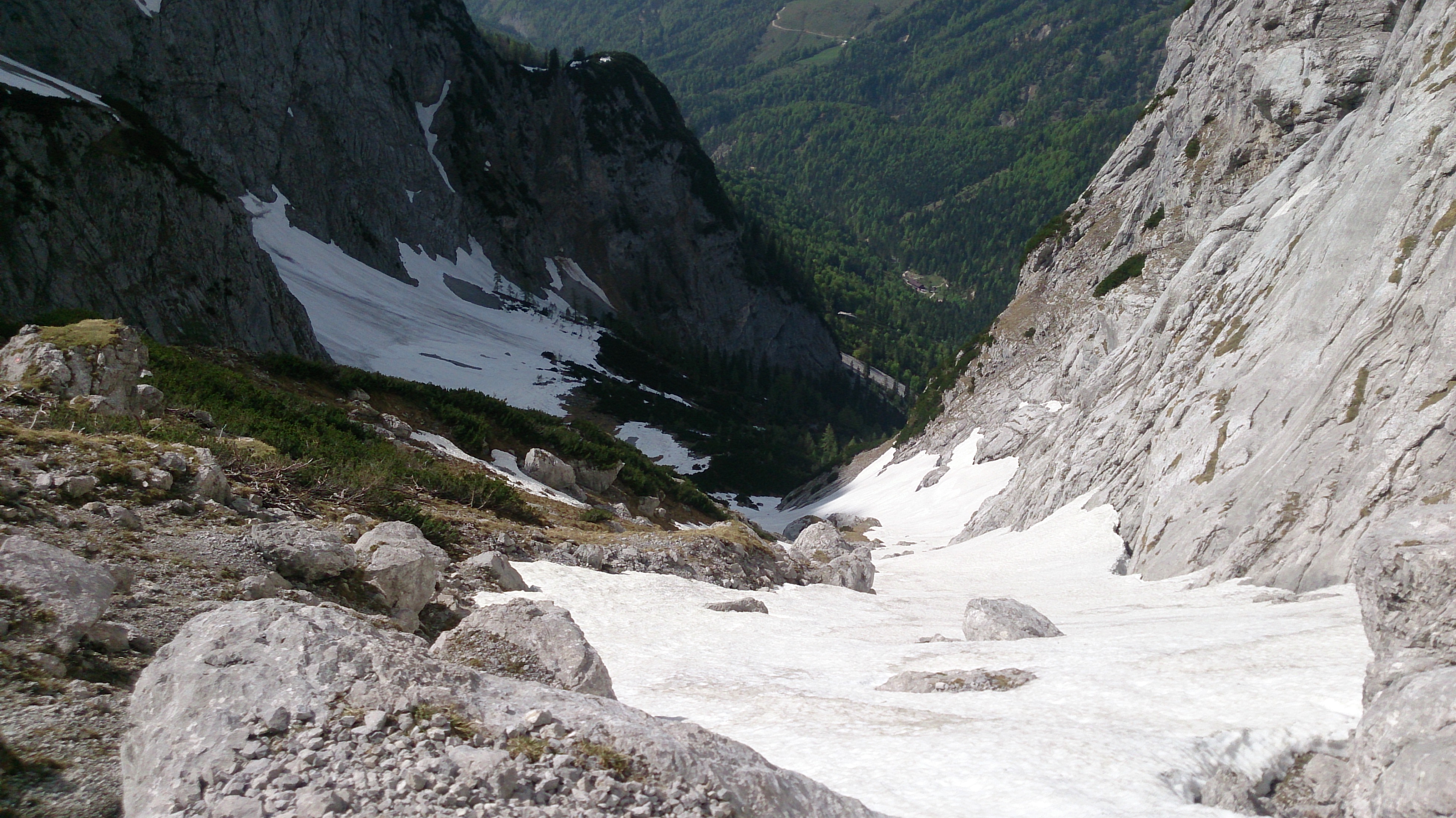 Blick von Hinterbärenbad zurück, über das Schneeband links unter den Felsen ging es bis fast in den Talboden: