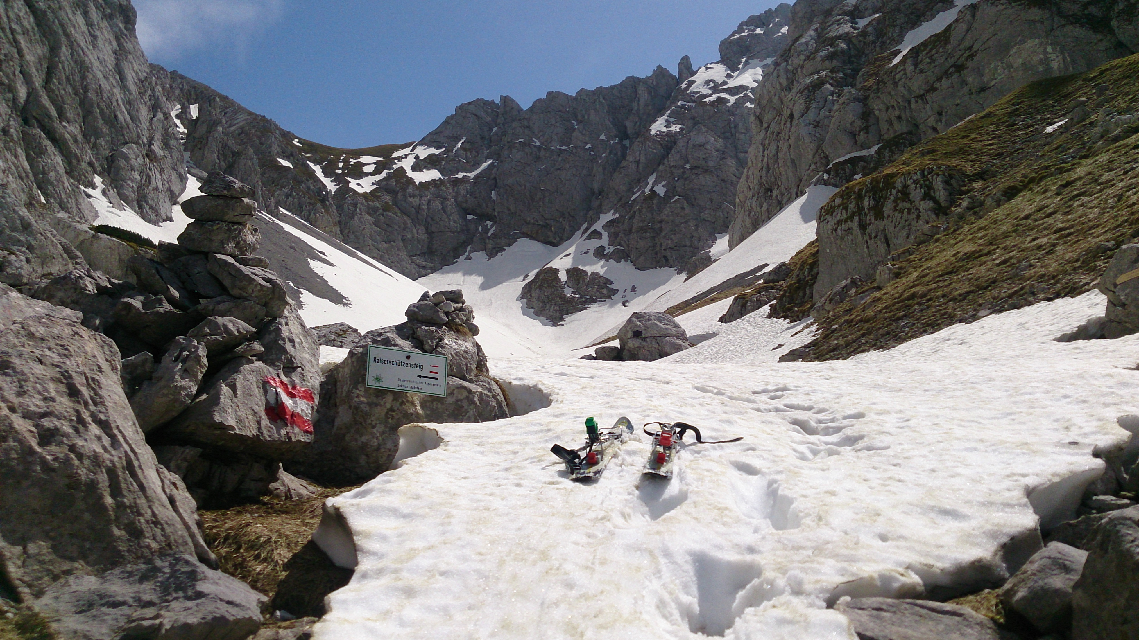Bei der Abfahrt gab es auch am Nachmittag noch guten Sommerschnee. Es liegen halt schon kleinere Steine auf dem Schnee, also nichts für die guten Skier. Ich habe mich in Abfahrtsrichtung immer ganz rechts gehalten, so ging es mit mehreren Querungen (zu Fuß) auf allerletzten Schneeresten bis fast in den Talboden. Tipp: Nach dem letzten Schneefeld unter den Felsen rechts den Rest zu Fuß gerade hinunter. Nicht zum Steig queren - mühsam und teilweise unangenehmes Gelände.