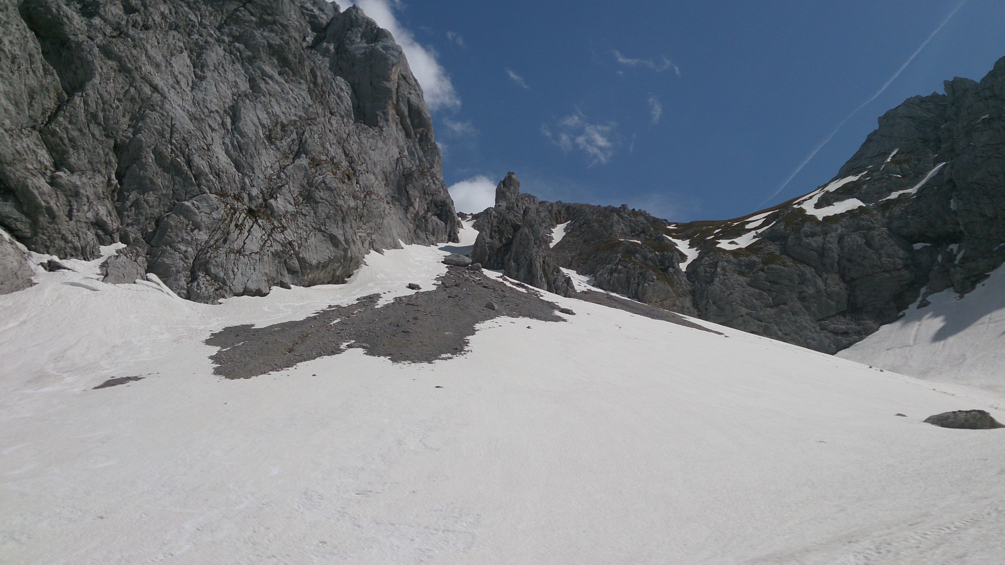 Tourenverhältnisse: Sommerschnee, auf wirklich allerletzten Resten mit einigen Rinnenwechseln und aperen Stellen noch fast bis in den Talboden möglich