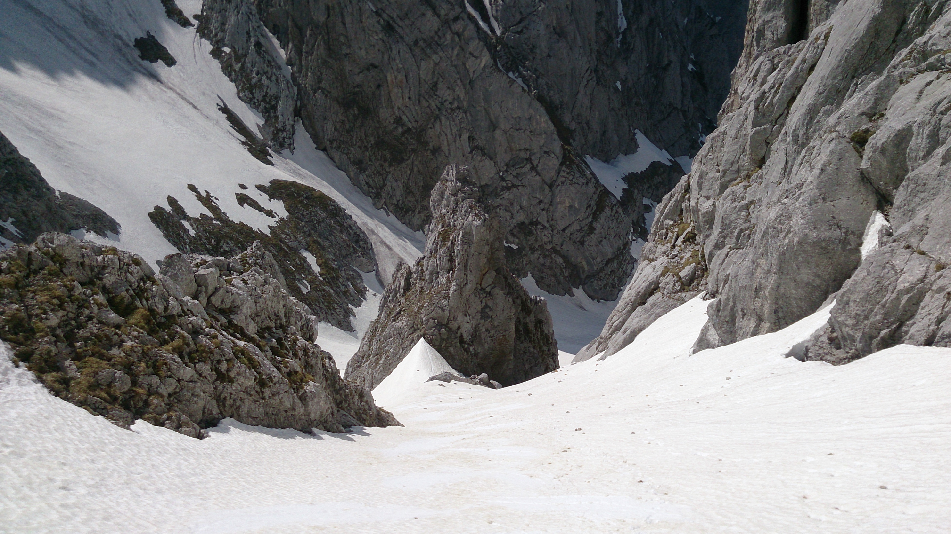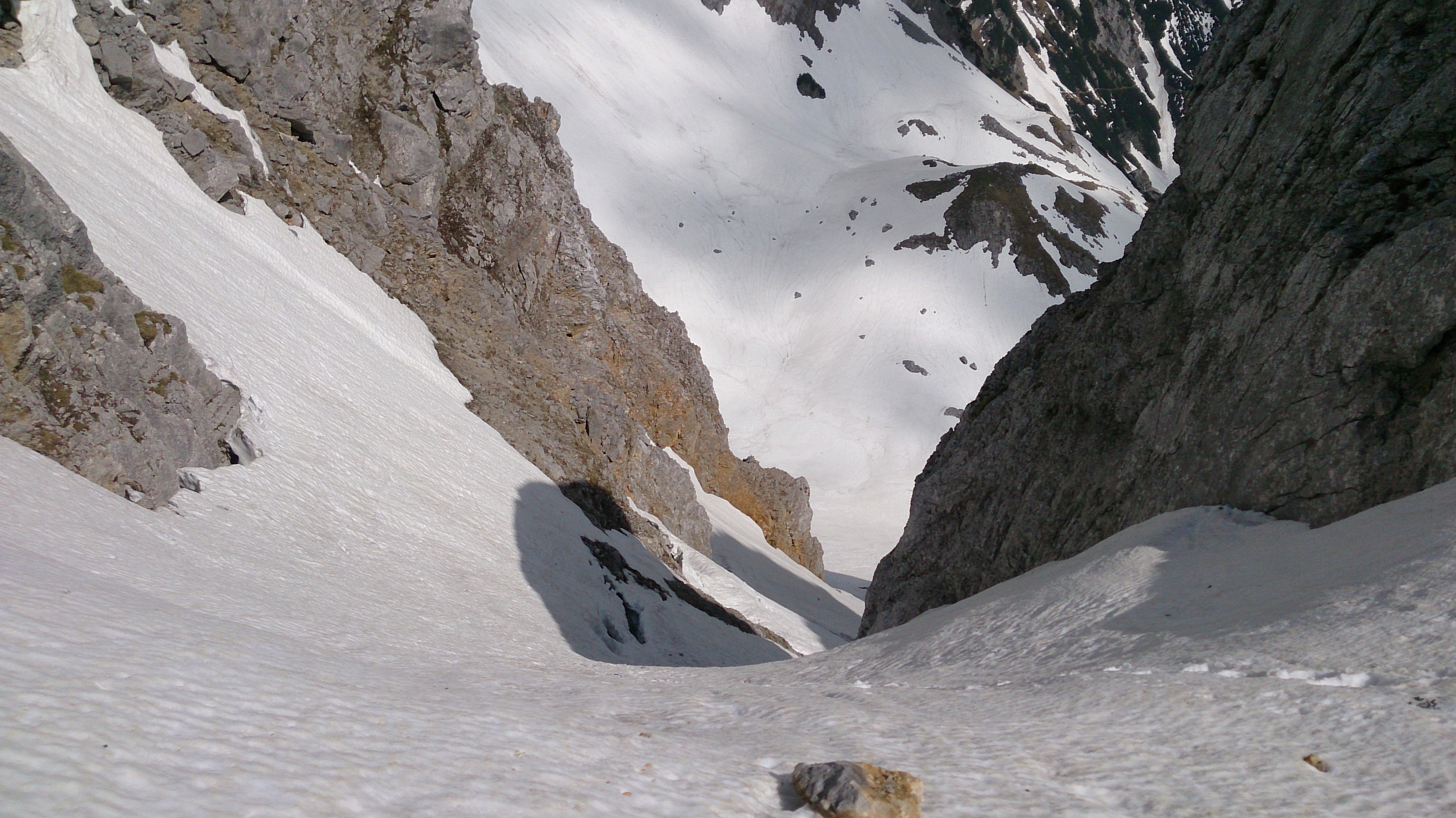 Prognose: bei den warmen Temperaturen kann man dem Schnee beim Schmelzen zuschauen - wer es noch machen will, sollte sich beeilen; unterhalb ca. 1.500 m wahrscheinlich rasch abnehmende Schneedecke; ansonsten mit Firngleitern, wobei die Rinne oben schon steil für Figl ist, wenn man diese mit Bergschuhen fahren sollte