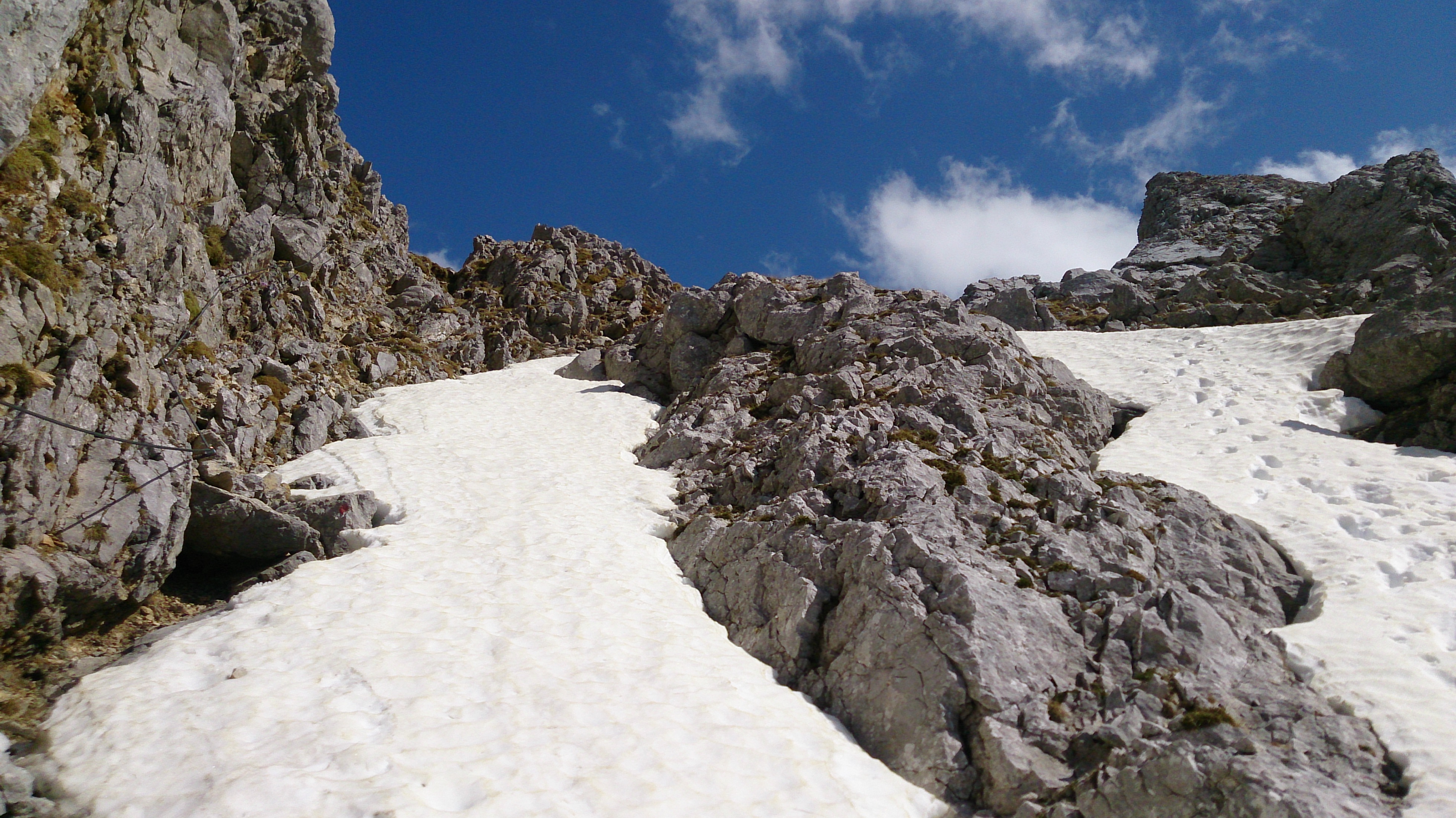 Blick vom Abfahrtsbeginn auf die ersten Meter Fußabstieg aus der Scharte (links am Drahtseil, rechts Stapfen - ginge evtl. auch mit Skiern zu fahren):