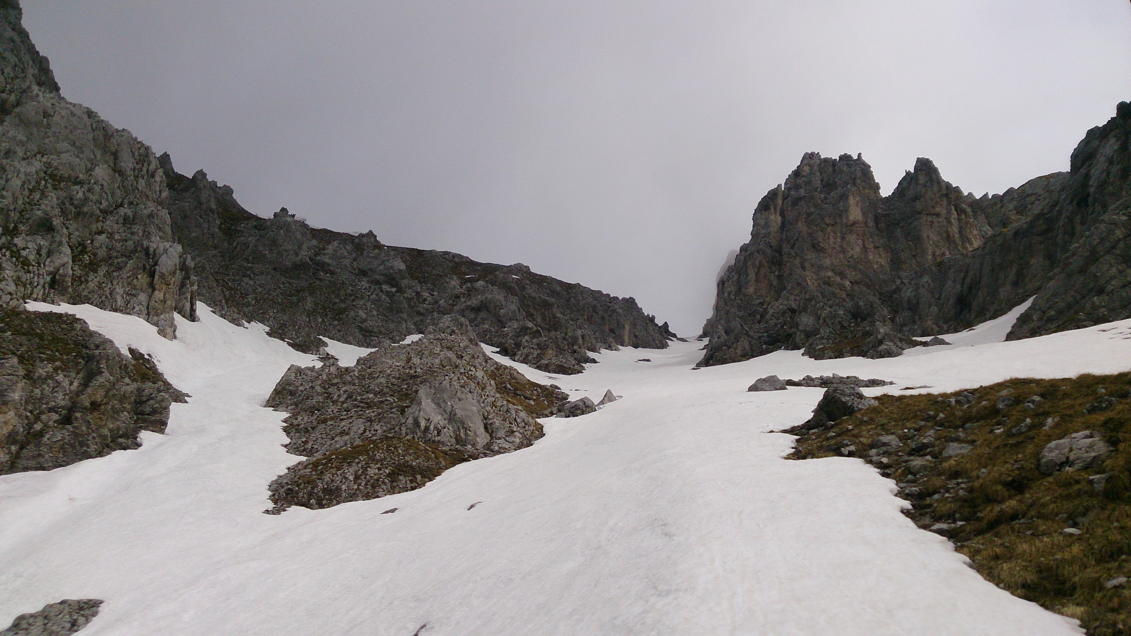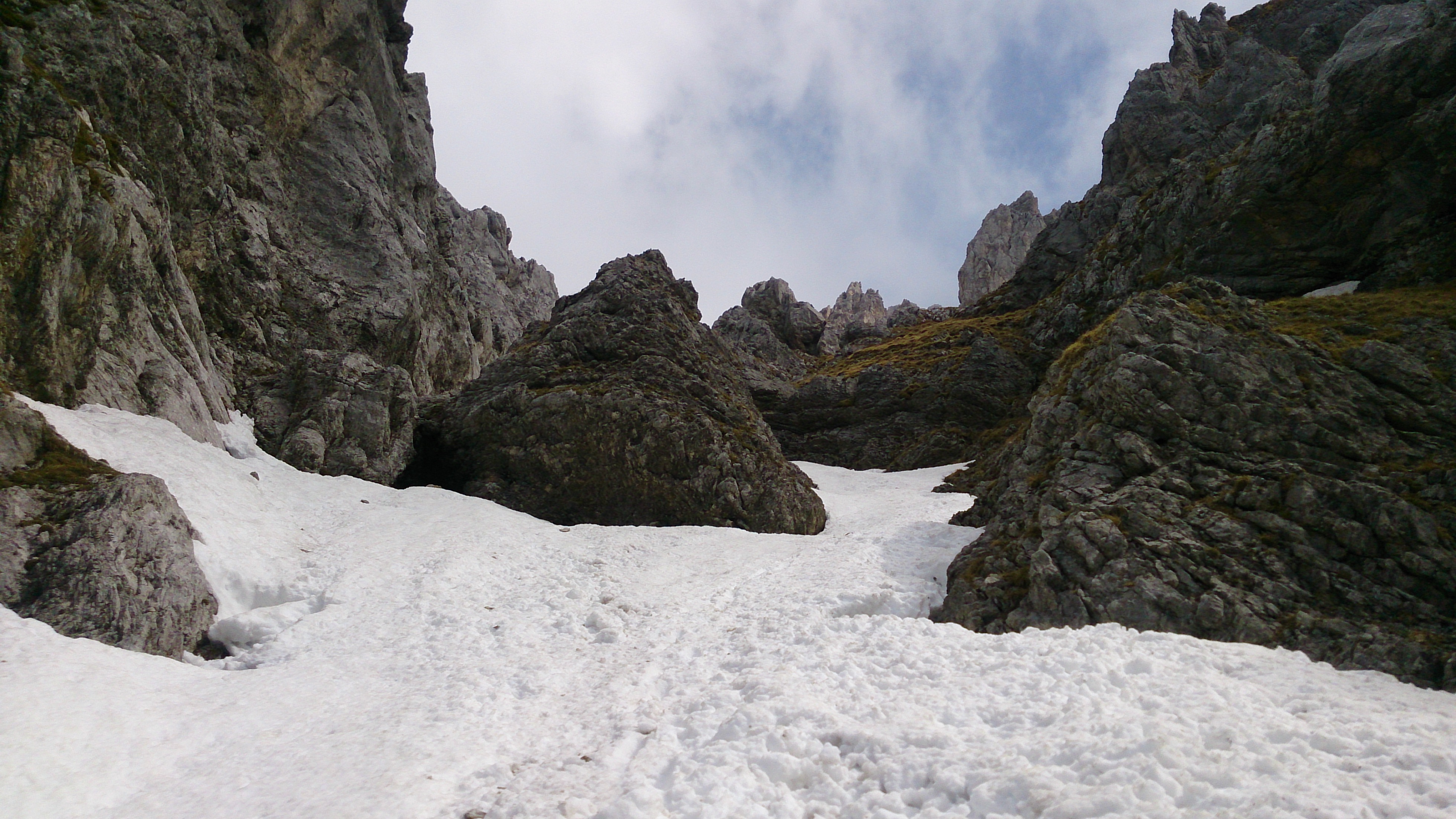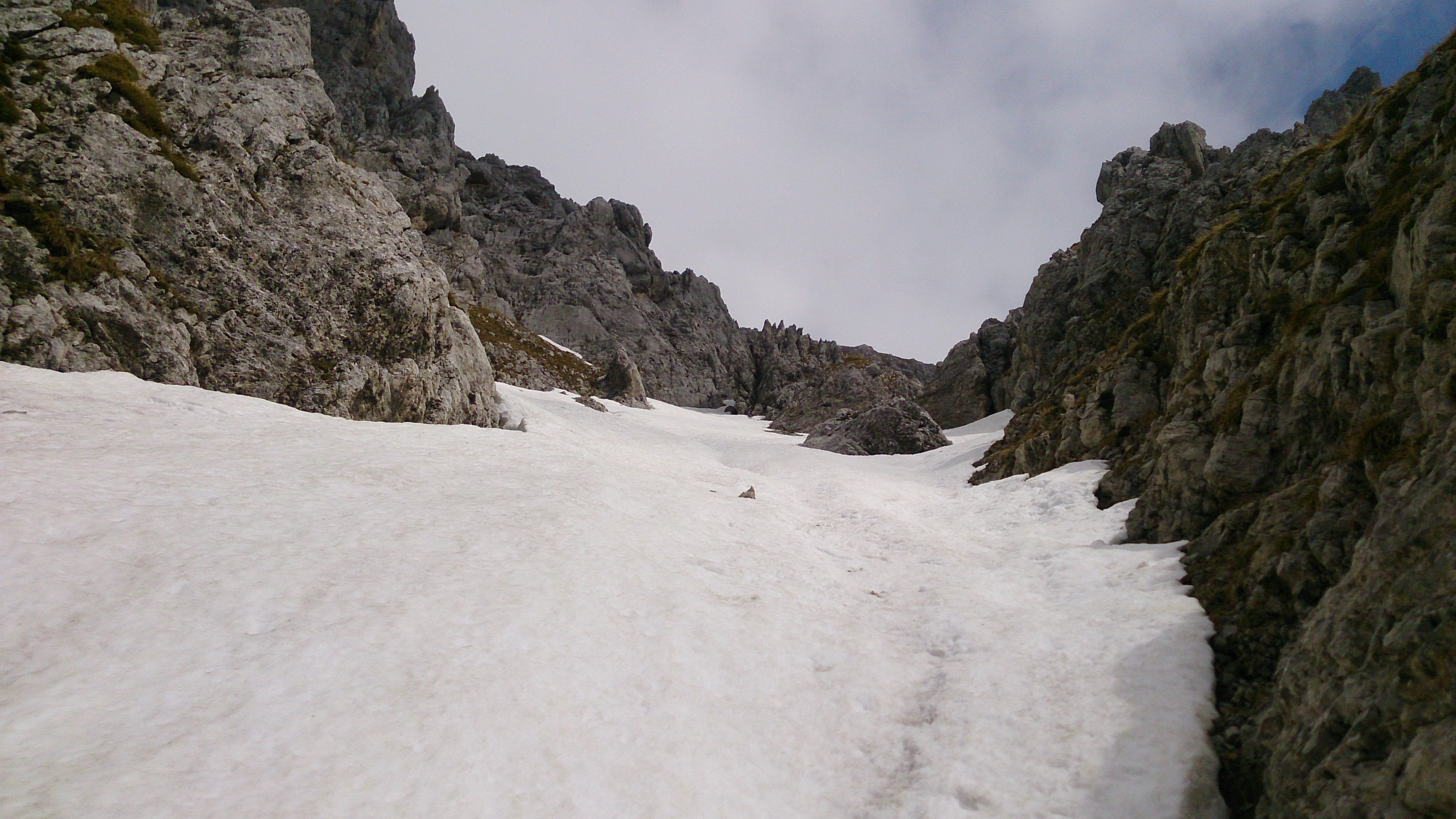 In der linken Rinne wird nur recht kurz aufgestiegen, bevor es wieder nach rechts geht (mit etwas kraxeln):