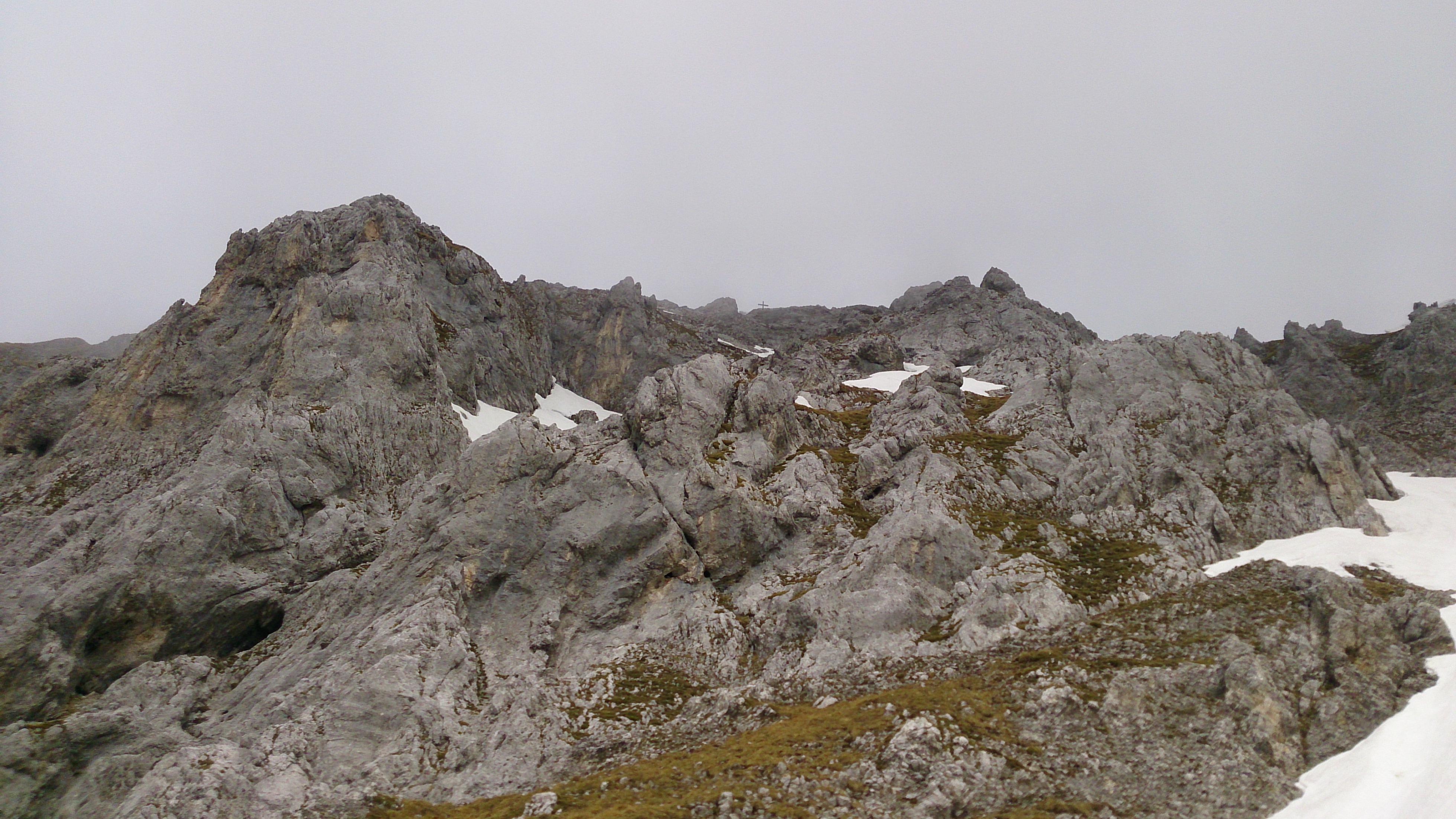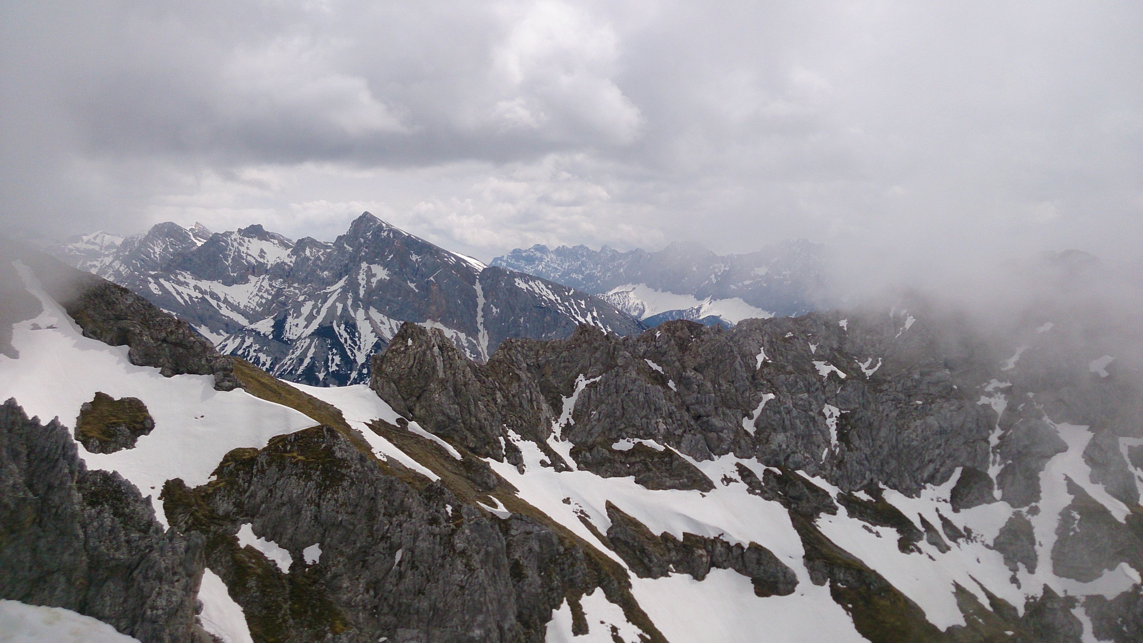 Kurze Aufhellung am Gipfel Richtung innerem Karwendel - vorne Teile des Noe-Steigs (noch unter Schnee und nicht zu empfehlen):