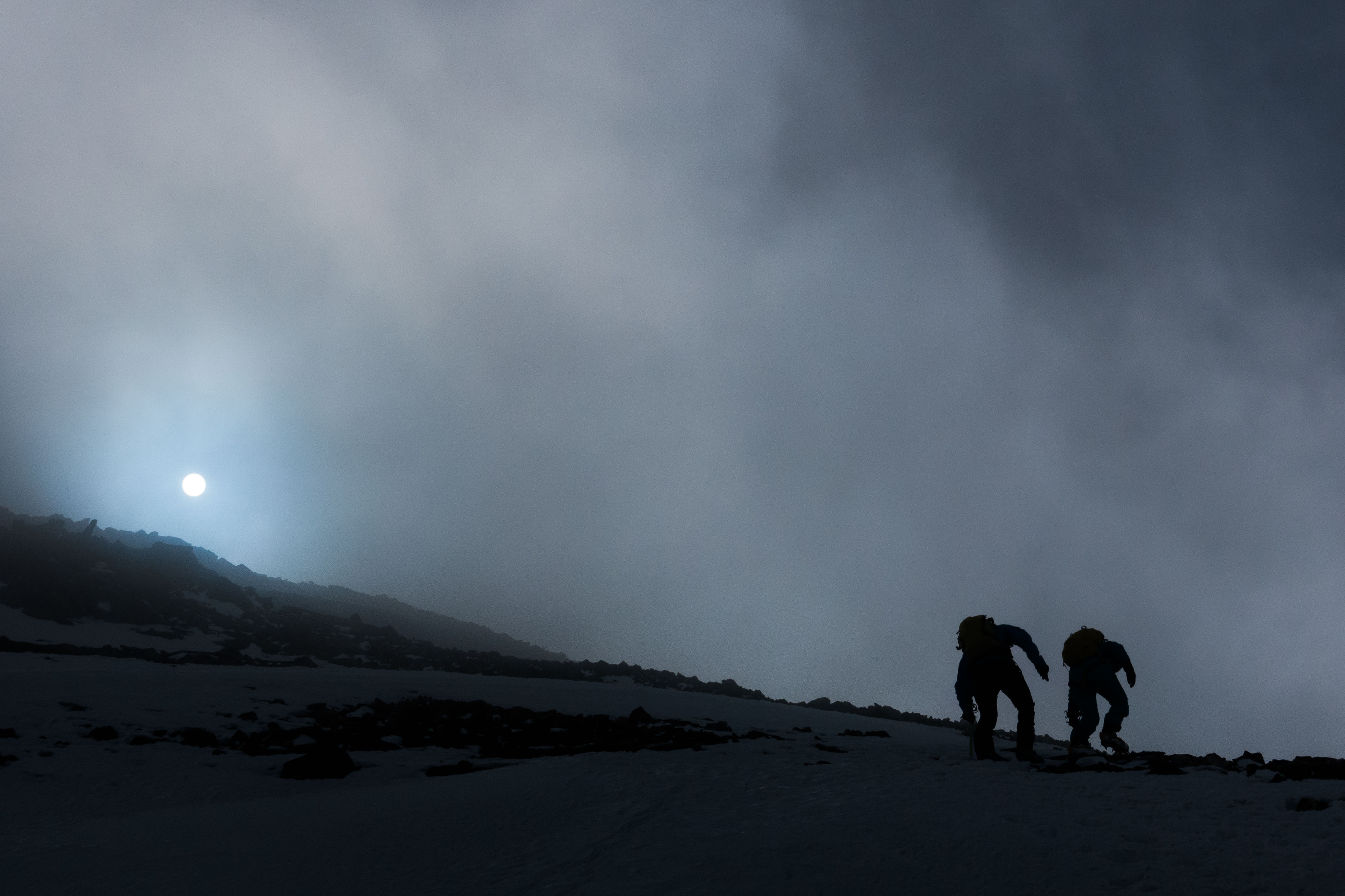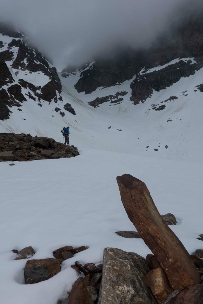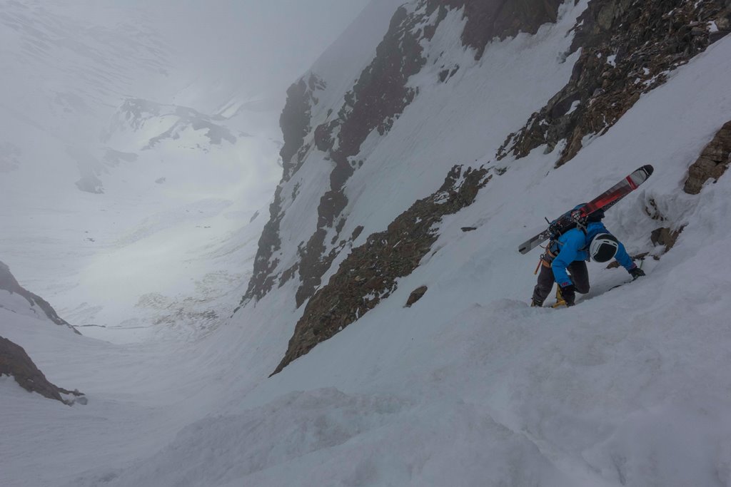 - Südcouloir: am Morgen nach Abkühlung in der Nacht hart gefroren; Lawinenkegel und Steine, daher für die Abfahrt nicht so geeignet