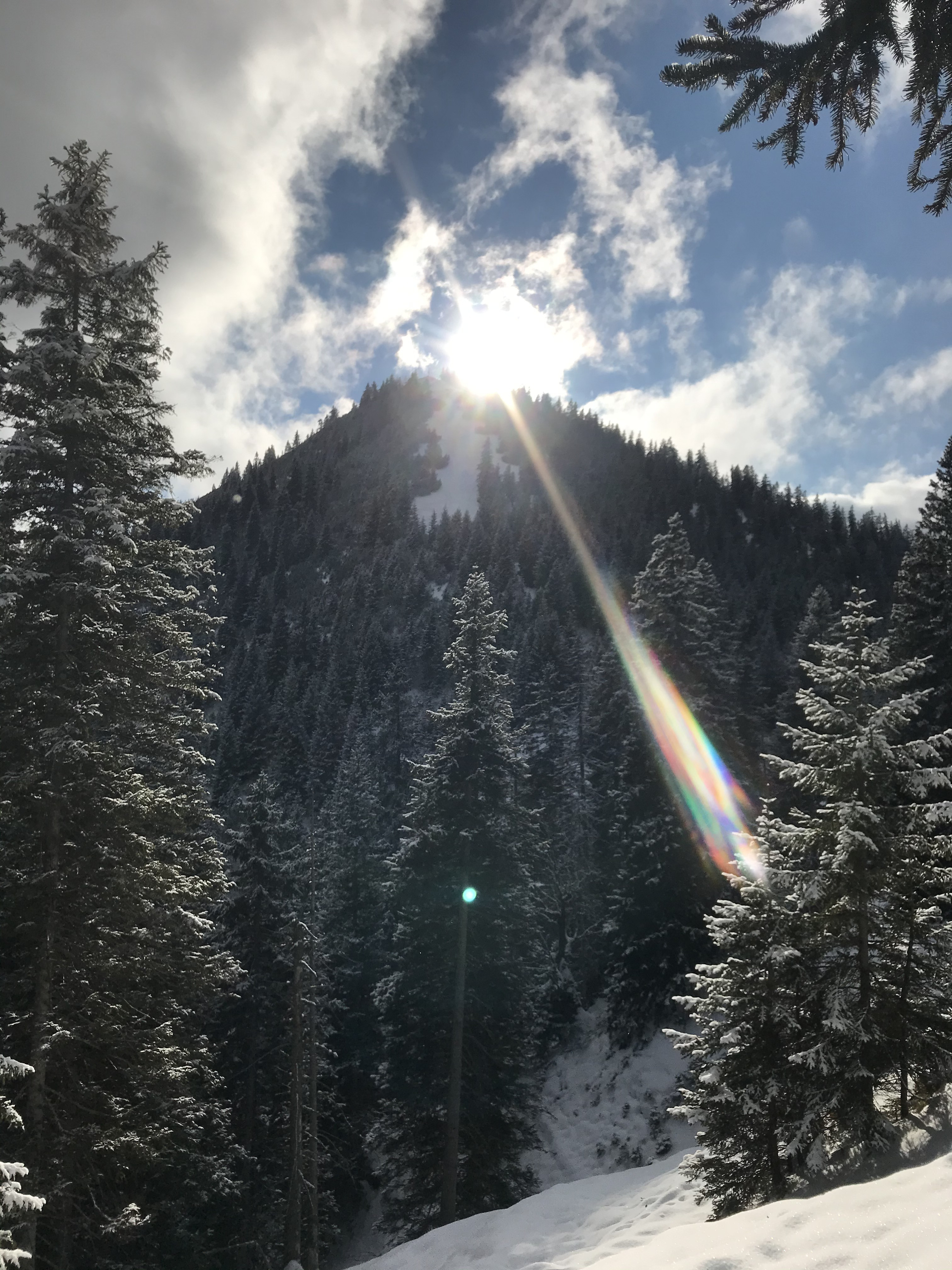 Tourenverhältnisse: Super schöne Wanderung zum Osterfeuerkopf dann den Grat Richtung Hirschberg. Dann nordseitig steil hinauf und über die Forststrasse wieder zum Parkplatz kurz vor dem Eschenlainetal. Heute dank Neuschnee einfach nur schön, insgesamt 17 km und 1100 hm