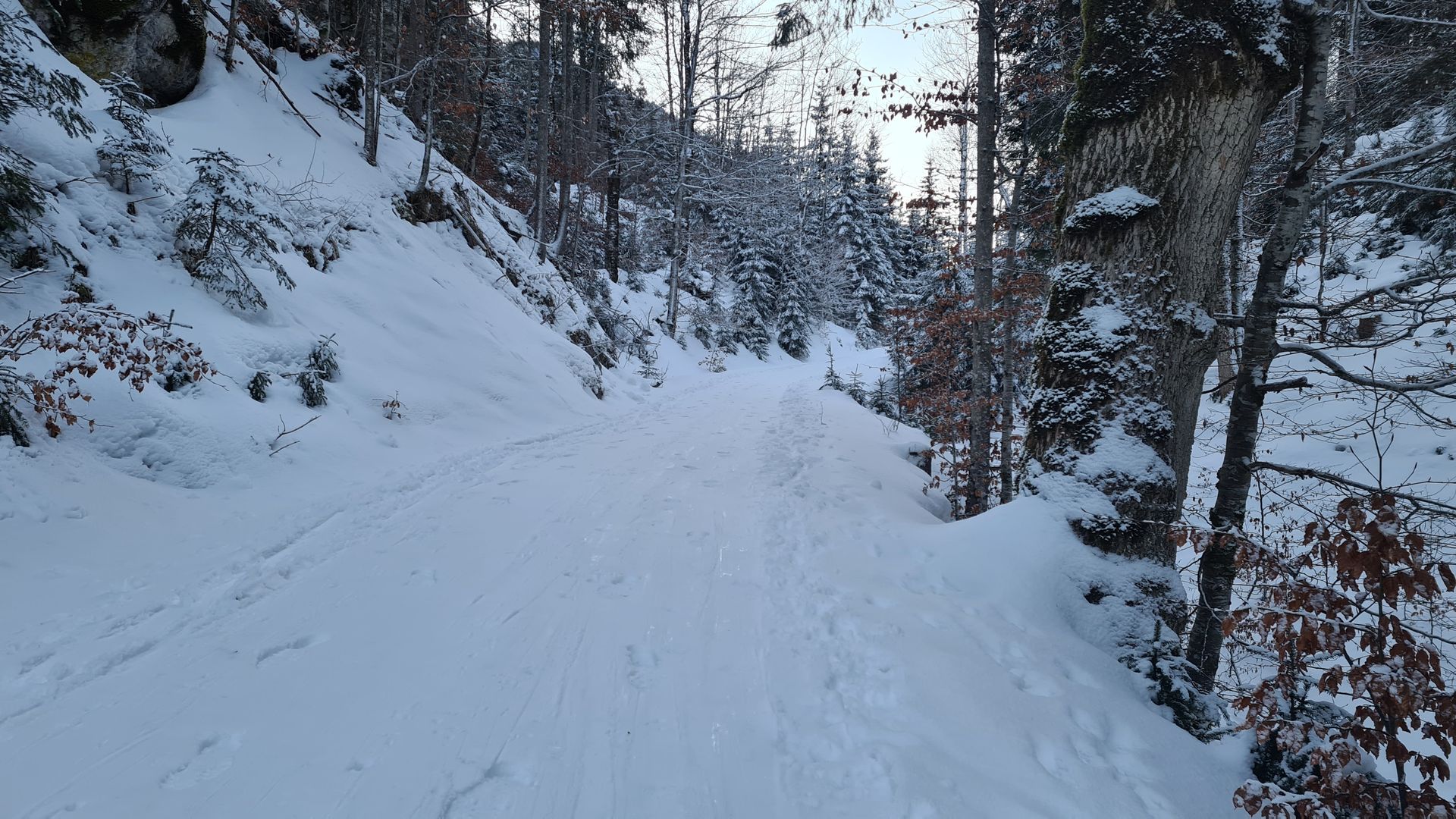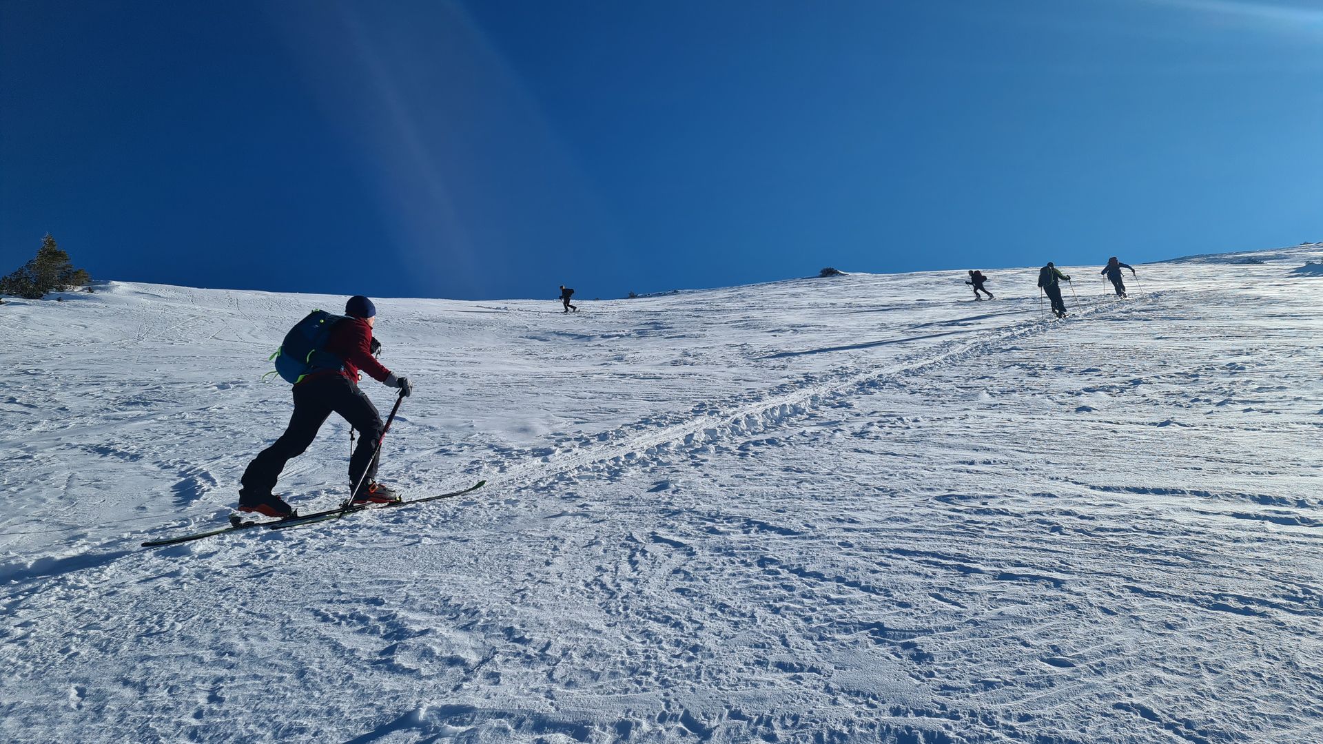 Vor 8:30 Uhr gestartet, so dass der Aufstieg über die gerade erst geöffnete und damit anfangs leere Piste ganz angenehm war. Guter, griffiger Schnee auf den 500 Höhenmetern Pistenanstieg. Auch die steileren Abschnitte konnte man problemlos aufsteigen.