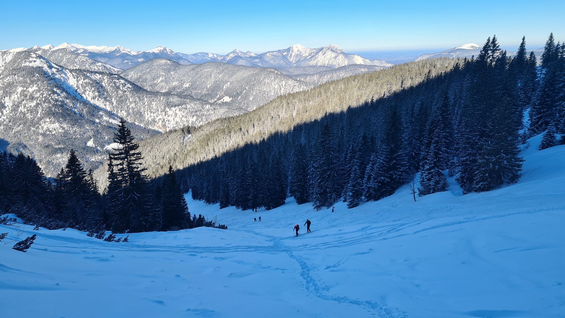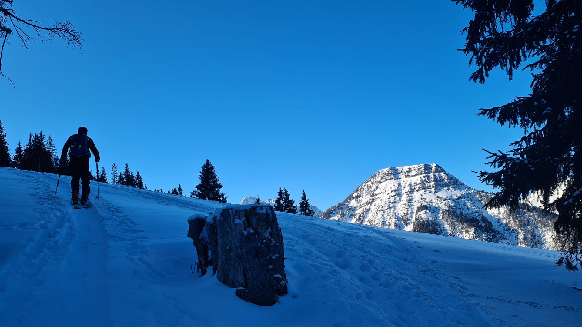 Unter der Lamarkalm auf 1960 m geht es dann aber endlich rechts ab ins Gelände. Im unteren flacheren Teil war der Schnee im Aufstieg sehr hart, ab ca. 2100 m im steileren Osthang dann trockener, leicht windverpresster Pulver ohne irgendwelche Schollenbildung.