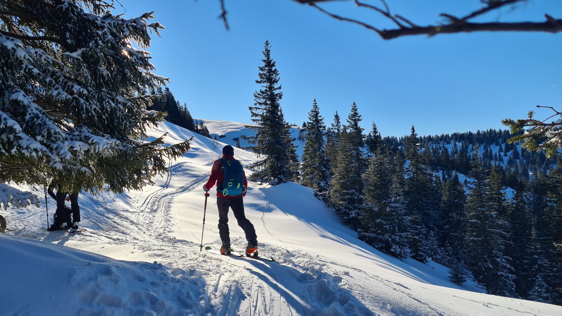 Die zweite Abfahrt bei schönstem Sonnenschein im zwar schon ein wenig zerfahrenem, aber bestens fahrbarem Presspulver. Das untere flache Stück bis zur Skipiste, das am Morgen noch sehr hart war, war inzwischen etwas aufgeweicht und auch sehr gut zu fahren. Die Piste sehr guter, griffiger Schnee, aber halt viele Leute. Wir haben uns ein paar Mal rechts in den Wald begeben, war auch lustig und gut zu fahren.