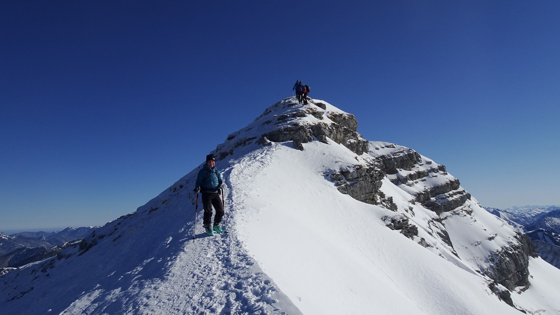 Am Sattel auf 2280 m wehte ein ziemlich starker Wind und die Sonne wollte sich noch nicht wirklich zeigen. Die Strecke über den Grat Richtung Gilfert war bretthart, entsprechend abgeweht und präsentierte beeindruckende Wechten. Ab ca. 2400 m heißt es Ski tragen, da mehr Gras und Fels als Schnee.