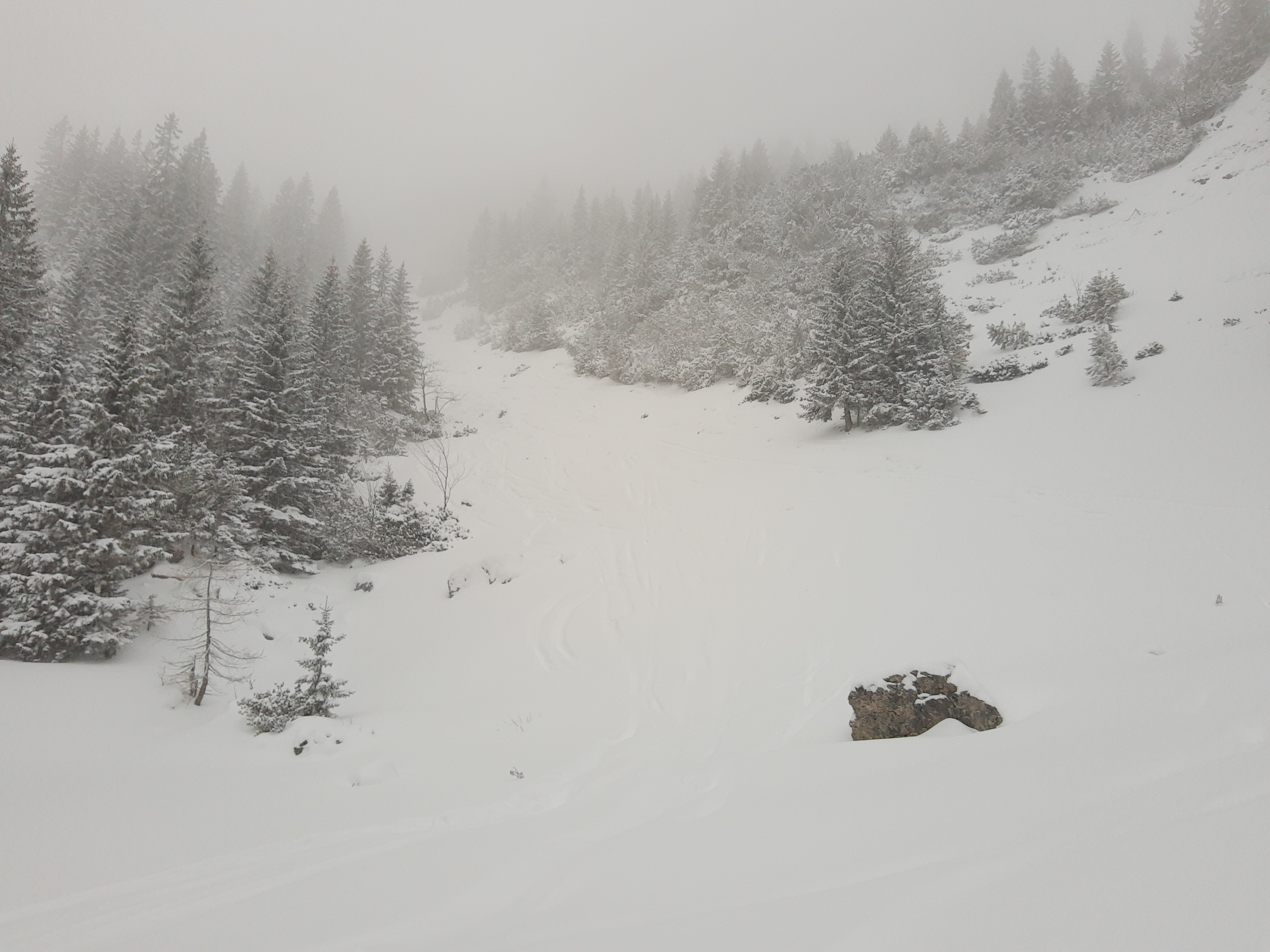 Tourenverhältnisse: Neuschnee, Pulver, viel Steinkontakt wegen fehlender Unterlage